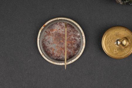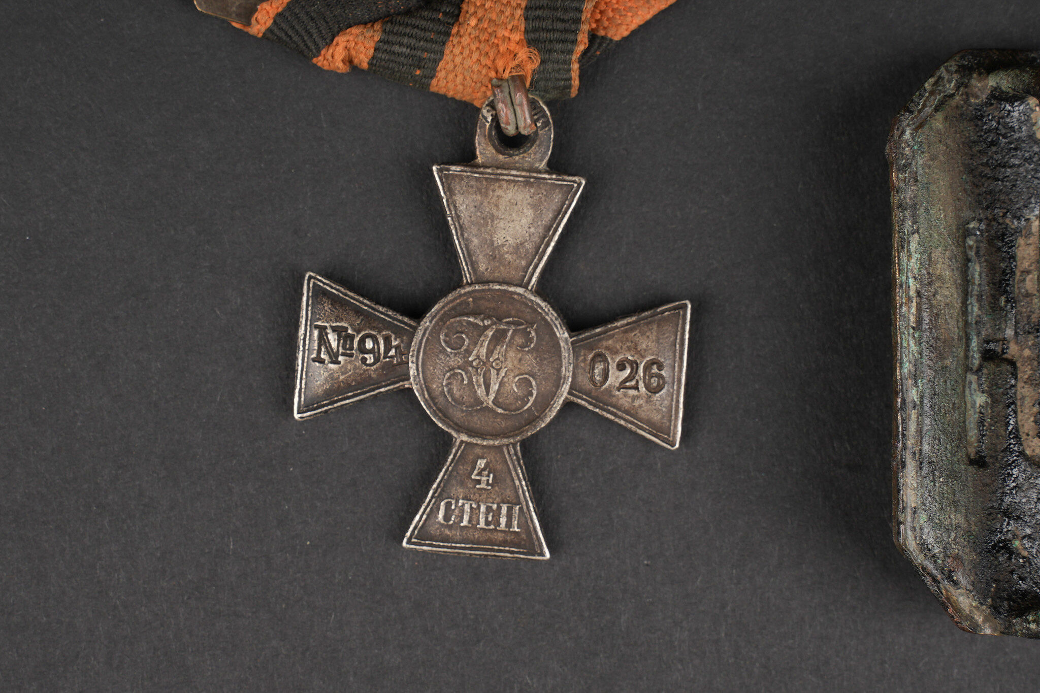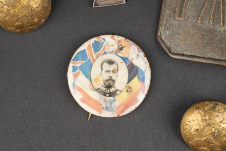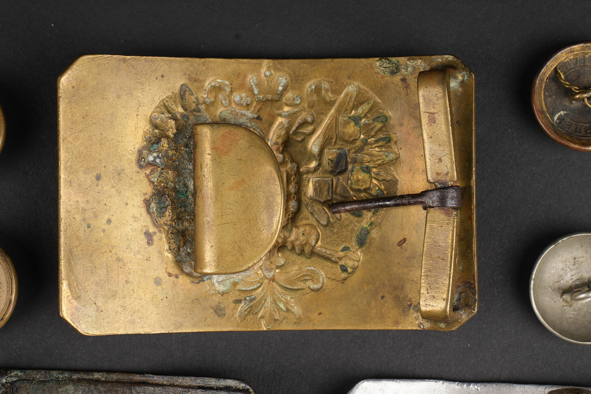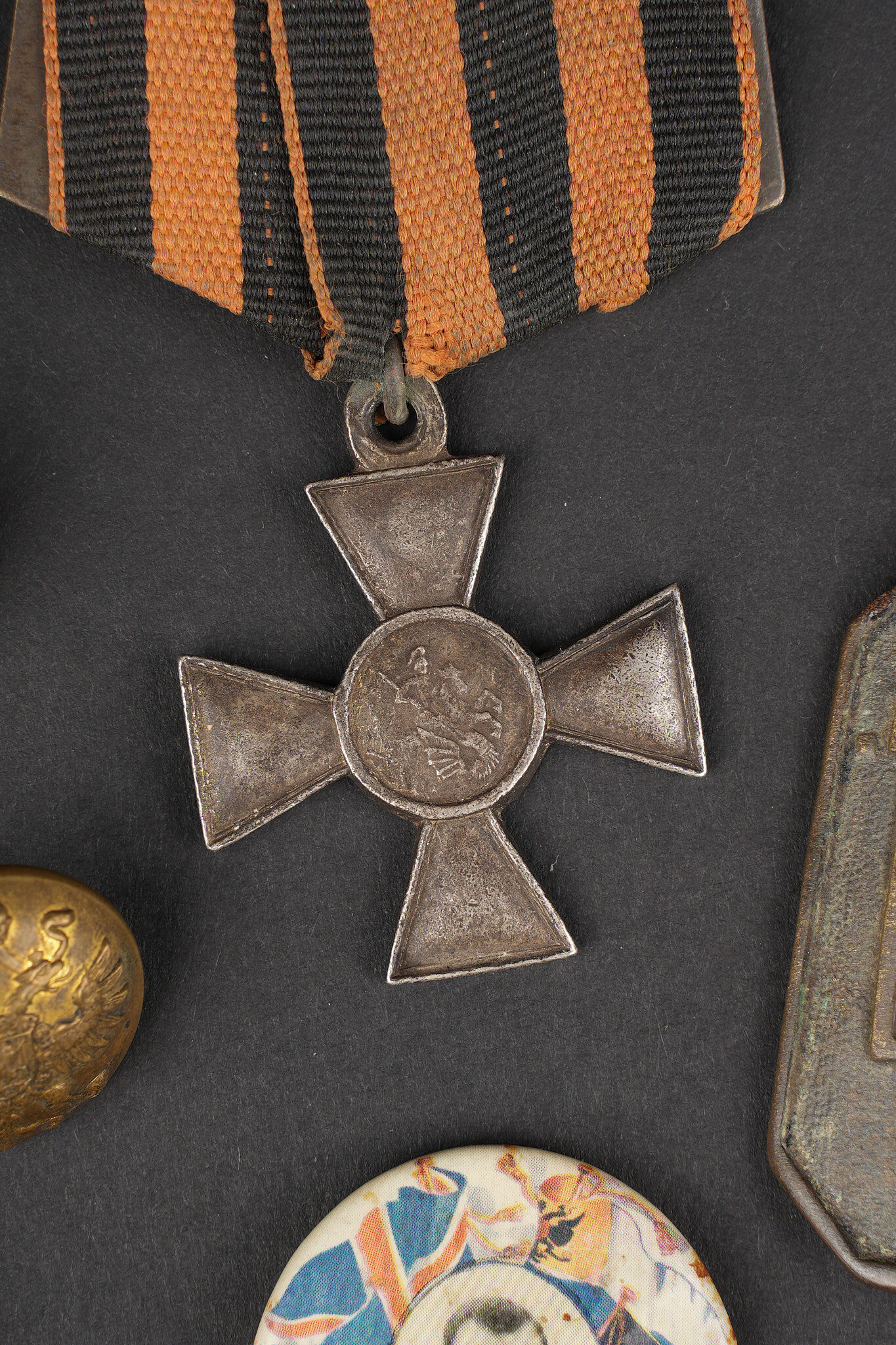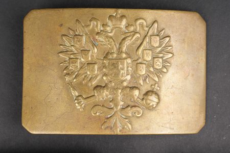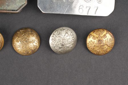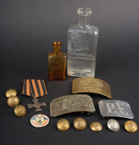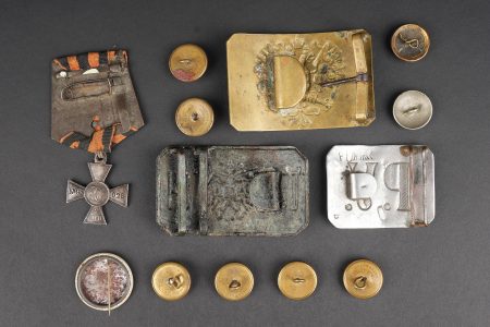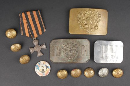 Russie impériale Croix de St Georges, boucles de ceinturon et boutons. Croix de St Georges, usure importante. Boucle russe laiton, boucle des chemins de fer, et boucle blanche de cadet ou entrainement. Authenticité non garantie. On joint une épingle à l’effigie de Nicolas II, des boutons, et 2 flacons en verre de pharmacie. Usure d’usage. Imperial Russian Cross of Saint George with belt buckles and buttons, including a heavily worn Saint George cross, one brass Russian buckle, one railway buckle and one white cadet or training buckle. Authenticity is not guaranteed. Included are also a pin bearing the likeness of Nicholas II, several buttons and two pharmacy glass bottles, all showing general wear.