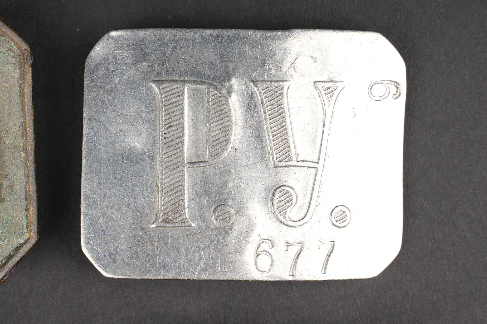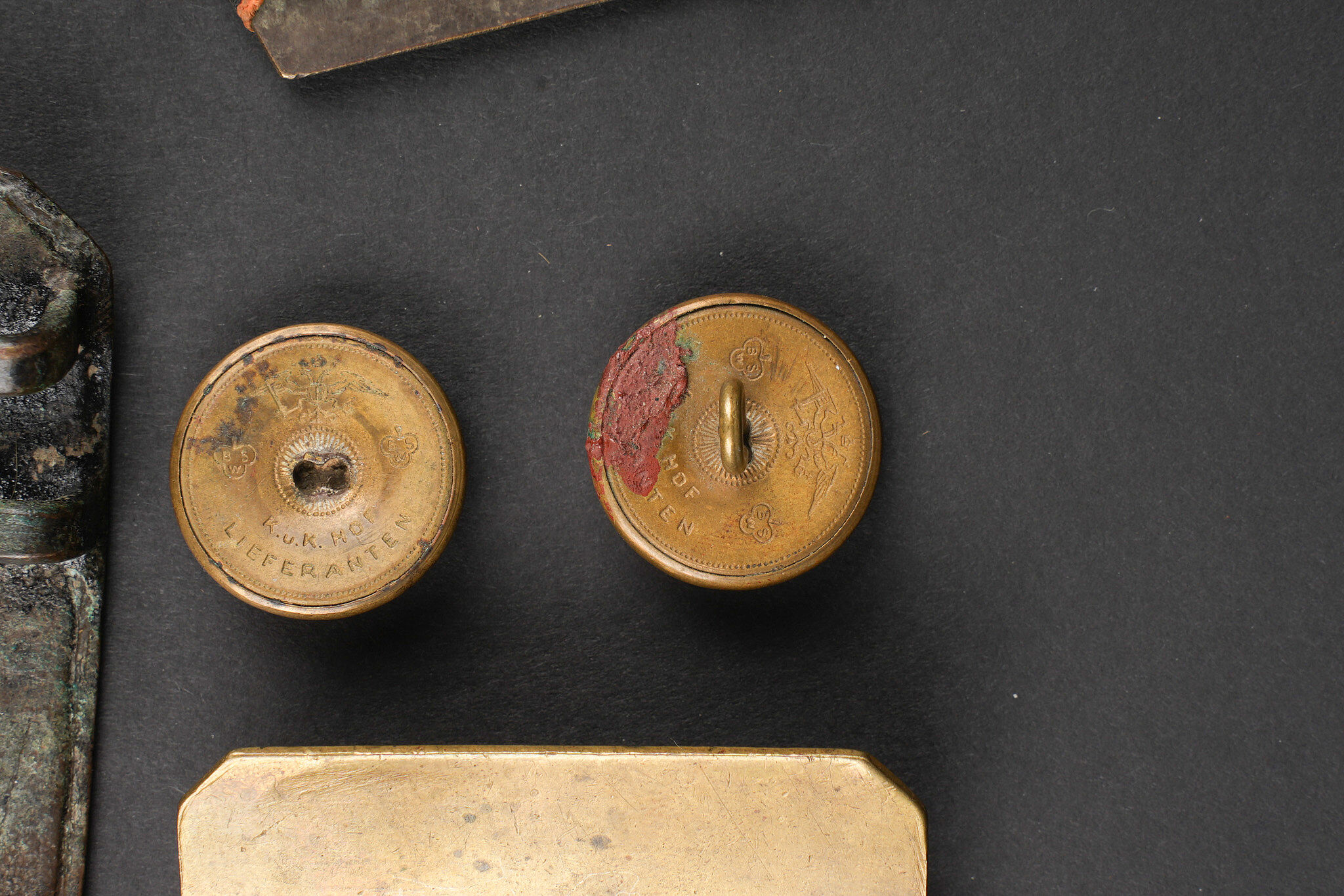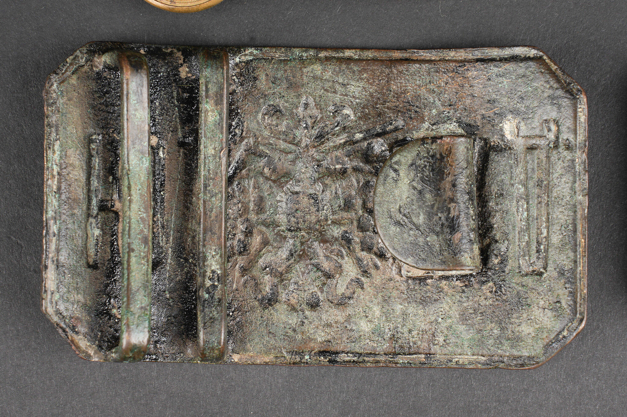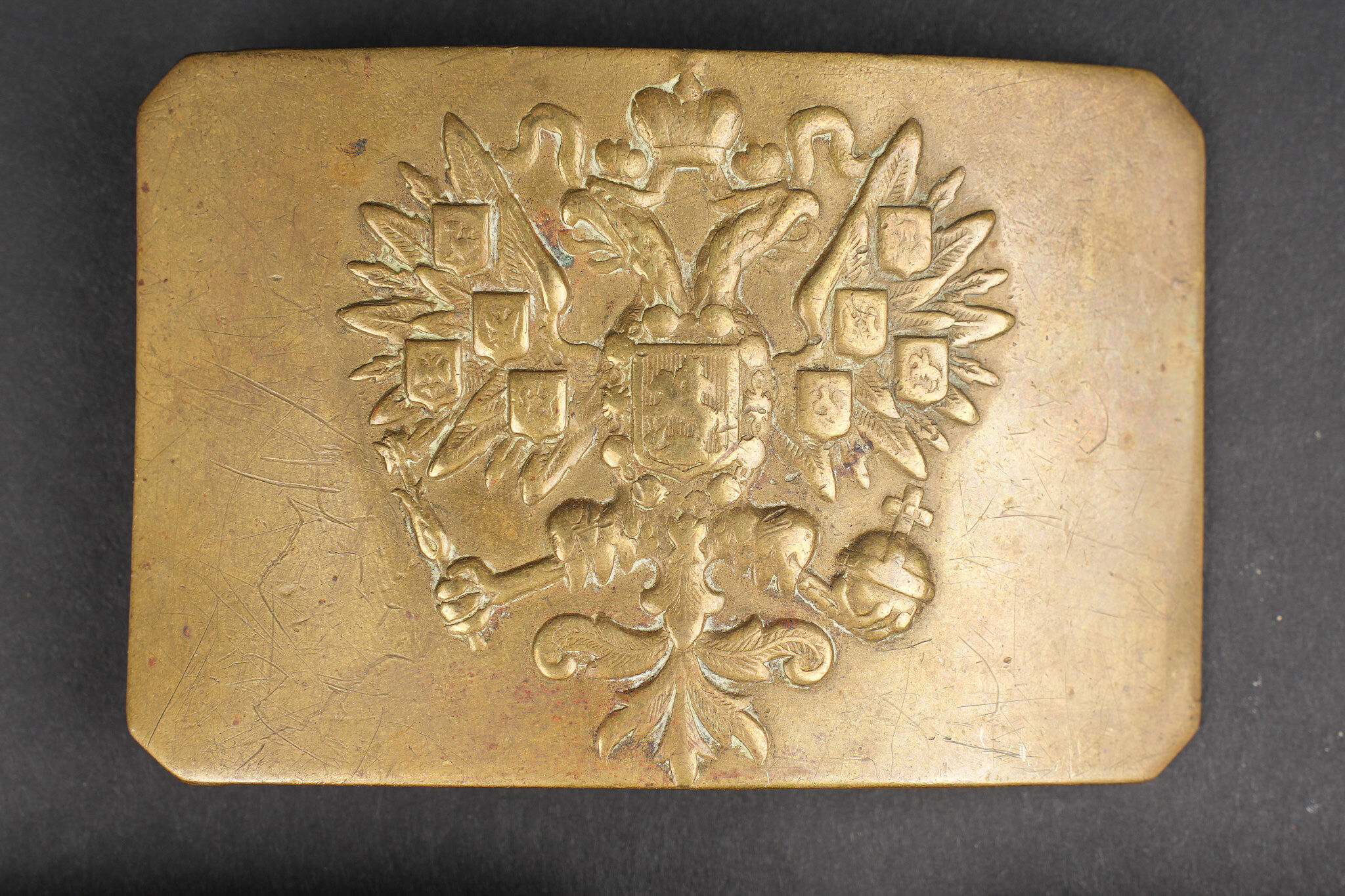 Russie impériale Croix de St Georges, boucles de ceinturon et boutons. Croix de St Georges, usure importante. Boucle russe laiton, boucle des chemins de fer, et boucle blanche de cadet ou entrainement. Authenticité non garantie. On joint une épingle à l’effigie de Nicolas II, des boutons, et 2 flacons en verre de pharmacie. Usure d’usage. Imperial Russian Cross of Saint George with belt buckles and buttons, including a heavily worn Saint George cross, one brass Russian buckle, one railway buckle and one white cadet or training buckle. Authenticity is not guaranteed. Included are also a pin bearing the likeness of Nicholas II, several buttons and two pharmacy glass bottles, all showing general wear.