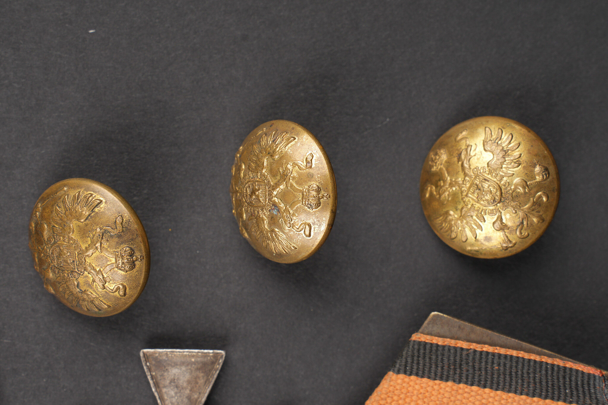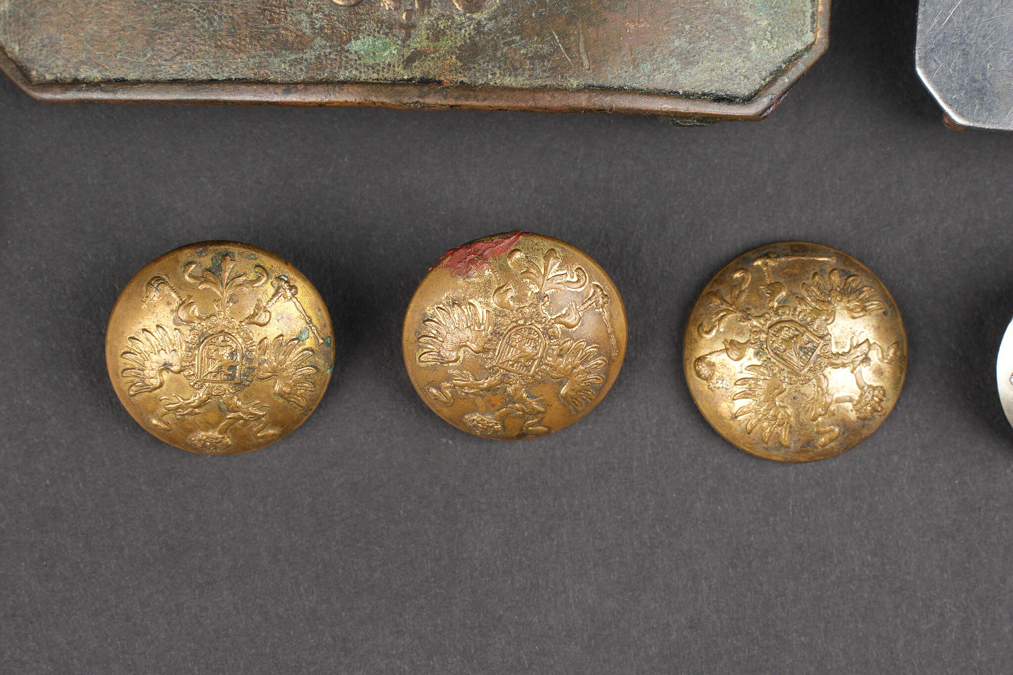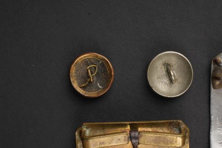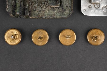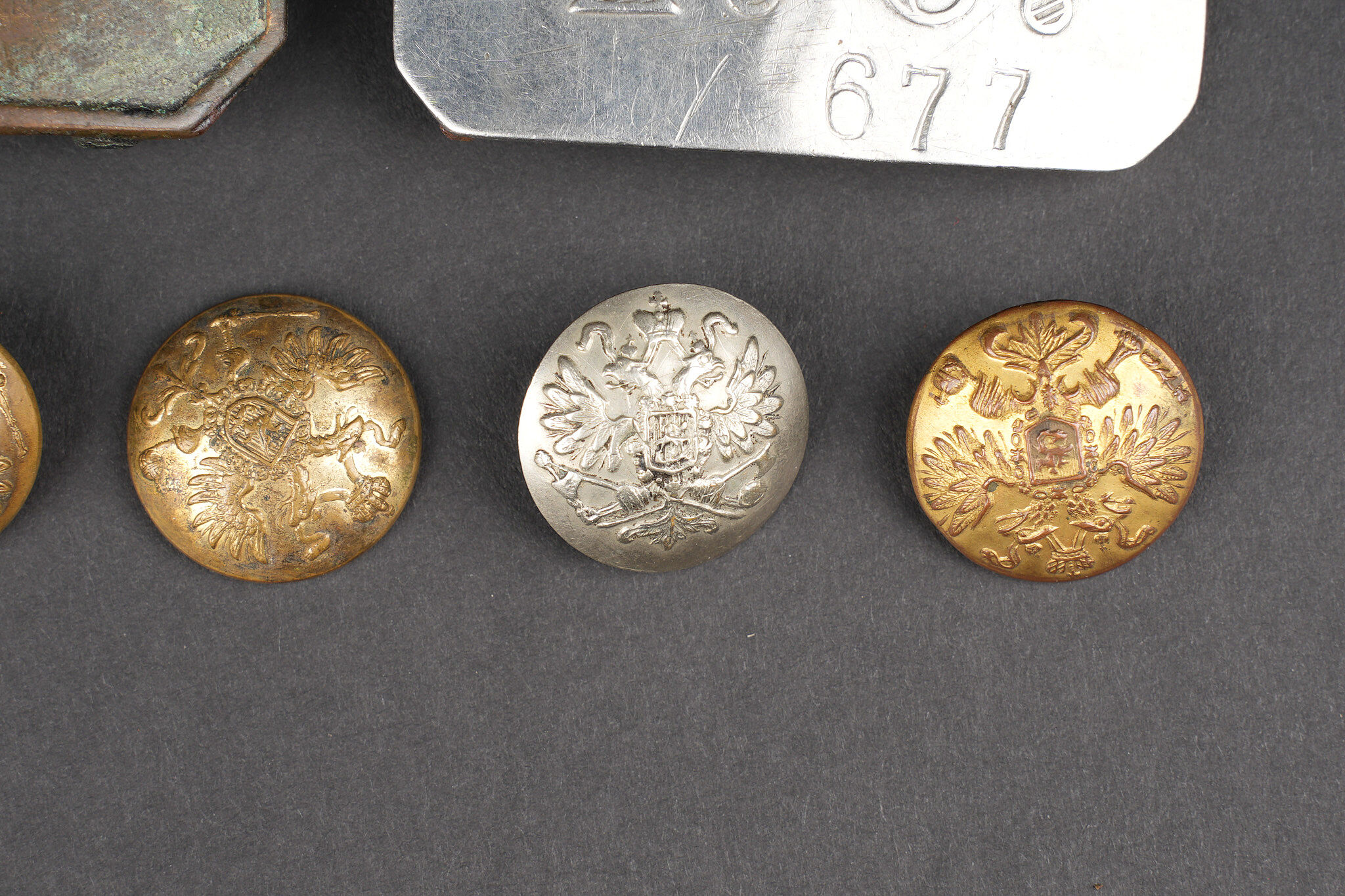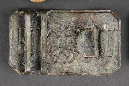 Russie impériale Croix de St Georges, boucles de ceinturon et boutons. Croix de St Georges, usure importante. Boucle russe laiton, boucle des chemins de fer, et boucle blanche de cadet ou... en savoir plus
