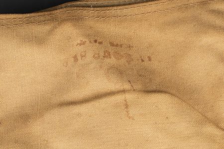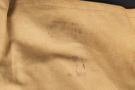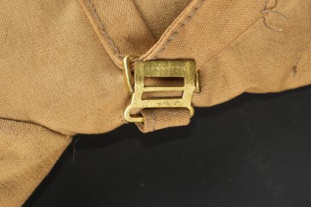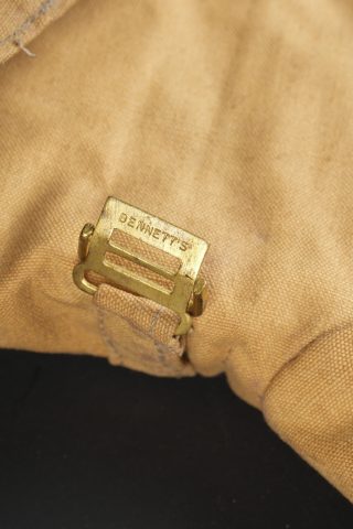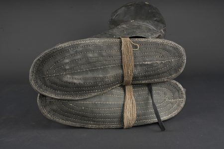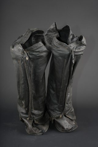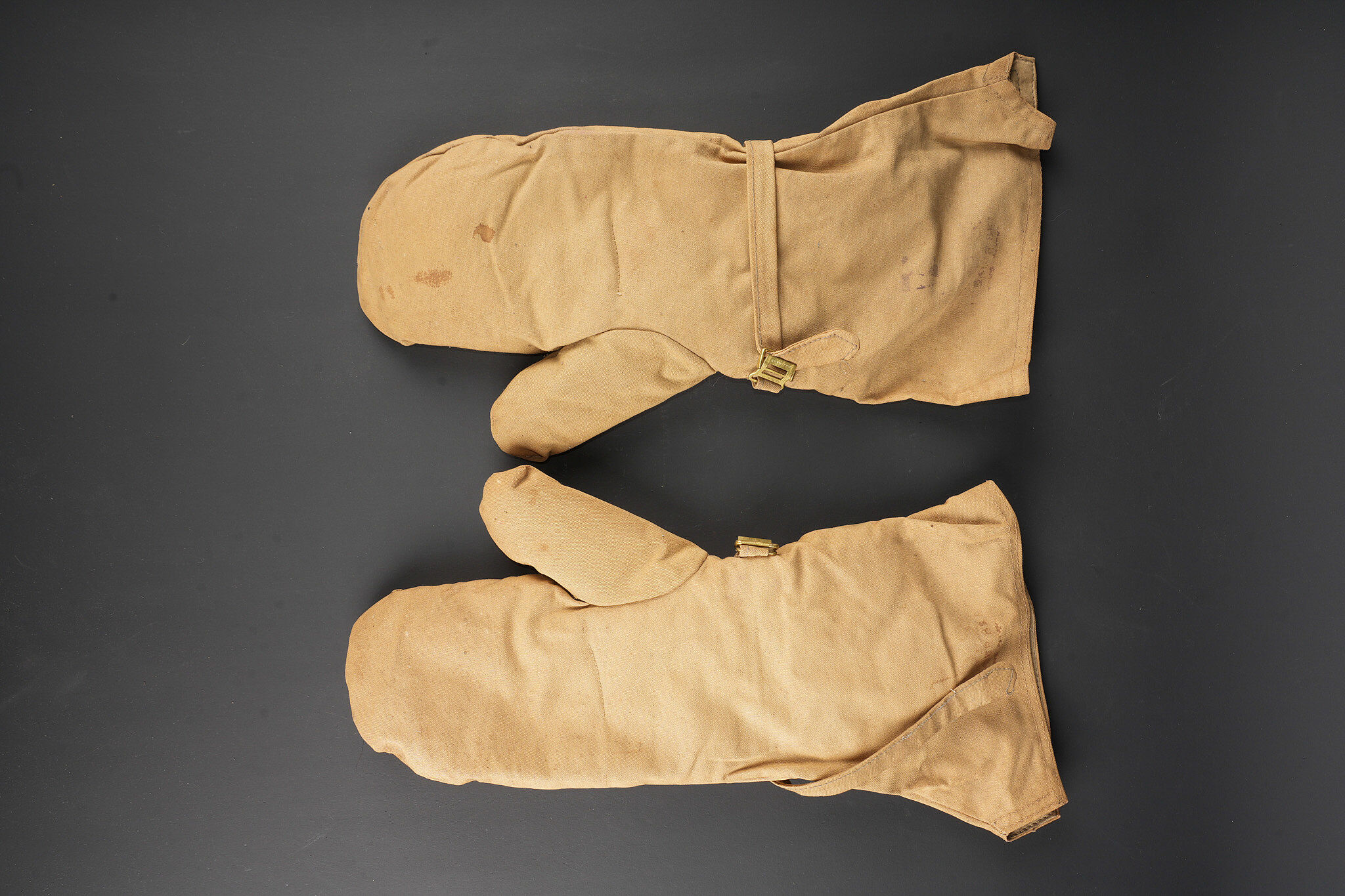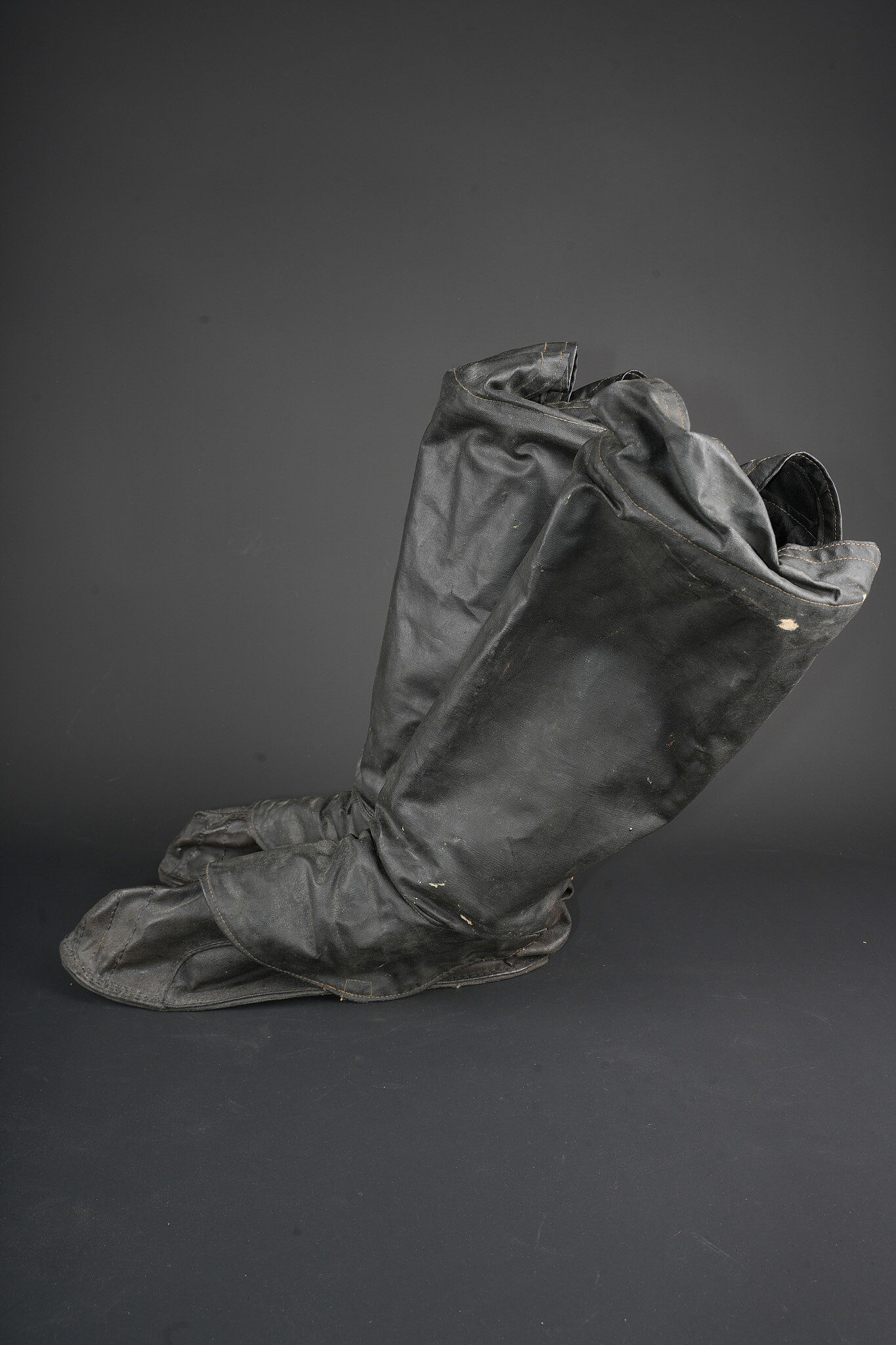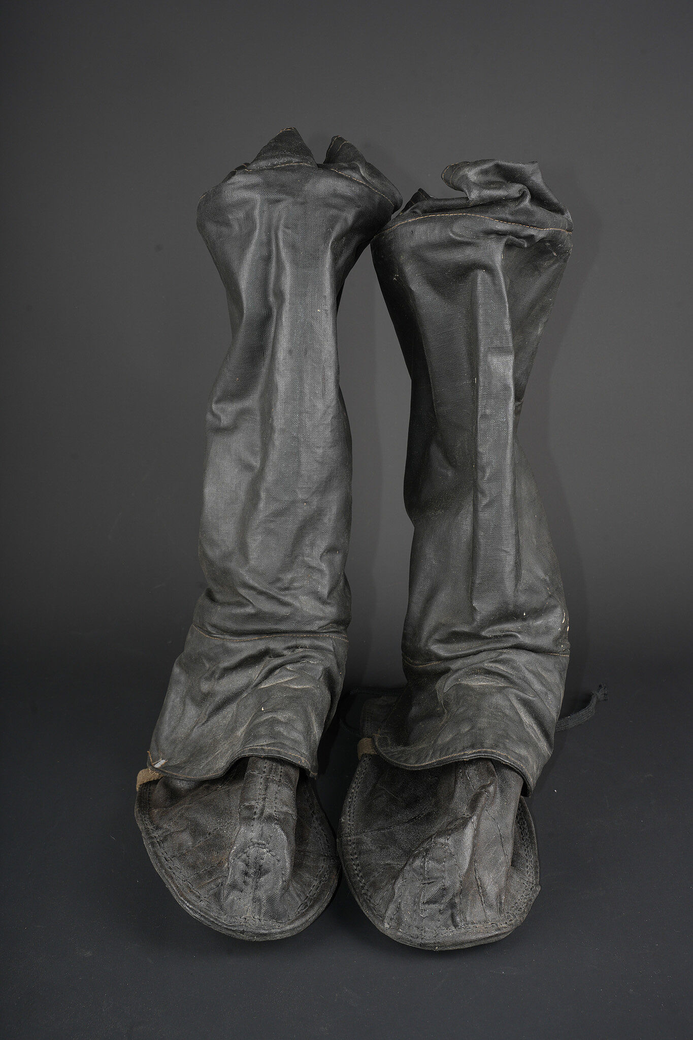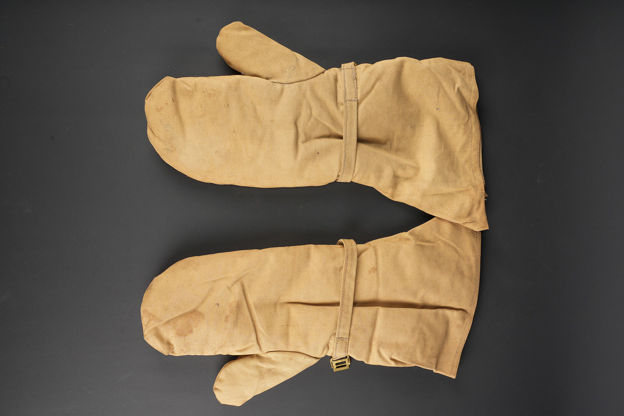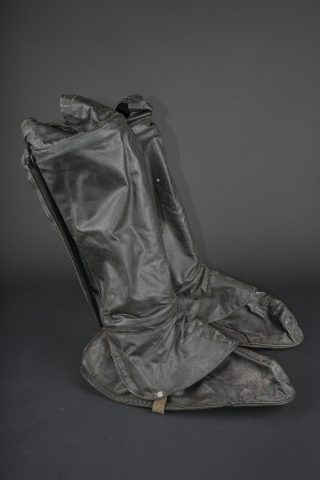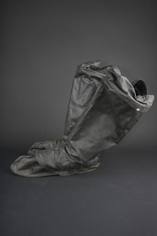 Paire de moufles, sur-chaussures et guêtres en toile cirée. Paire de moufles en toile beige, avec sanglon de serrage, boucle marquée Bennett’s, restes de tampons à l’encre à déchiffrer, on lit le mot Patent. Probablement anglo-saxon. Une paire de sur-chaussures et guêtres indépendantes, en toile cirée noire, surpiquée. Période, nationalité et usage à déterminer. Idéal pour un mannequin de pilote. Pair of mittens, overshoes and gaiters in oilcloth including beige canvas mittens with tightening strap and buckle marked Bennett’s, with traces of ink stamps where the word Patent can still be read, probably Anglo-Saxon manufacture. Also included is one pair of separate black oilcloth overshoes and gaiters with stitched finish, period, nationality and exact use undetermined. Suitable for display on an aviator mannequin.
