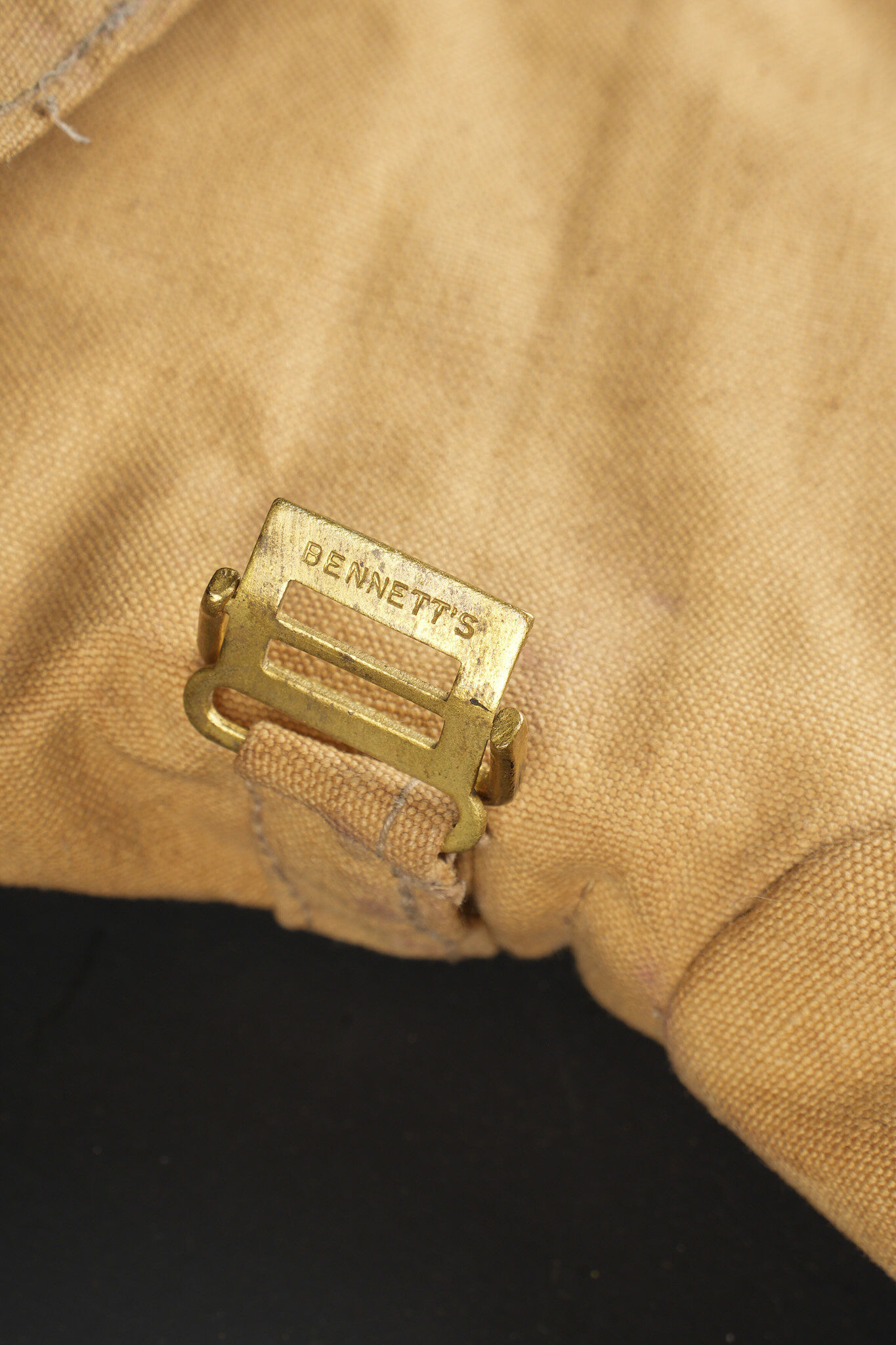Détails de la vente >Paire de moufles, sur-chaussures et guêtres en toile cirée. Paire de moufles en toile beige, avec sanglon de serrage, boucle marquée Bennett’s, restes de tampons à l’encre à... en savoir plus