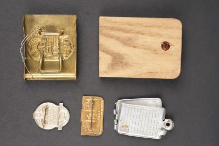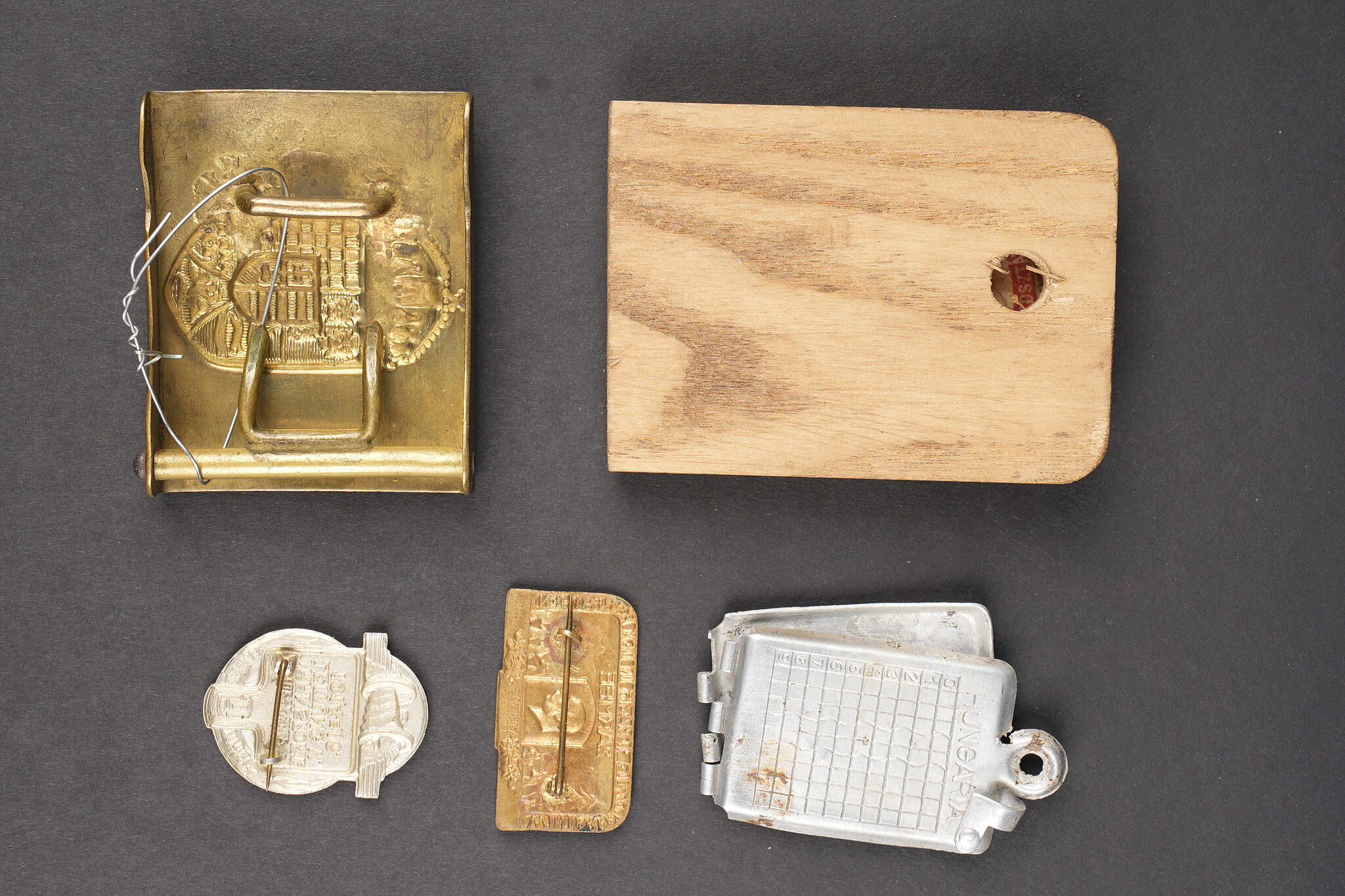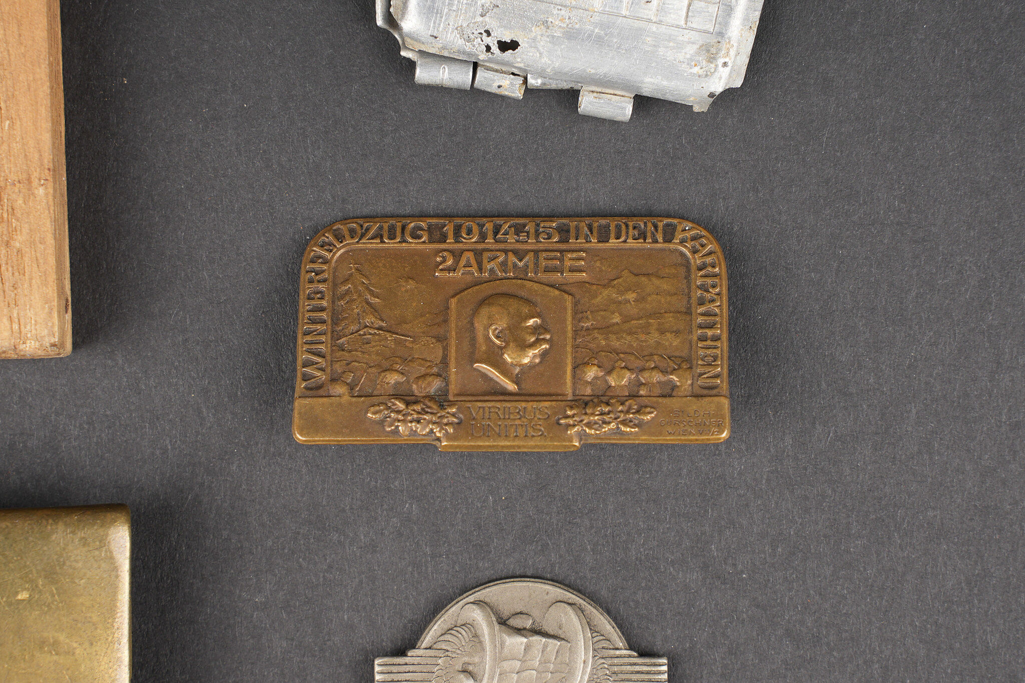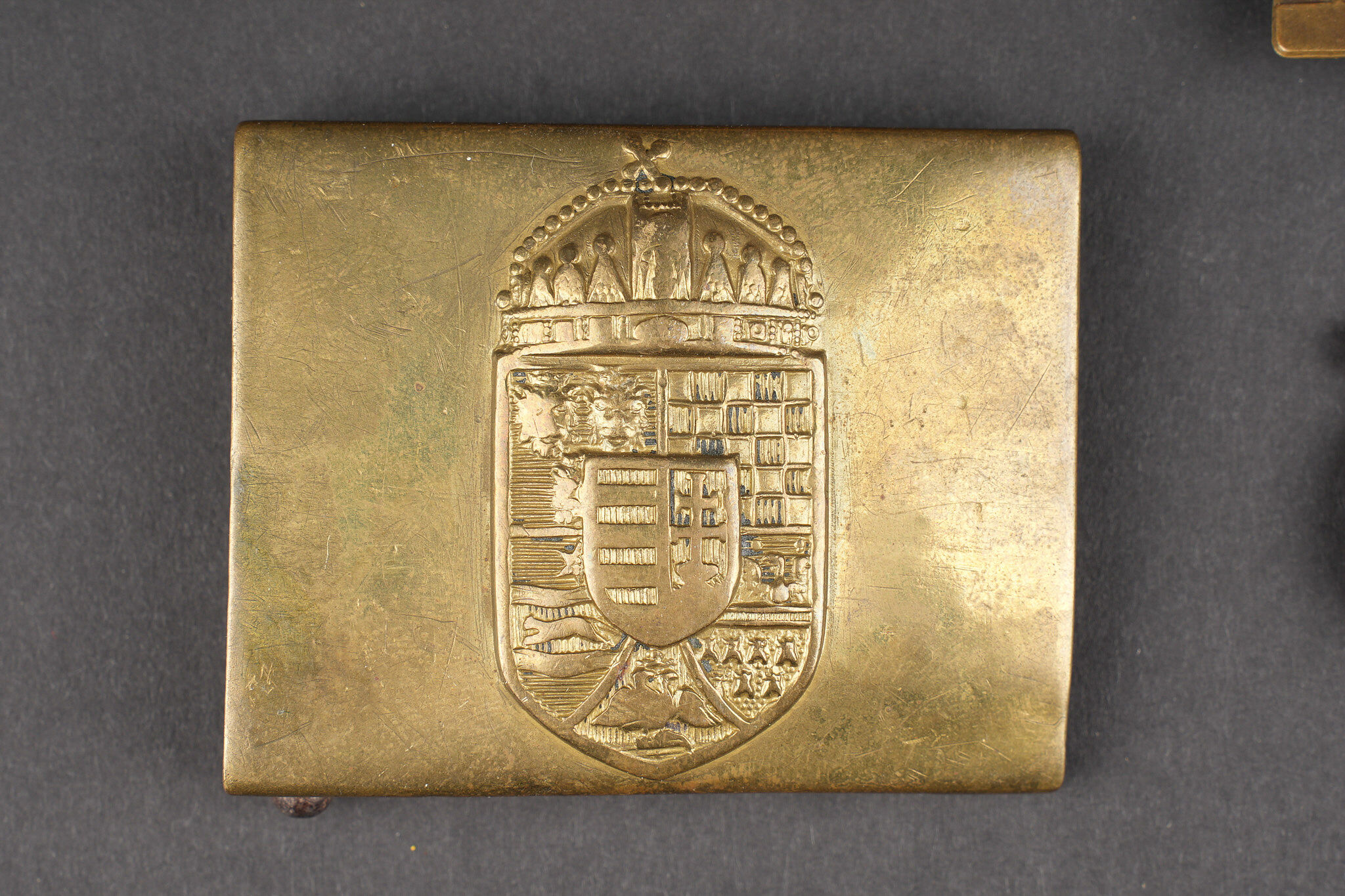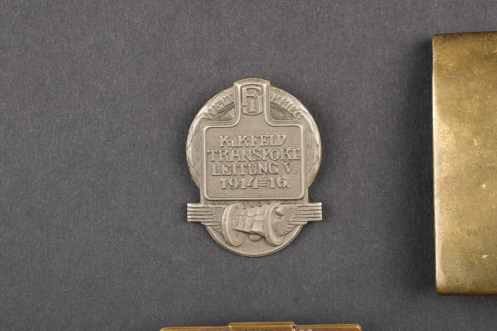 Autriche-Hongrie lot boucle et insignes. Boucle hongroise laiton, 3 Kappenabzeichen, insignes de casquette 2e Armee Karpathen, KuK Transport-Leitung, une médaille 1914-1917 et un étui pendentif aluminium hongrois pour papiers d’identités, axe charnière manquant. Usure d’usage. Mixed Austro-Hungarian insignia lot including one Hungarian brass buckle, three Kappenabzeichen badges, including 2. Armee Karpathen and KuK Transport-Leitung, one 1914–1917 medal, and one aluminium Hungarian identity pendant case with missing hinge pin.