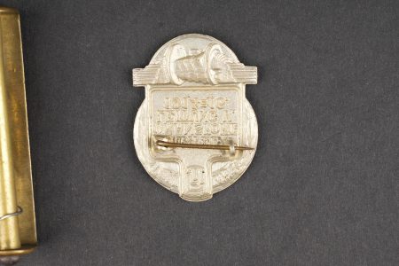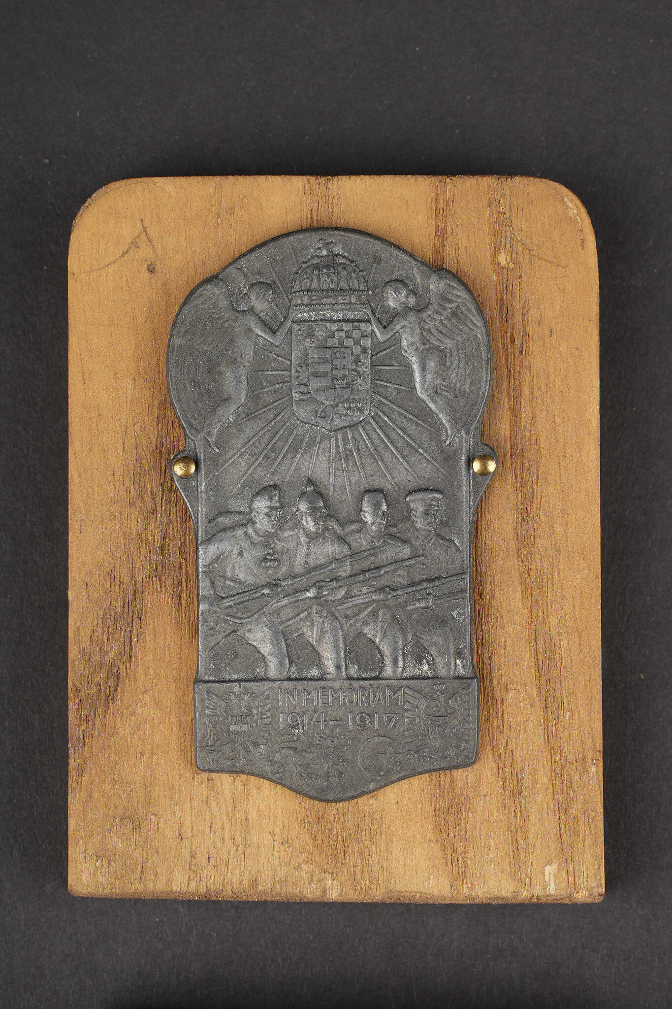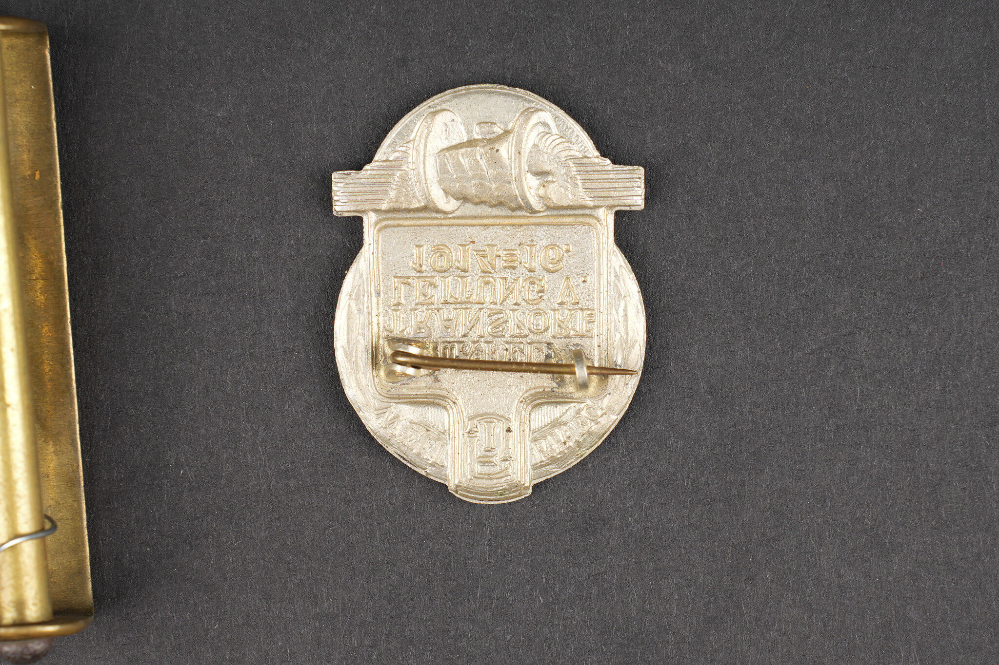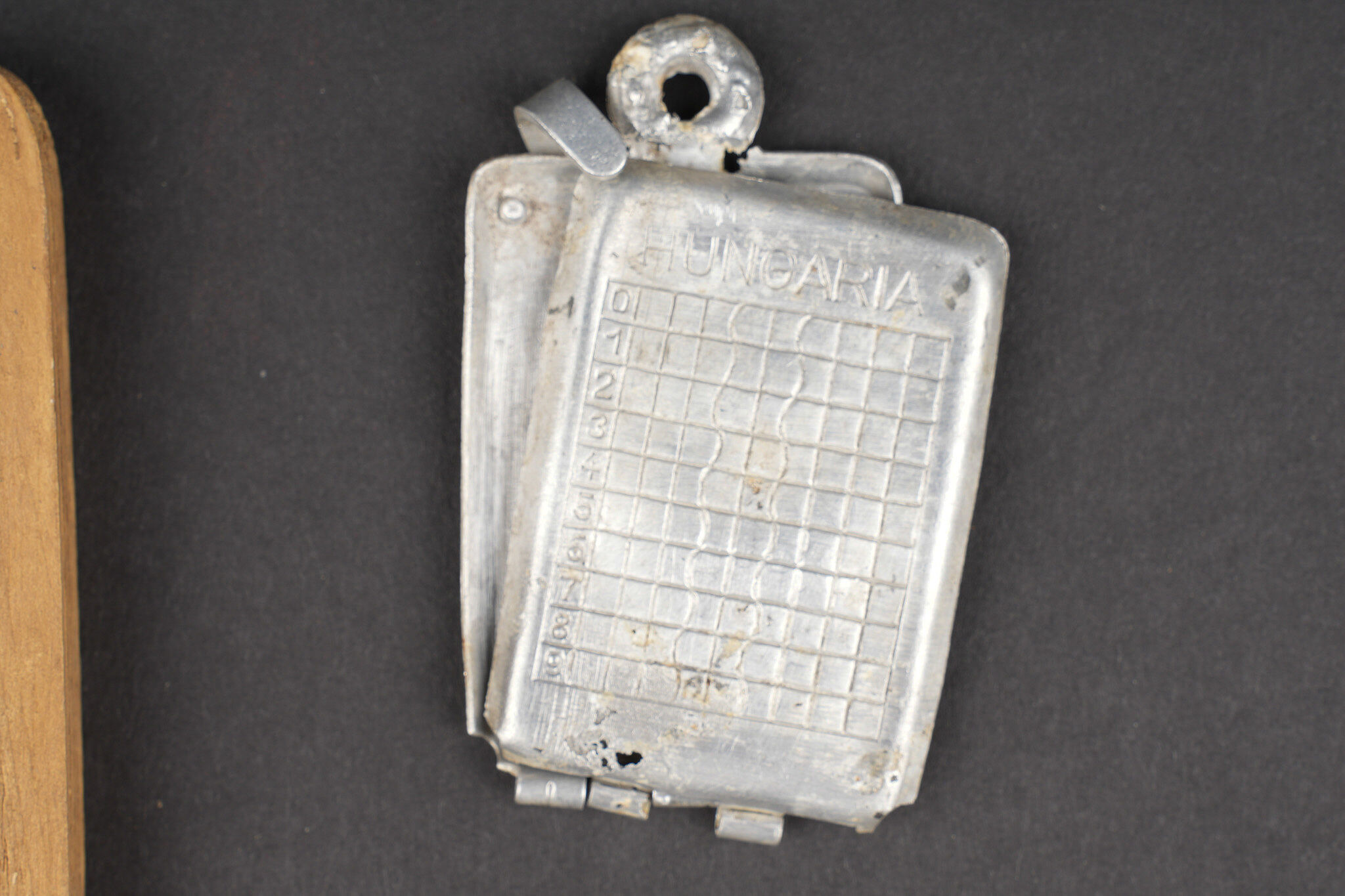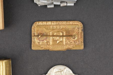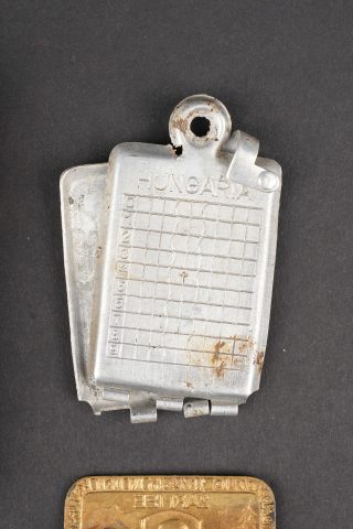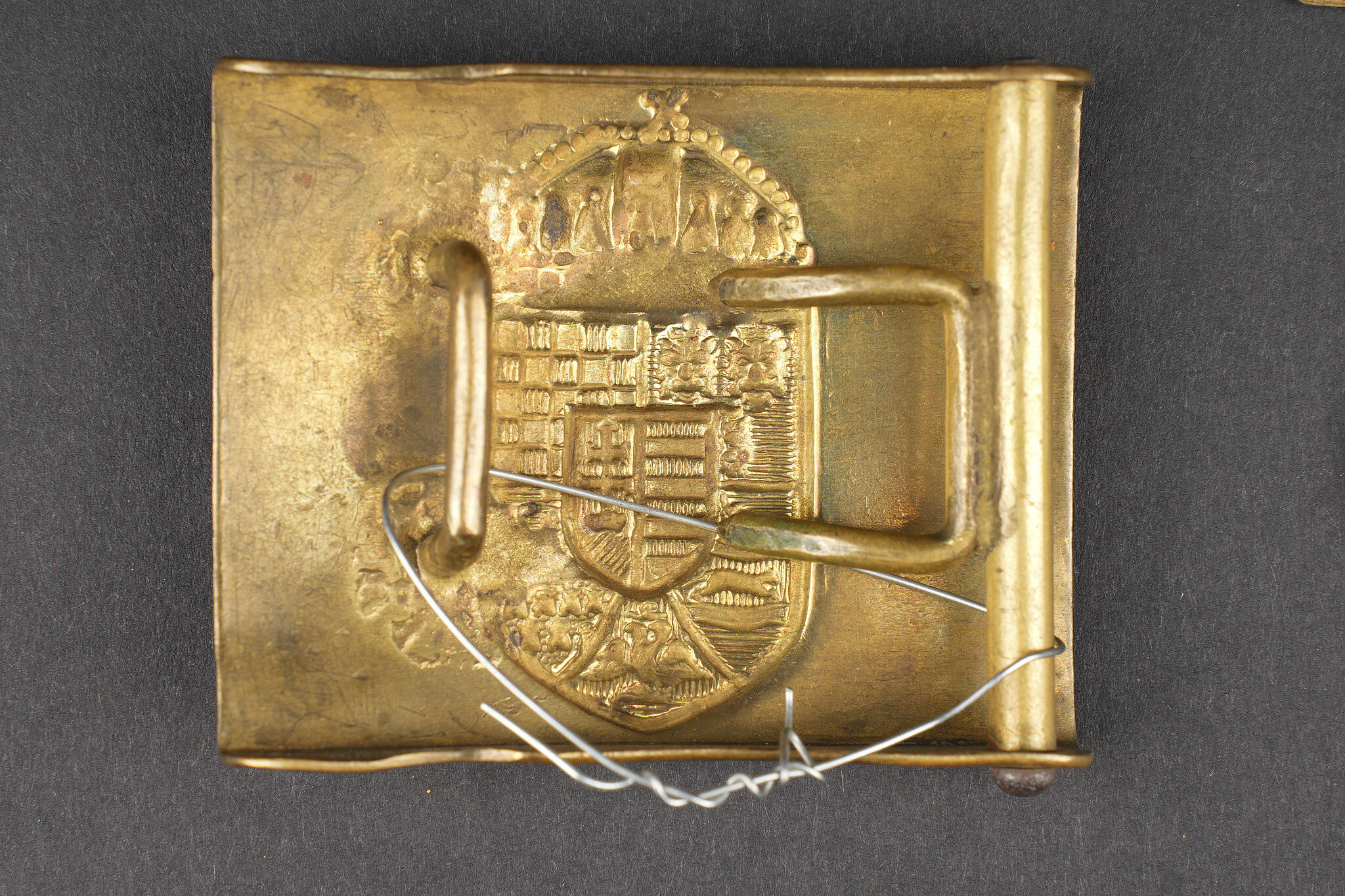 Autriche-Hongrie lot boucle et insignes. Boucle hongroise laiton, 3 Kappenabzeichen, insignes de casquette 2e Armee Karpathen, KuK Transport-Leitung, une médaille 1914-1917 et un étui pendentif aluminium hongrois pour papiers d’identités, axe charnière manquant. Usure d’usage. Mixed Austro-Hungarian insignia lot including one Hungarian brass buckle, three Kappenabzeichen badges, including 2. Armee Karpathen and KuK Transport-Leitung, one 1914–1917 medal, and one aluminium Hungarian identity pendant case with missing hinge pin.