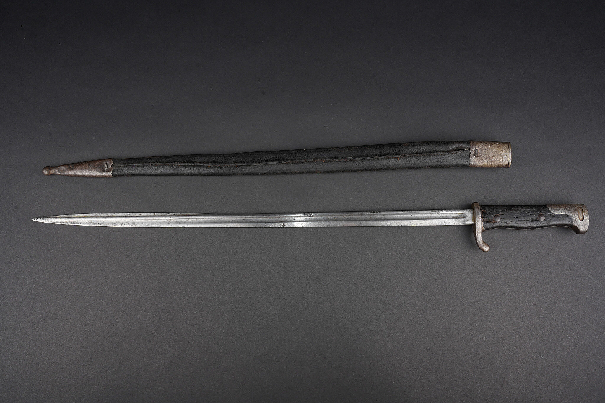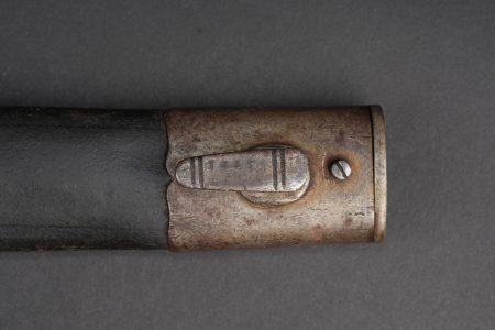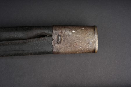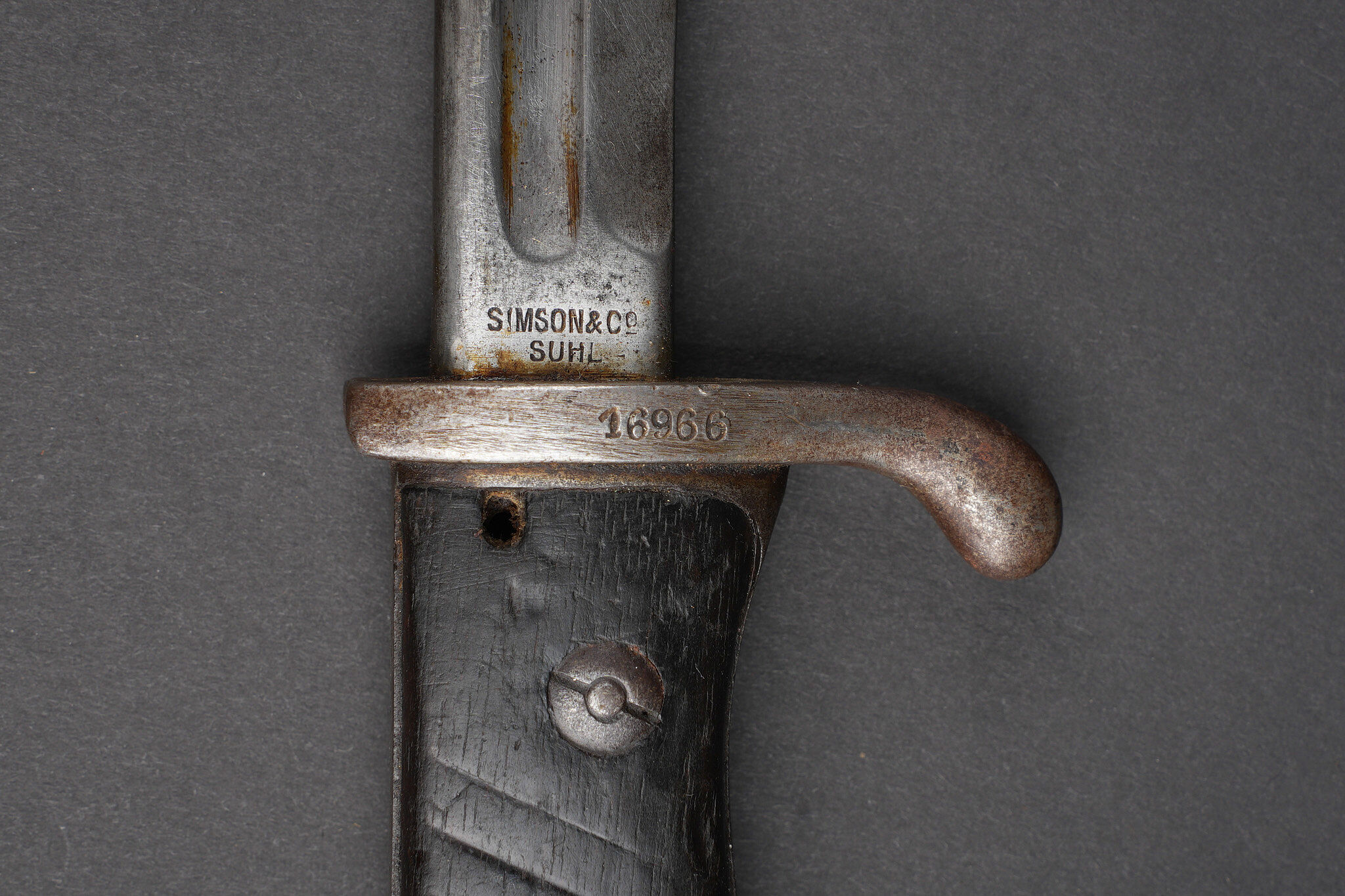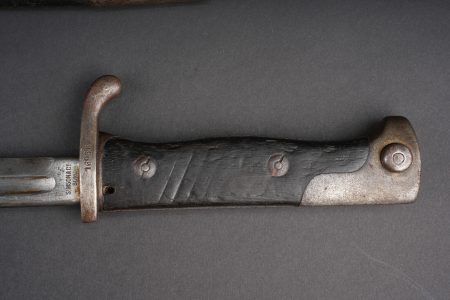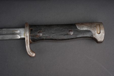 Baïonnette allemande S98 export pour la Turquie. Poignée à 2 plaquettes bois type S98 nA, usées, coups. Matricule sur la croisière. Lame du fabricant Simson de Suhl. Poussoir fonctionnel. Fourreau cuir. German export bayonet for Ottoman service, Seitengewehr 98 type with two wooden grip plates in S98 nA style, matriculated crossguard, blade by Simson of Suhl, working push-button and leather scabbard.