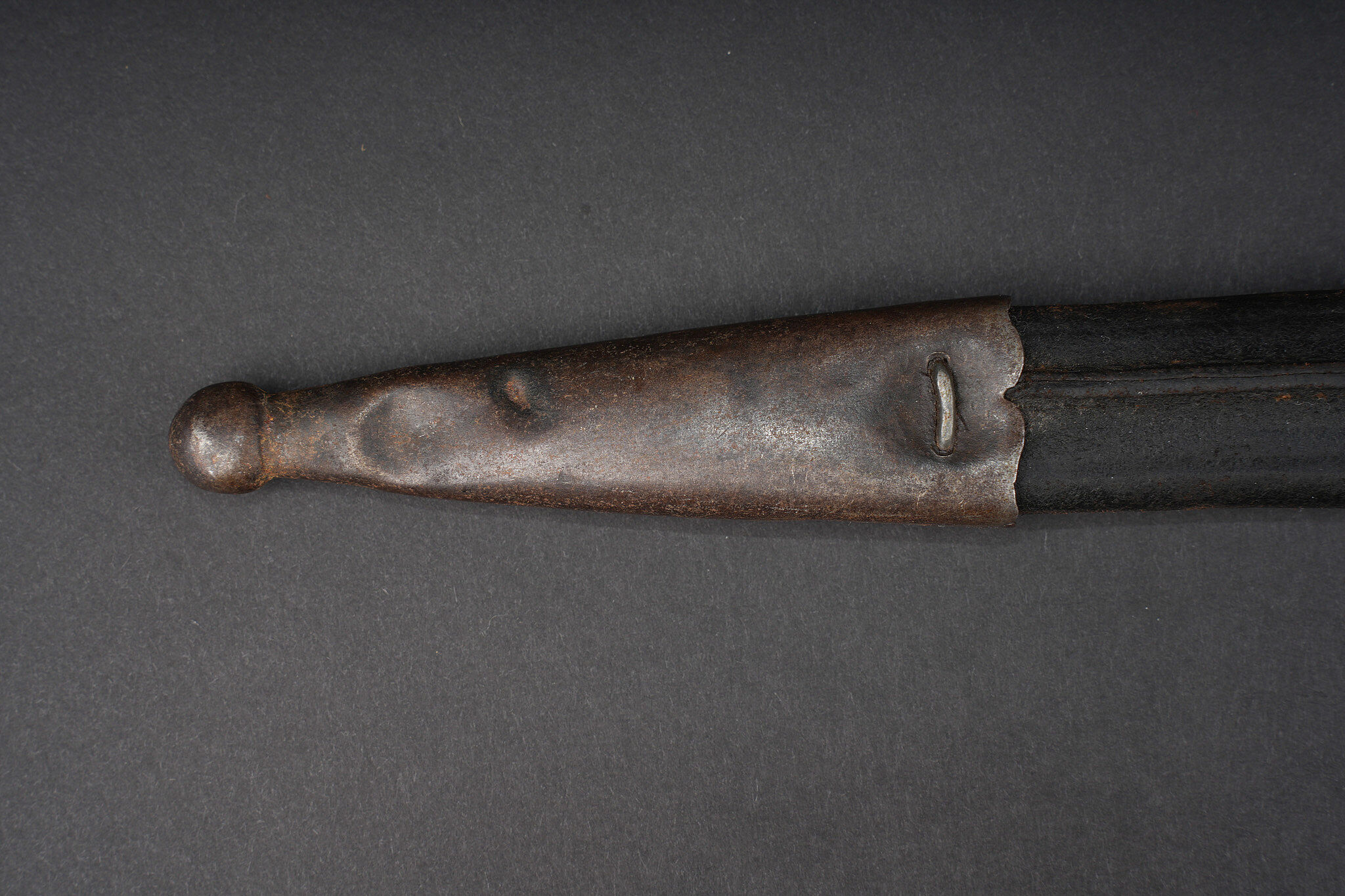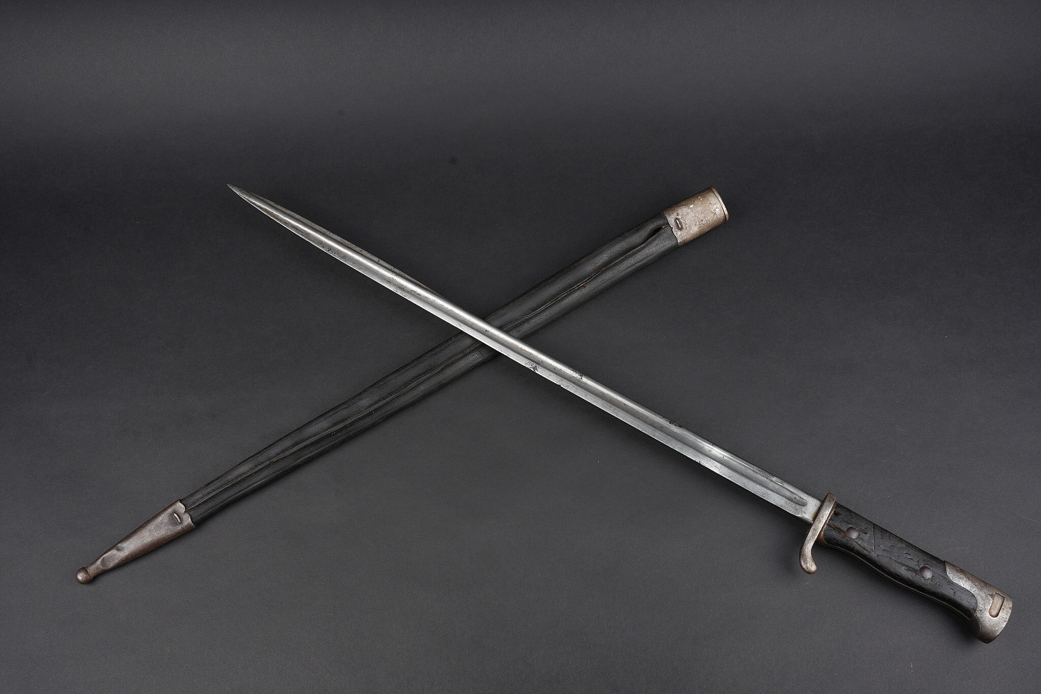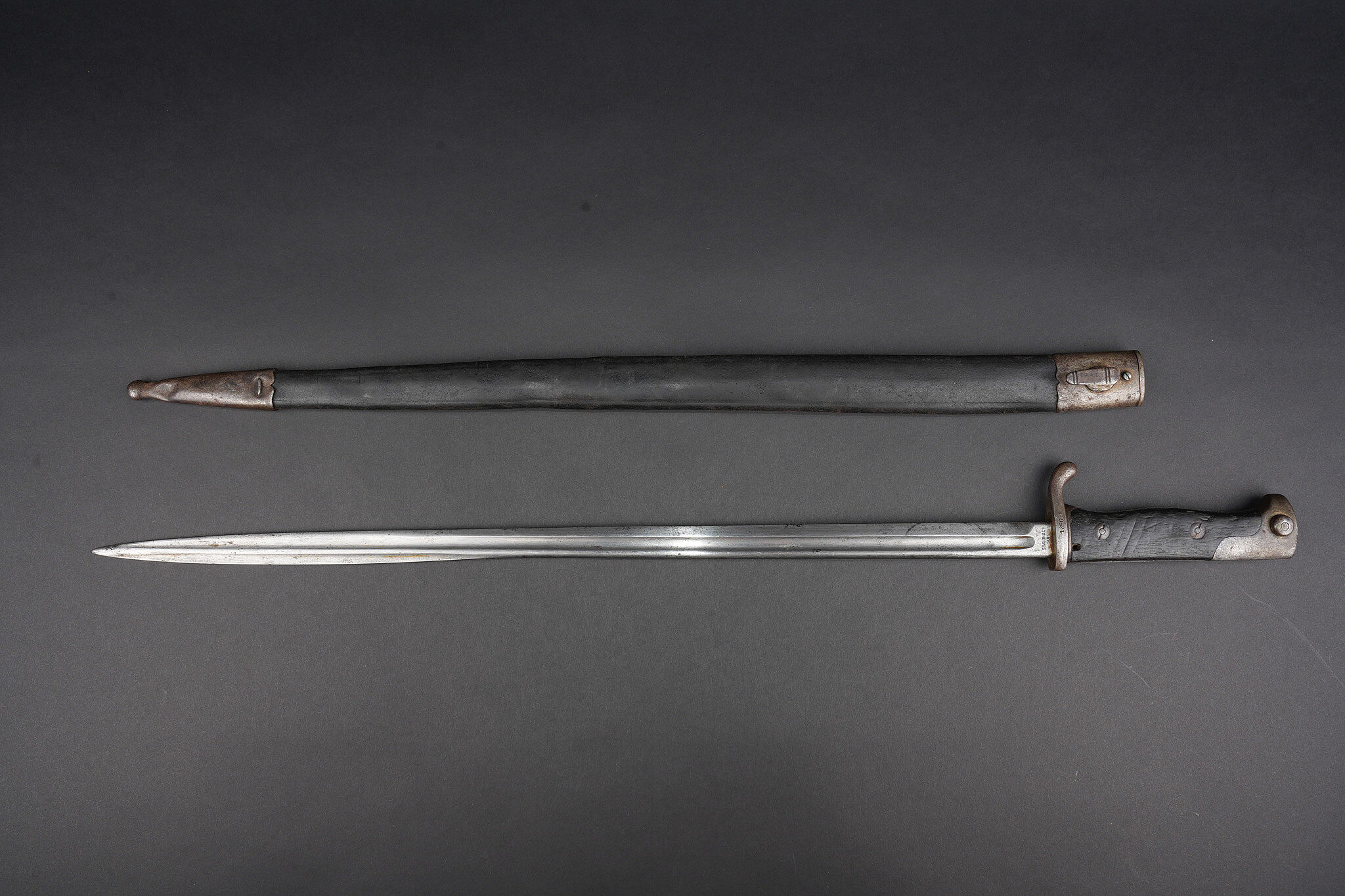 Baïonnette allemande S98 export pour la Turquie. Poignée à 2 plaquettes bois type S98 nA, usées, coups. Matricule sur la croisière. Lame du fabricant Simson de Suhl. Poussoir fonctionnel. Fourreau cuir. German export bayonet for Ottoman service, Seitengewehr 98 type with two wooden grip plates in S98 nA style, matriculated crossguard, blade by Simson of Suhl, working push-button and leather scabbard.
