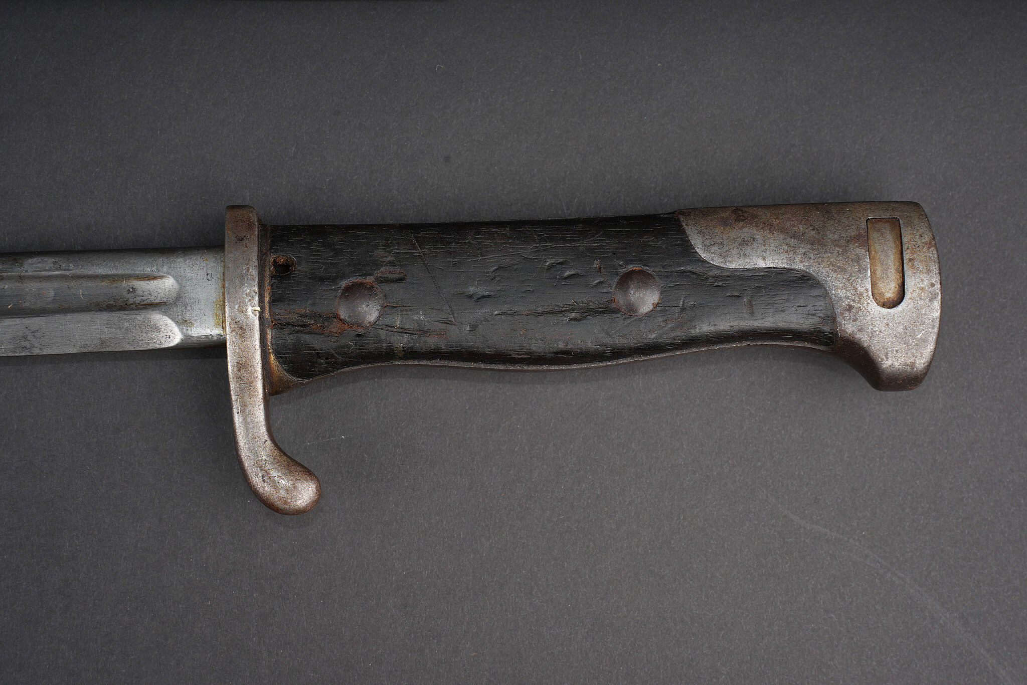 Baïonnette allemande S98 export pour la Turquie. Poignée à 2 plaquettes bois type S98 nA, usées, coups. Matricule sur la croisière. Lame du fabricant Simson de Suhl. Poussoir fonctionnel.... en savoir plus