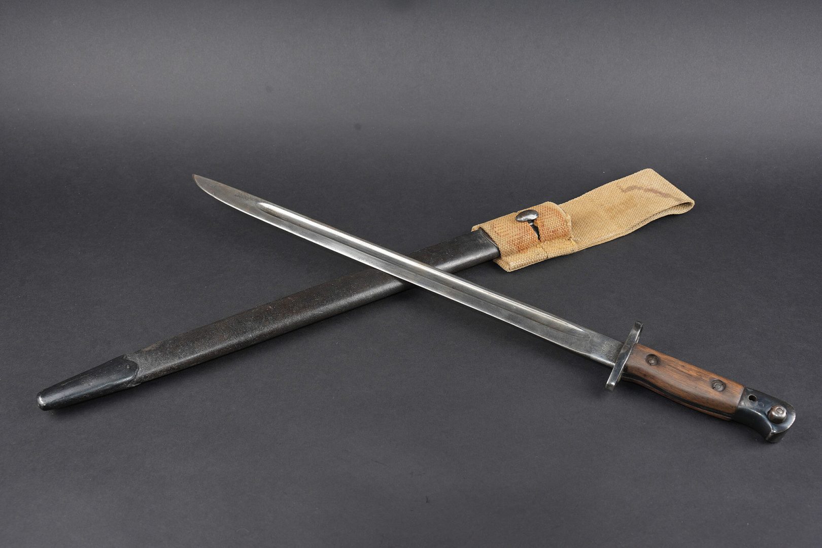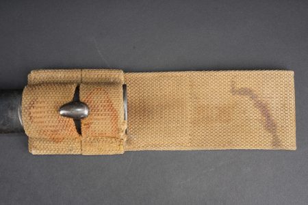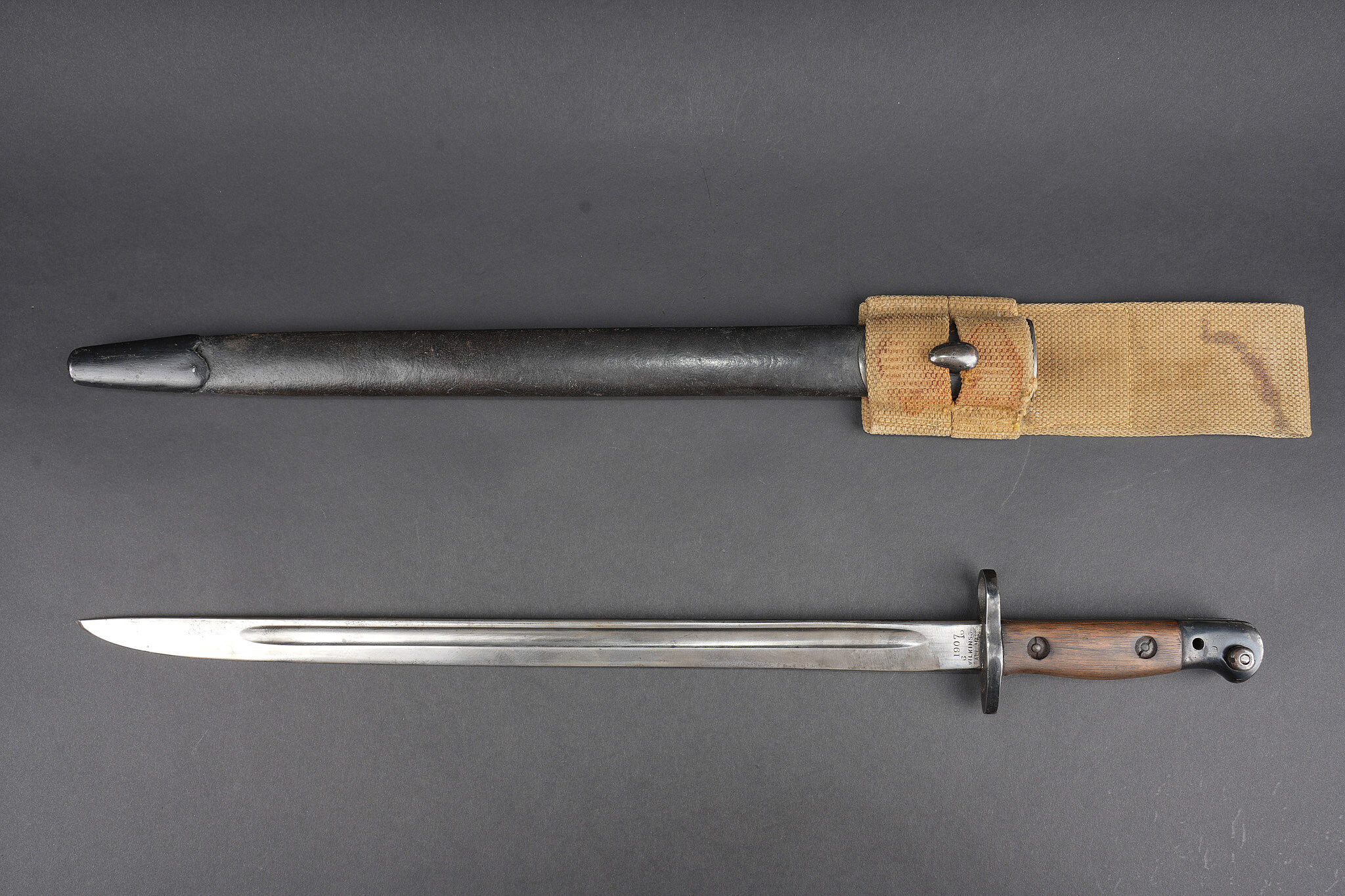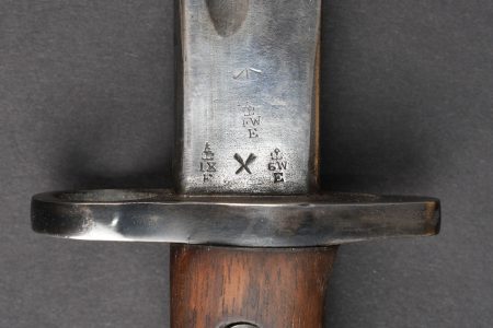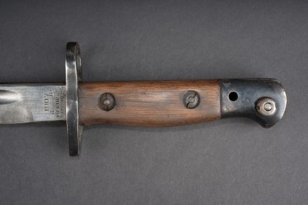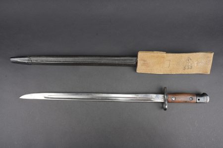Baïonnette anglaise M1907 avec porte fourreau Web 1908. Belle lame fabricant Wilkinson datée Juin 1916. Plaquettes bois en bon état. Parties métalliques de la poignée rebronzées. Bouton ressort fonctionnel. Fourreau cuir noirci à garnitures fer. Bouton de chape en amande, fabrication 1ère guerre. Dans un porte fourreau en web pattern 1908, marquage fabricant, date illisible car trou de suspension dans la toile. Tampon d’inspecteur à l’encre avec Broad Arrow. La patte pour le porte manche n’a jamais été cousue, indiquant une affectation à une troupe de 2nde ligne. Bel état. British Pattern 1907 bayonet with web 1908 frog, fitted with a fine blade by Wilkinson Sword dated June 1916. Wooden grips in good condition, metal parts of the hilt reblued, spring catch functioning correctly. Blackened leather scabbard with iron fittings and almond-shaped throat stud of First World War type. Preserved in a web pattern 1908 frog with maker marking, date illegible because of suspension hole in the webbing, ink inspector stamp with Broad Arrow. The lower retaining tab was never stitched, indicating issue to a second-line unit. Very good condition.