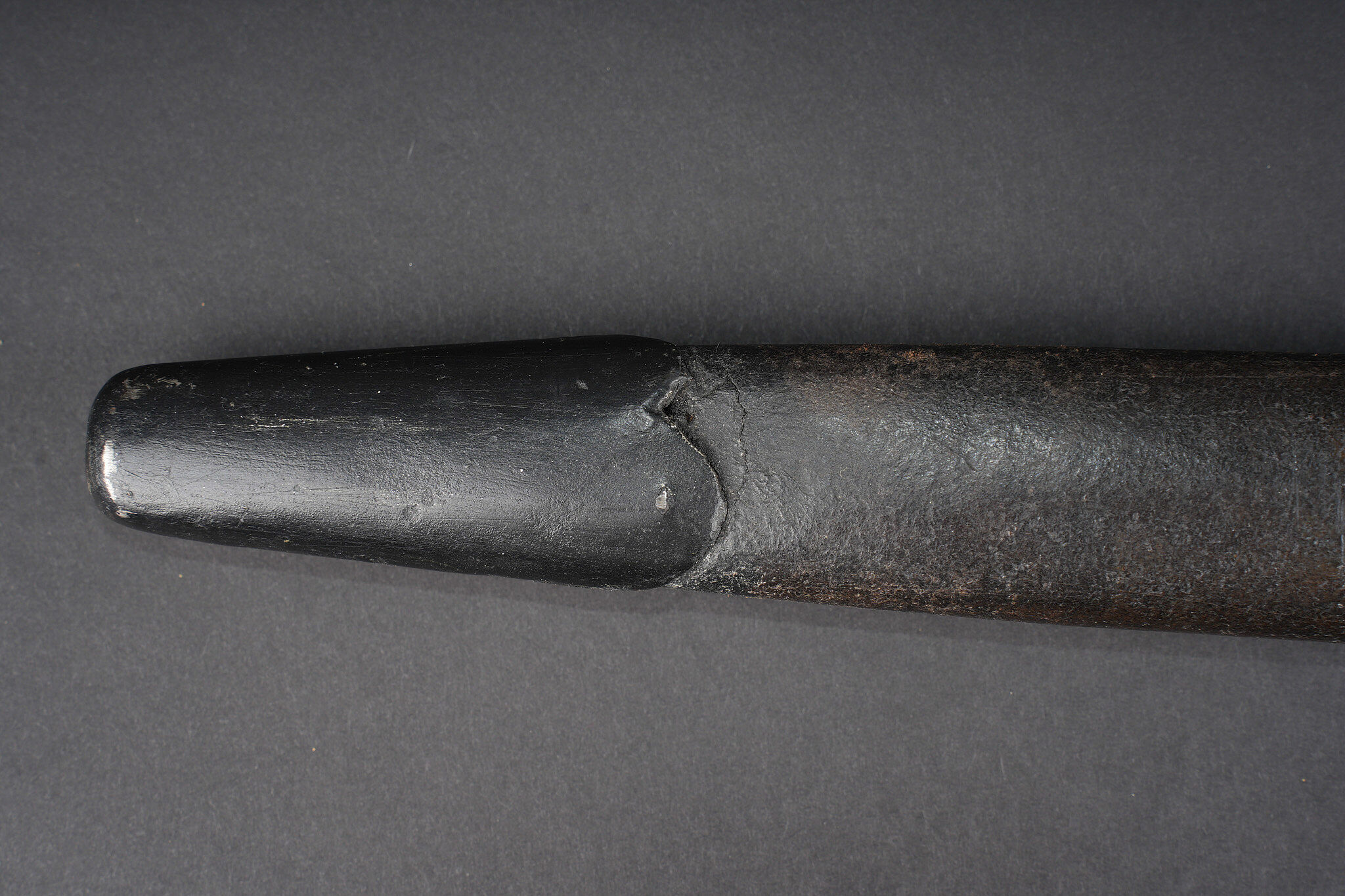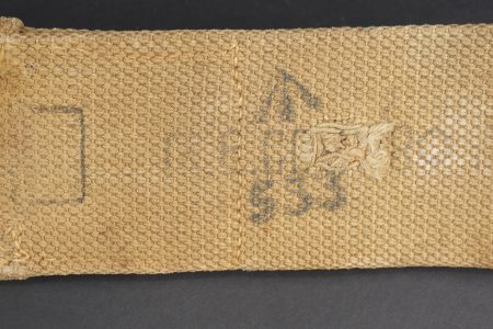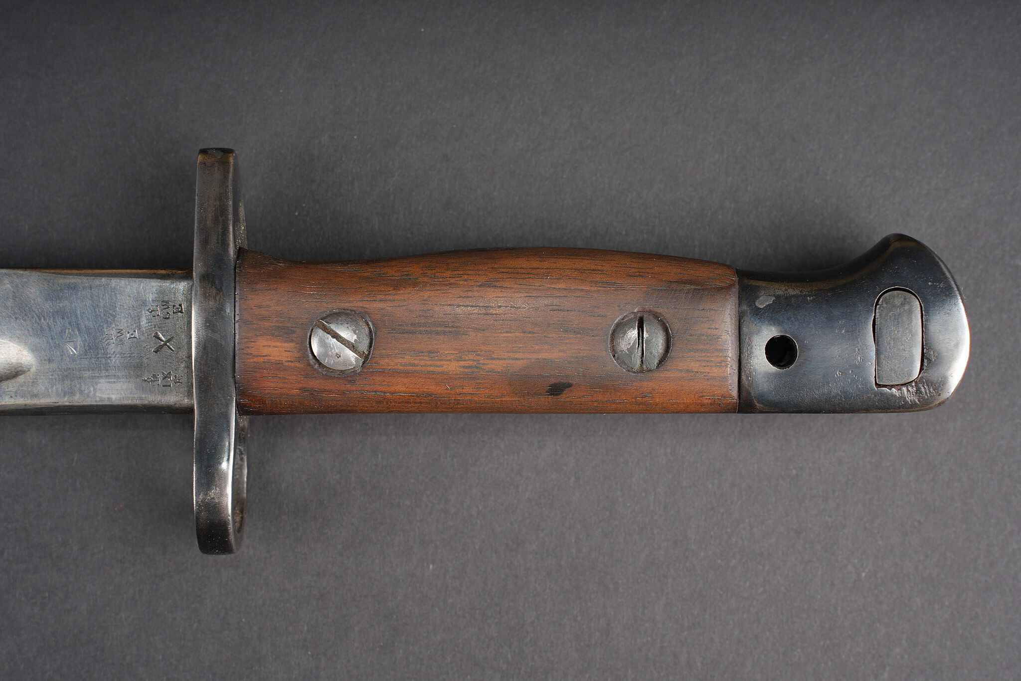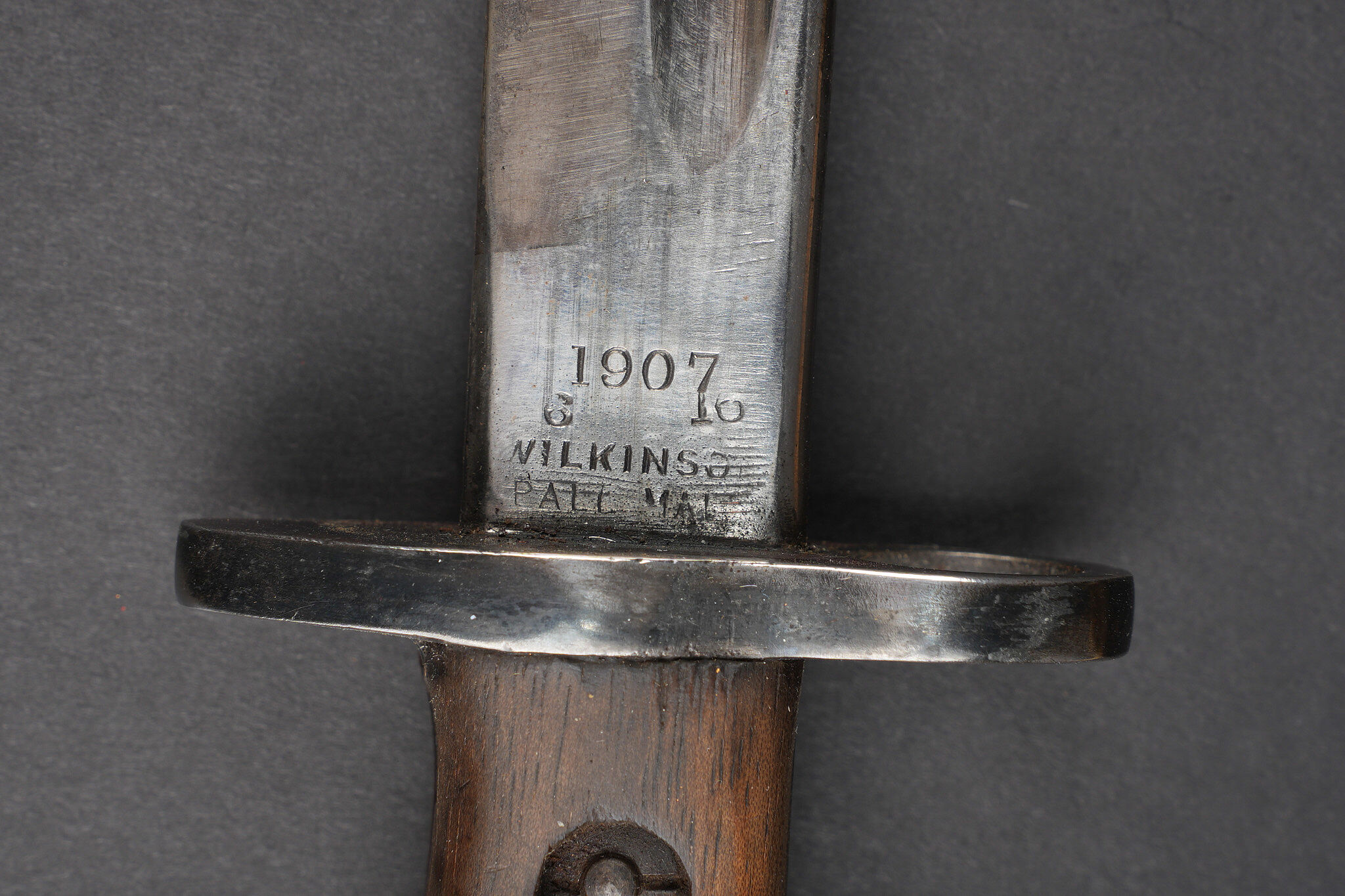 Baïonnette anglaise M1907 avec porte fourreau Web 1908. Belle lame fabricant Wilkinson datée Juin 1916. Plaquettes bois en bon état. Parties métalliques de la poignée rebronzées. Bouton ressort fonctionnel. Fourreau cuir noirci à garnitures fer. Bouton de chape en amande, fabrication 1ère guerre. Dans un porte fourreau en web pattern 1908, marquage fabricant, date illisible car trou de suspension dans la toile. Tampon d’inspecteur à l’encre avec Broad Arrow. La patte pour le porte manche n’a jamais été cousue, indiquant une affectation à une troupe de 2nde ligne. Bel état. British Pattern 1907 bayonet with web 1908 frog, fitted with a fine blade by Wilkinson Sword dated June 1916. Wooden grips in good condition, metal parts of the hilt reblued, spring catch functioning correctly. Blackened leather scabbard with iron fittings and almond-shaped throat stud of First World War type. Preserved in a web pattern 1908 frog with maker marking, date illegible because of suspension hole in the webbing, ink inspector stamp with Broad Arrow. The lower retaining tab was never stitched, indicating issue to a second-line unit. Very good condition.