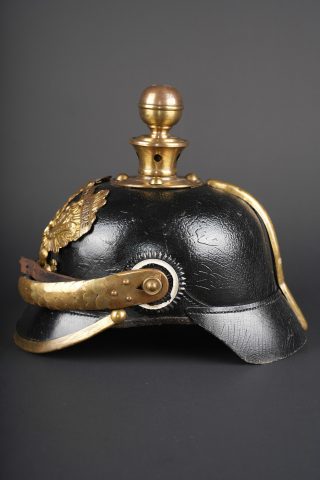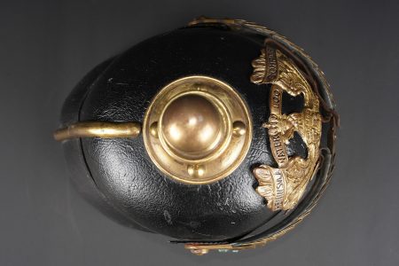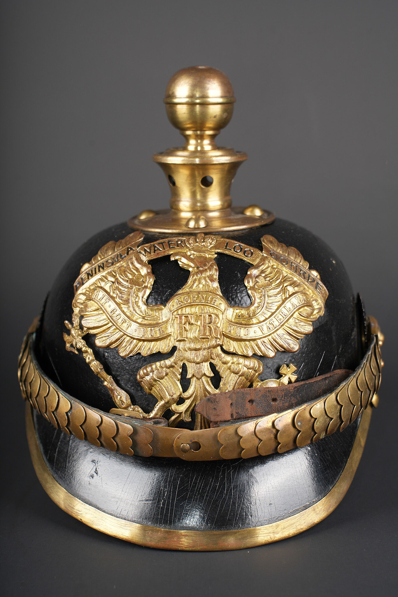 Détails de la vente >Casque à boule M1895 Peninsula Waterloo Gohrde du Feld Artillerie Regiment Nr 10 de Hanovre. Peu courant casque, non repercé. Plaque monobloc à l’aigle allemand avec banderoles PENINSULA... en savoir plus