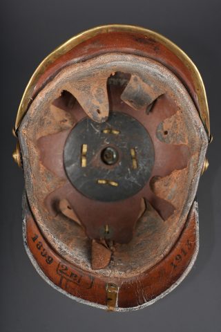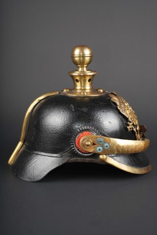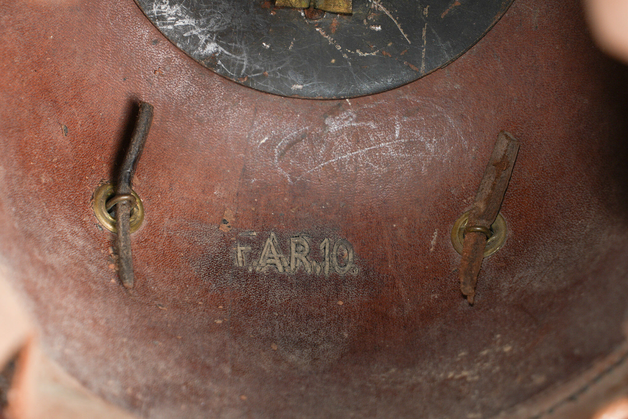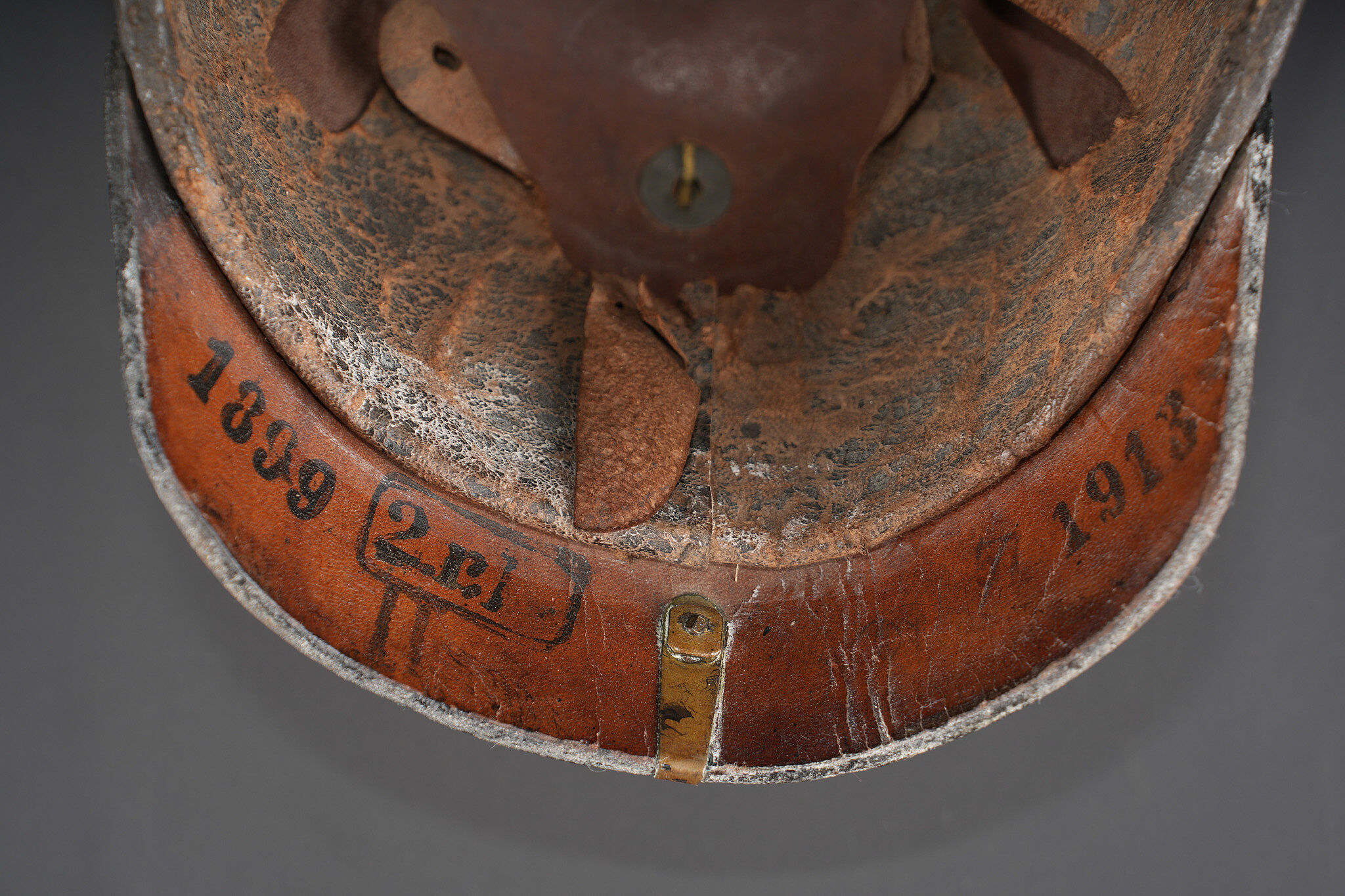 Casque à boule M1895 Peninsula Waterloo Gohrde du Feld Artillerie Regiment Nr 10 de Hanovre. Peu courant casque, non repercé. Plaque monobloc à l’aigle allemand avec banderoles PENINSULA WATERLOO GÖHRDE, pontets soudés d’origine. Bien marqué FAR10 au fer à l’intérieur entre les oeillets de la plaque, et sur la nuquière 2 r.b. pour 2e batterie hippomobile, et dates 1899 et 1913. Boule dévissable. Bonne Reichskokarde, Landkokarde sans garantie mais bel aspect. Jugulaires à écailles bombées sur tourillons à index M1891. Coiffe à dents de loup en cuir marron foncé, usure, déchirures. Un casque rare. Usure d’usage, patine. Hanoverian artillery Kugelhelm M1895 of the Feldartillerie Regiment Nr 10 with Peninsula Waterloo Göhrde battle honour plate, rare non re pierced example. One piece German eagle plate with original soldered loops, clearly iron marked FAR10 inside between plate eyelets and rear neck guard marked 2 r.b. for 2nd horse battery with dates 1899 and 1913. Removable ball top, good Reich cockade, state cockade attractive though not guaranteed, convex scale chinstraps on M1891 posts, dark brown leather wolf tooth liner with wear and tears. Rare helmet with service wear and patina.