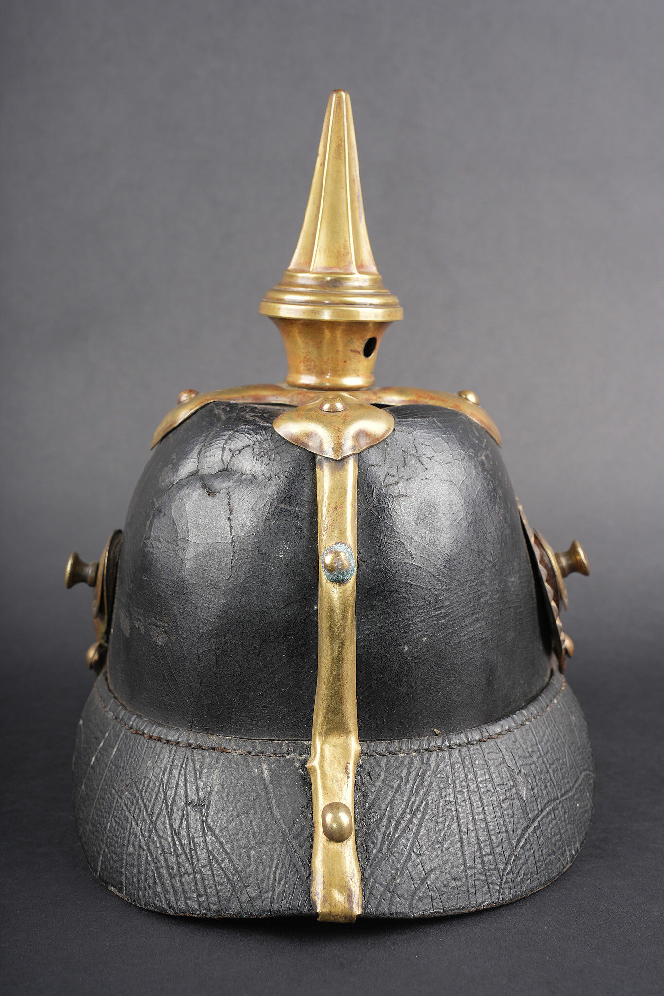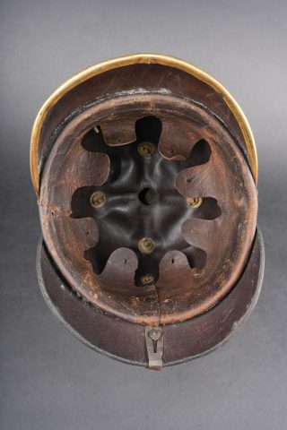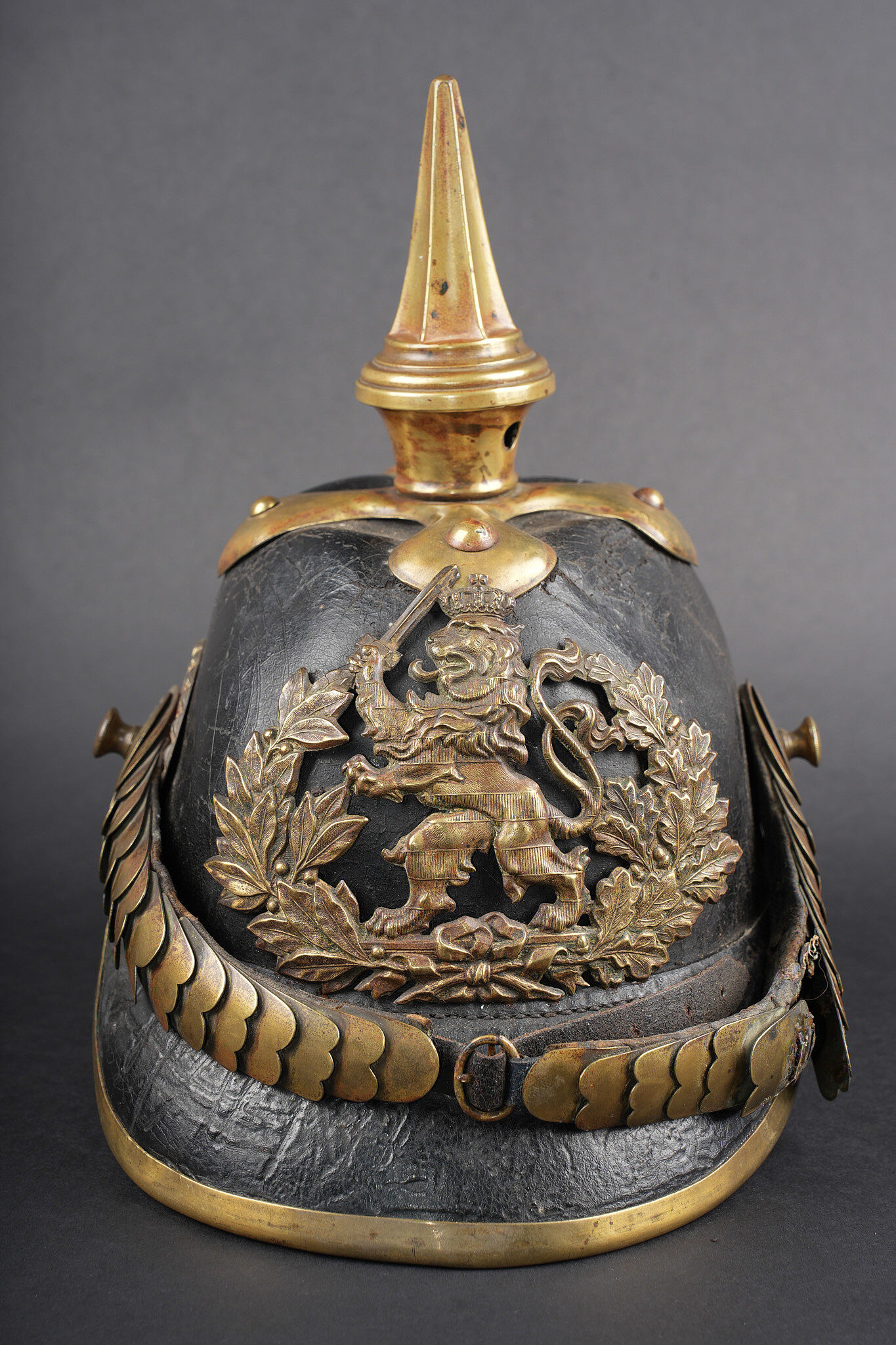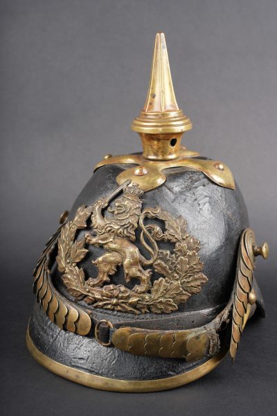 Casque à pointe Hessois guerre de 1870. Casque vers 1860-1867, probablement modification d’un modèle antérieur par diminution de la hauteur de la bombe. Bombe en cuir noirci, avec des déformations. Aucun marquage visible. Toutes garnitures laiton. Plaque au lion hessois fixée par tiges filetées et écrous. Embase cruciforme avec pointe fixe cannelée. Jugulaires à grosses écailles festonnées bombées, quelques unes manquantes ou détachées. Grande cocarde hessoise de 60 mm de diamètre. Coiffe à dents de loup. Usure, patine. Hessian Pickelhaube from the Franco Prussian War period, dating circa 1860 to 1867, likely altered from an earlier model by reducing shell height. Blackened leather body with deformation, no visible markings, all brass fittings, Hessian lion plate secured by threaded posts and nuts, cruciform base with fixed fluted spike, convex scalloped scale chinstraps with several scales missing or detached, large Hessian cockade of 60 mm diameter, and wolf tooth liner. Wear and patina.