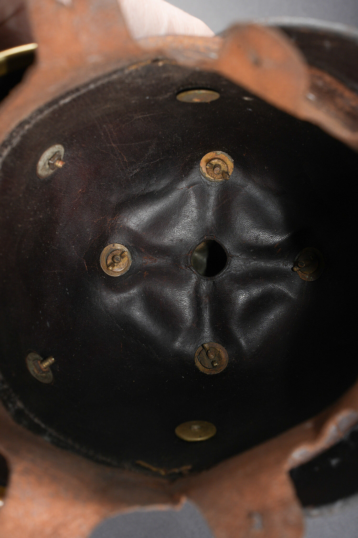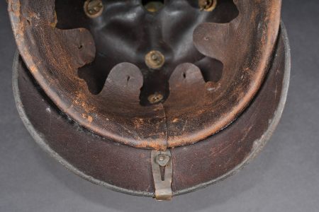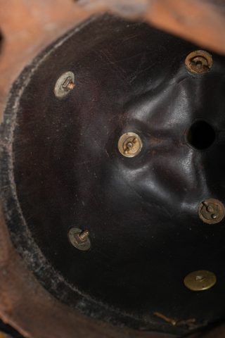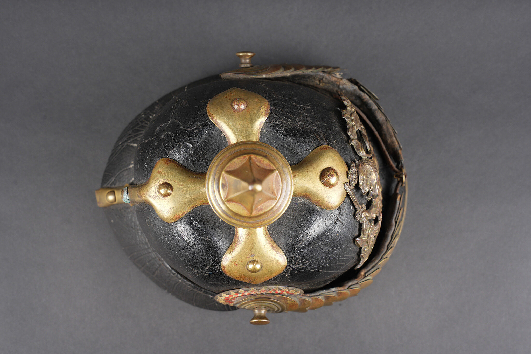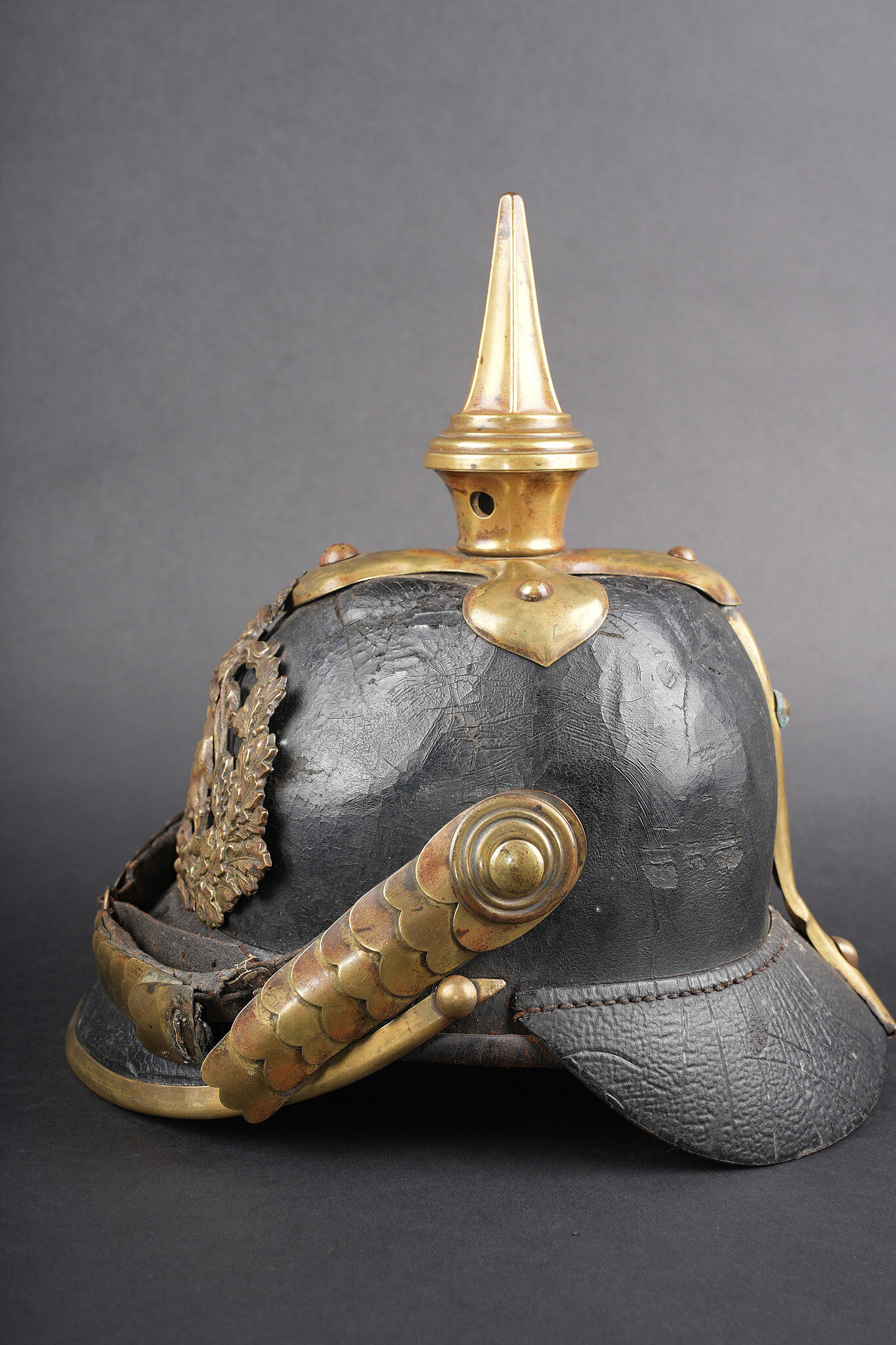 Casque à pointe Hessois guerre de 1870. Casque vers 1860-1867, probablement modification d’un modèle antérieur par diminution de la hauteur de la bombe. Bombe en cuir noirci, avec des déformations. Aucun marquage visible. Toutes garnitures laiton. Plaque au lion hessois fixée par tiges filetées et écrous. Embase cruciforme avec pointe fixe cannelée. Jugulaires à grosses écailles festonnées bombées, quelques unes manquantes ou détachées. Grande cocarde hessoise de 60 mm de diamètre. Coiffe à dents de loup. Usure, patine. Hessian Pickelhaube from the Franco Prussian War period, dating circa 1860 to 1867, likely altered from an earlier model by reducing shell height. Blackened leather body with deformation, no visible markings, all brass fittings, Hessian lion plate secured by threaded posts and nuts, cruciform base with fixed fluted spike, convex scalloped scale chinstraps with several scales missing or detached, large Hessian cockade of 60 mm diameter, and wolf tooth liner. Wear and patina.
