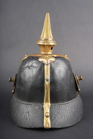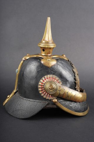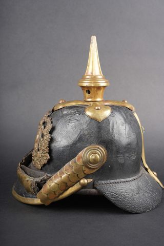Détails de la vente >Casque à pointe Hessois guerre de 1870. Casque vers 1860-1867, probablement modification d’un modèle antérieur par diminution de la hauteur de la bombe. Bombe en cuir noirci, avec des... en savoir plus