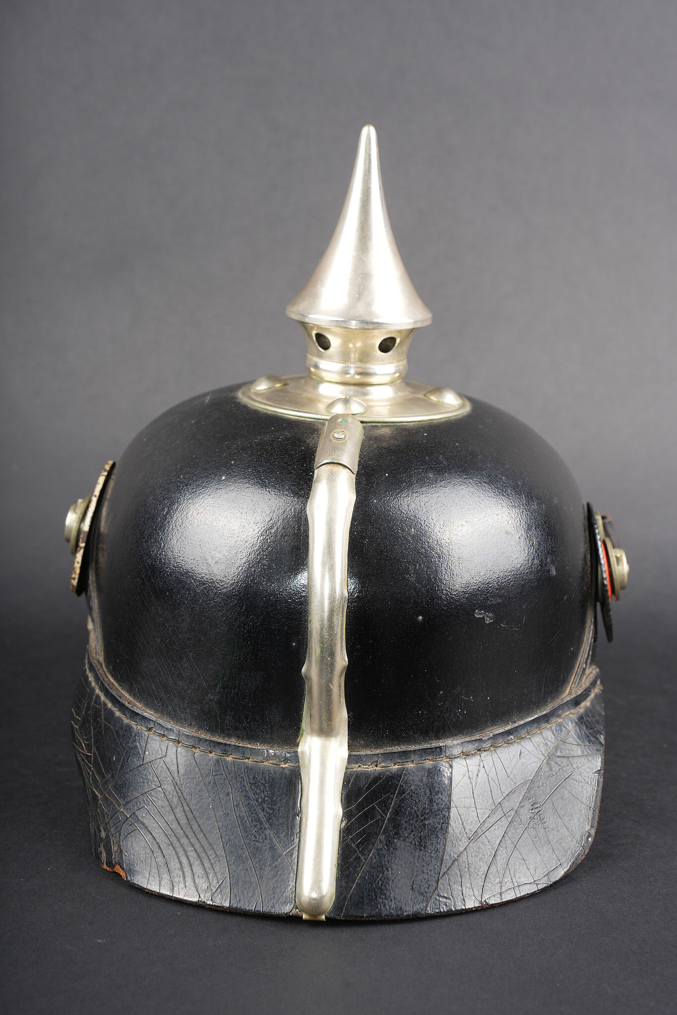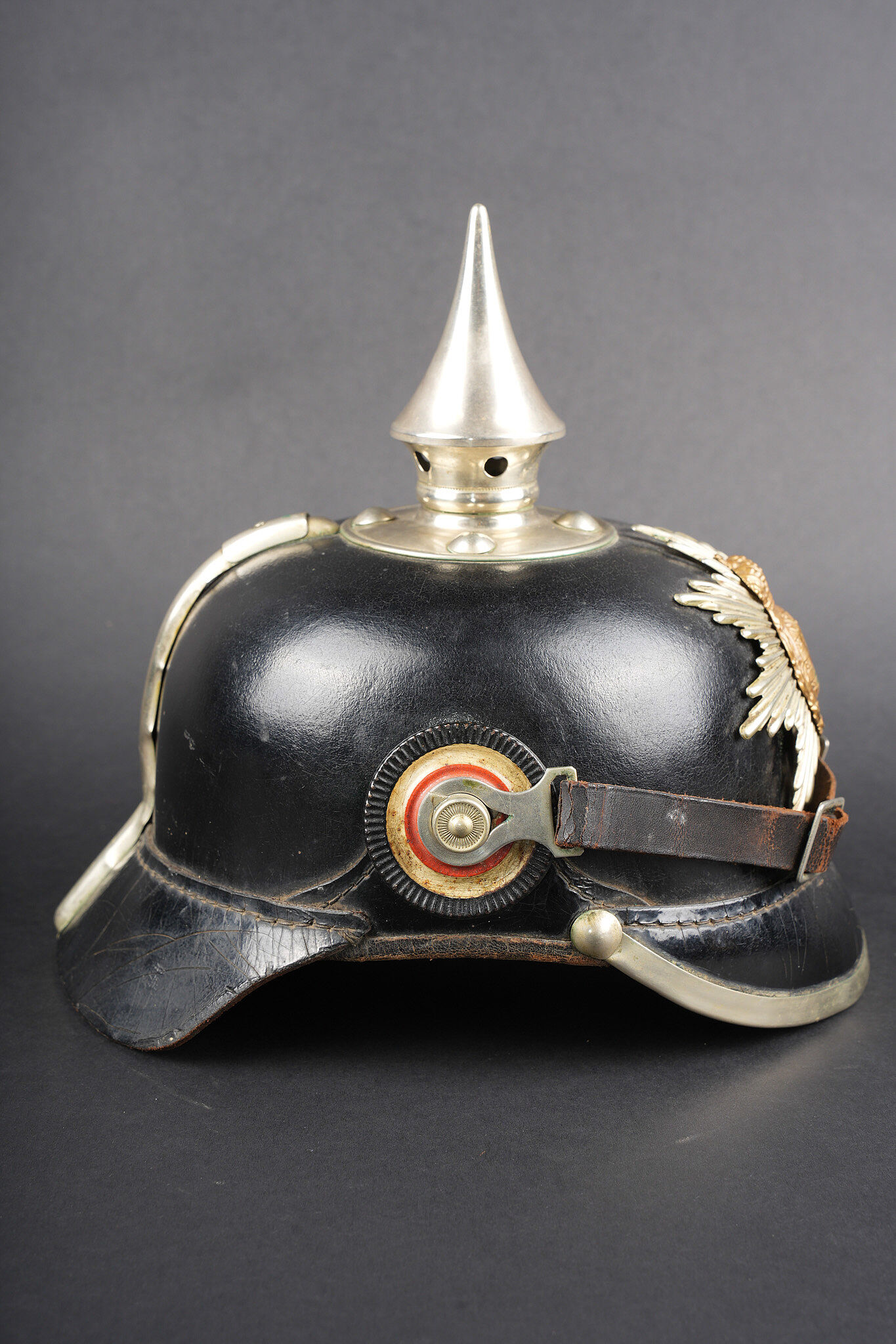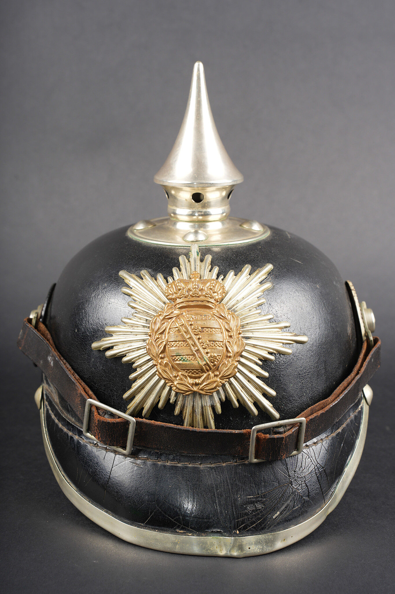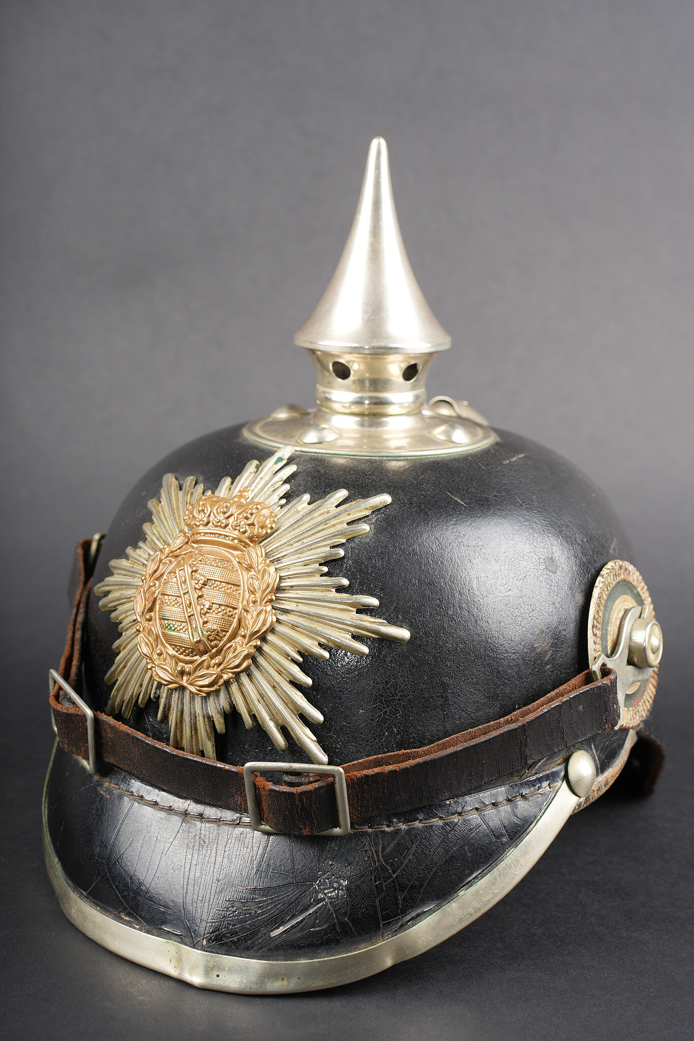 Casque à pointe M1895 du 100e Grenadier Saxon. Beau casque du LGR100, bombe en cuir noirci, non repercée et en bel état. Nuquière bien marquée 100R. Toutes garnitures maillechort. Plaque saxonne aux couleurs inversées, fabricant Osang, pontets soudés d’origine, avec une belle empreinte sur la bombe. Pointe dévissable, embase fixée d’origine. Bonnes cocardes saxonnes, bonne jugulaire à garnitures maillechort. Coiffe à dents de loup en cuir noirci. Beau casque nature. Pickelhaube M1895 fine helmet of Leib Grenadier Regiment Nr 100 with blackened leather shell, not re pierced and in very good condition. Rear visor clearly marked 100R. All fittings in nickel silver. Saxon plate with reversed colours by G. H. Osang, original soldered loops, with a strong imprint on the shell. Removable spike with untouched original base. Good Saxon cockades and good nickel silver mounted chinstrap. Blackened leather tongue liner. Fine untouched helmet