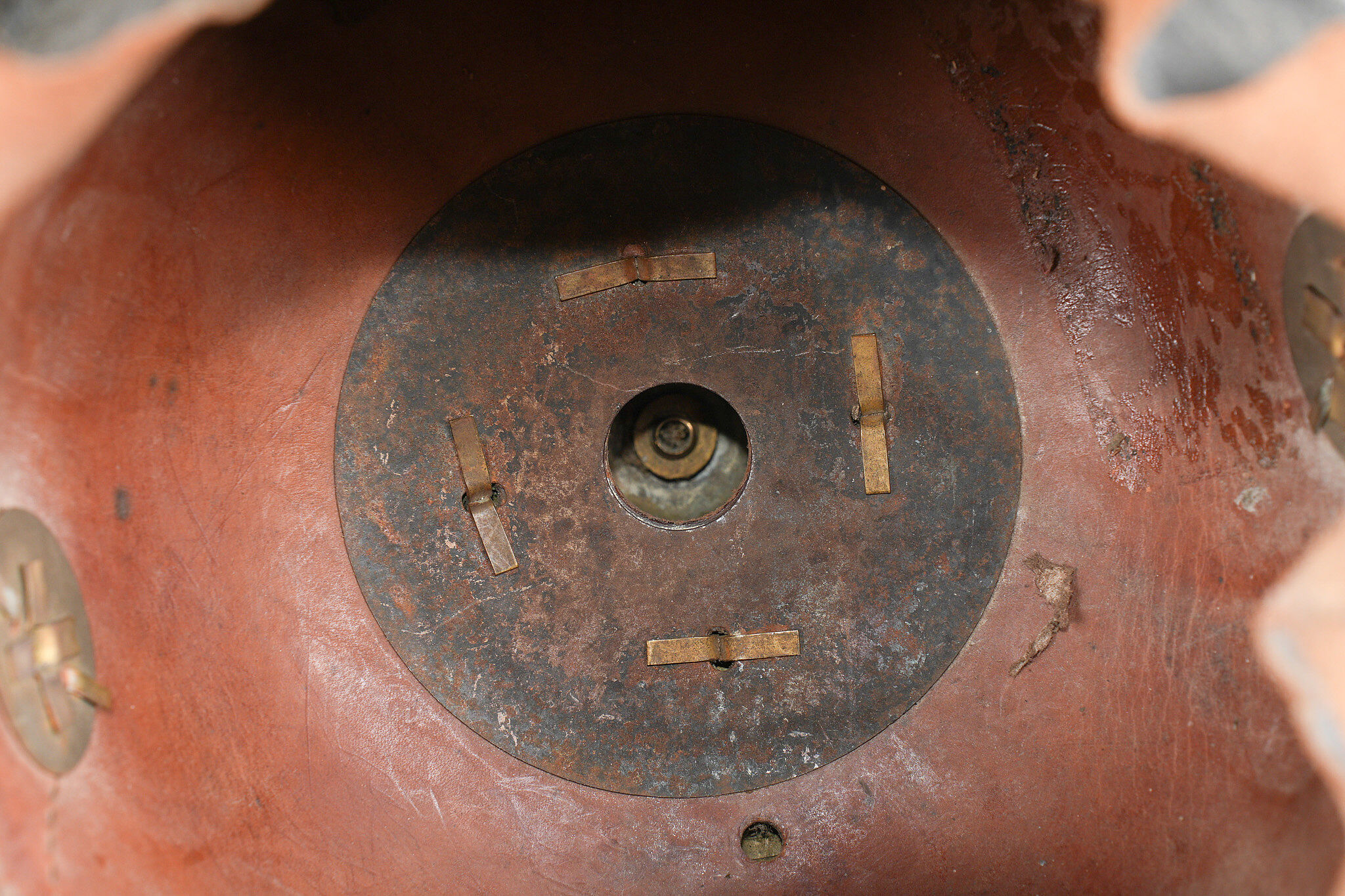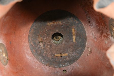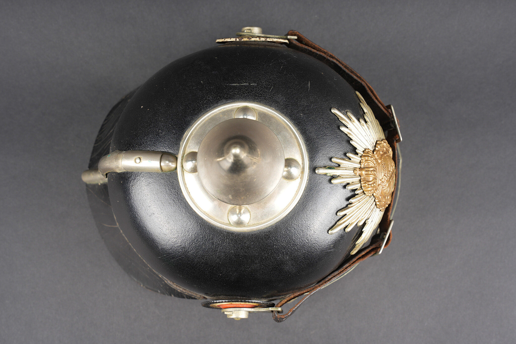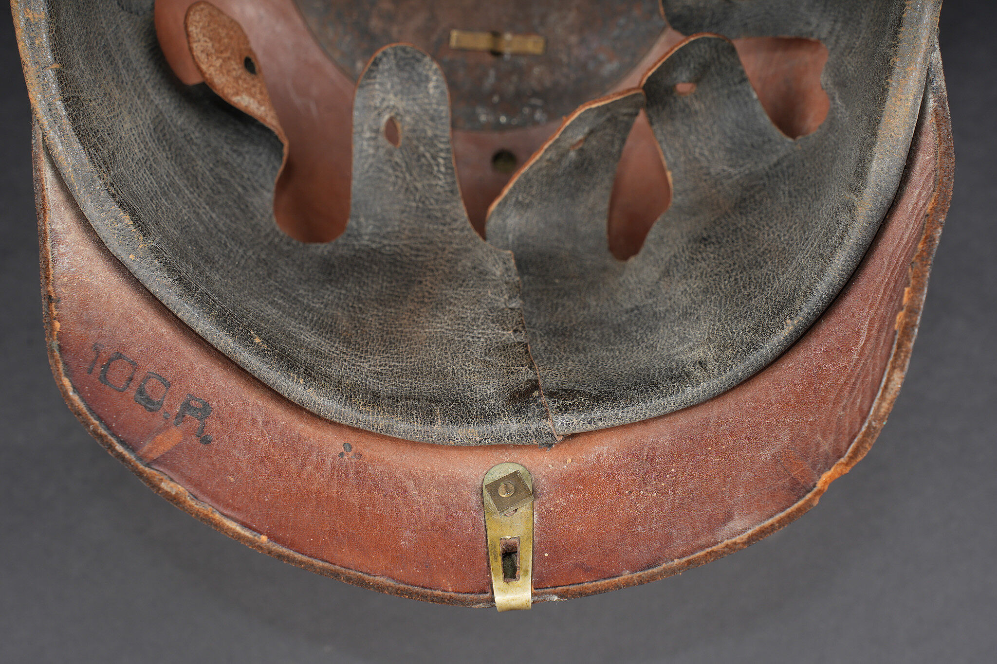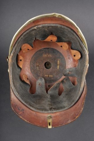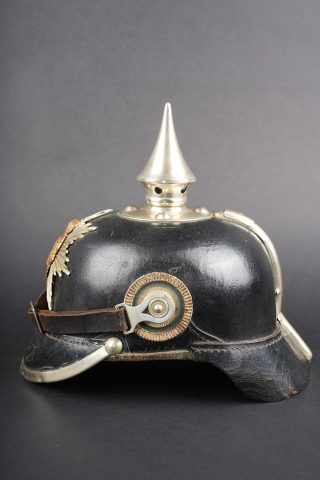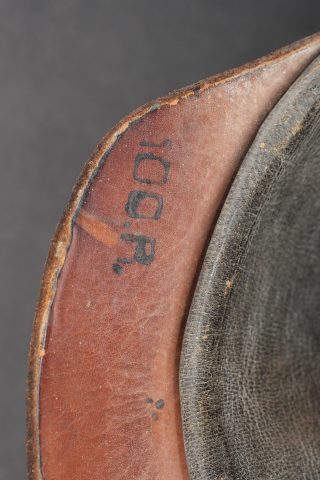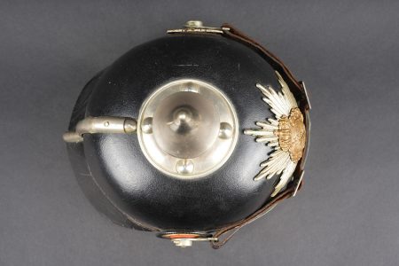 Détails de la vente >Casque à pointe M1895 du 100e Grenadier Saxon. Beau casque du LGR100, bombe en cuir noirci, non repercée et en bel état. Nuquière bien marquée 100R. Toutes garnitures maillechort. Plaque... en savoir plus