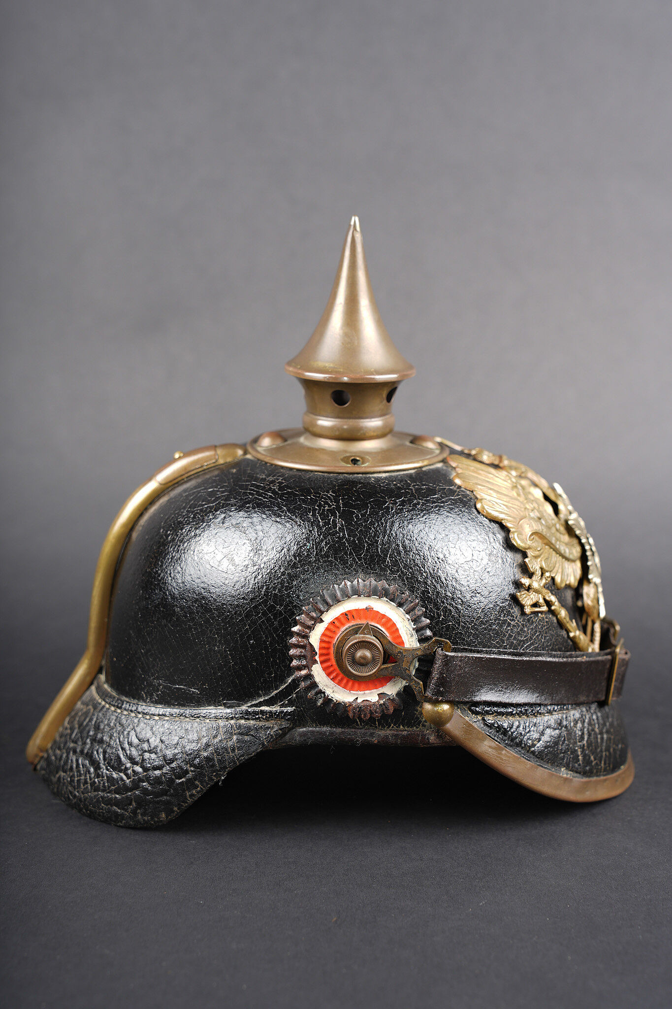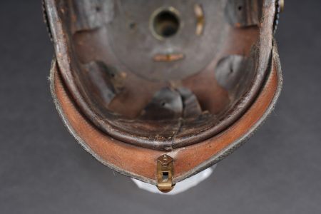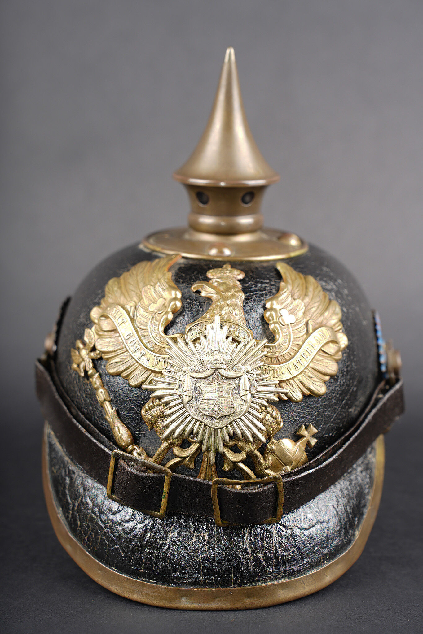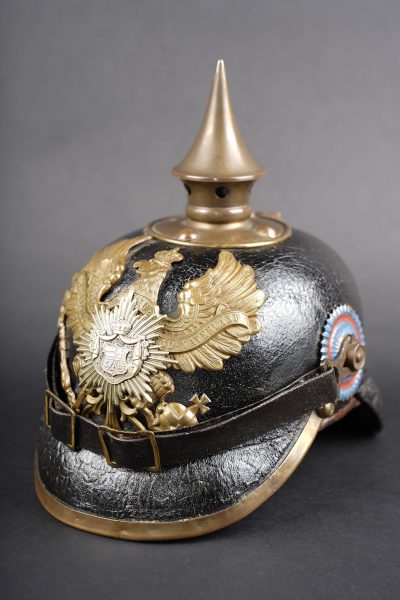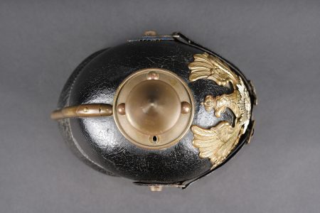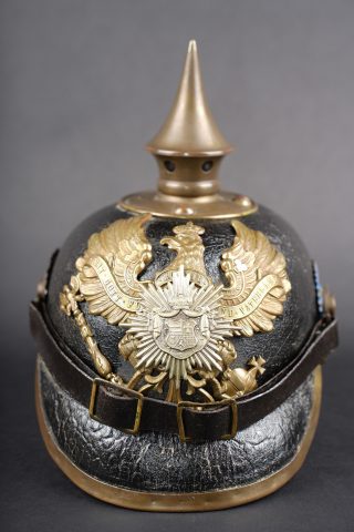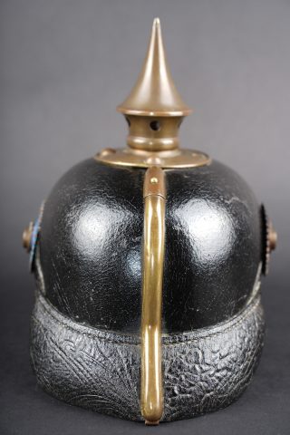 Détails de la vente >Casque à pointe M1895 troupe du Oldenburg. Bombe en cuir noirci, non repercée. Toutes garnitures laiton. Plaque à l’aigle prussien, fixation par tiges filetées fendues, soudées... en savoir plus