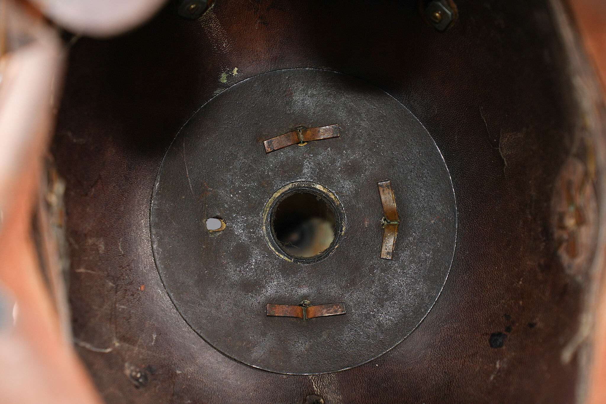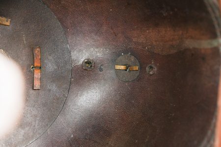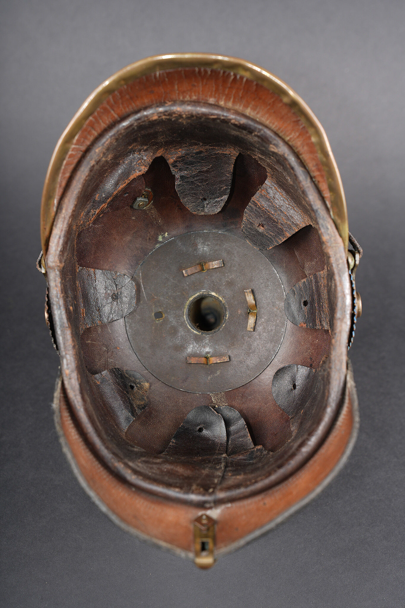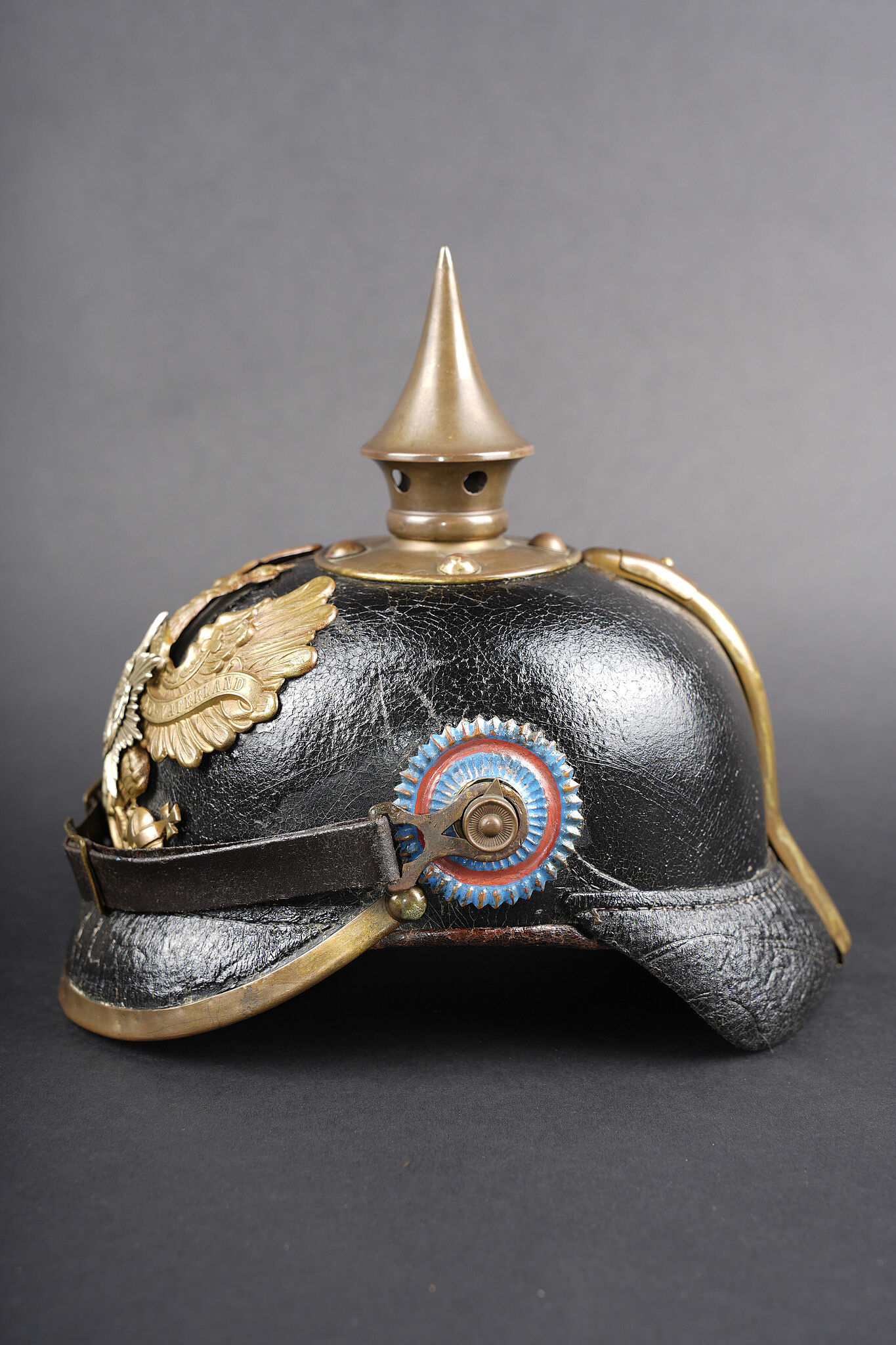 Détails de la vente >Casque à pointe M1895 troupe du Oldenburg. Bombe en cuir noirci, non repercée. Toutes garnitures laiton. Plaque à l’aigle prussien, fixation par tiges filetées fendues, soudées... en savoir plus