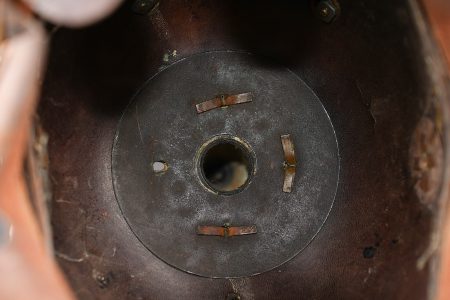 Casque à pointe M1895 troupe du Oldenburg. Bombe en cuir noirci, non repercée. Toutes garnitures laiton. Plaque à l’aigle prussien, fixation par tiges filetées fendues, soudées d’origine, avec centre en maillechort aux armes du Oldenburg. Casque non marqué, mais probablement du OJR91. Jugulaire et cocardes sans garanties. Coiffe à dents de loup en cuir marron. Un rivet d’embase de pointe manquant. Usure d’usage, patine. Pickelhaube M1895 for other ranks of Oldenburg with blackened leather body not re pierced, all brass fittings, Prussian eagle plate fixed by split threaded posts originally soldered, with nickel silver Oldenburg centre. Helmet unmarked but probably from OJR91. Chinstrap and cockades without guarantee. Brown leather wolf tooth liner. One spike base rivet missing. Service wear and patina.