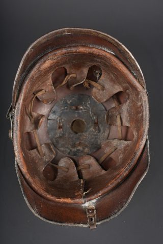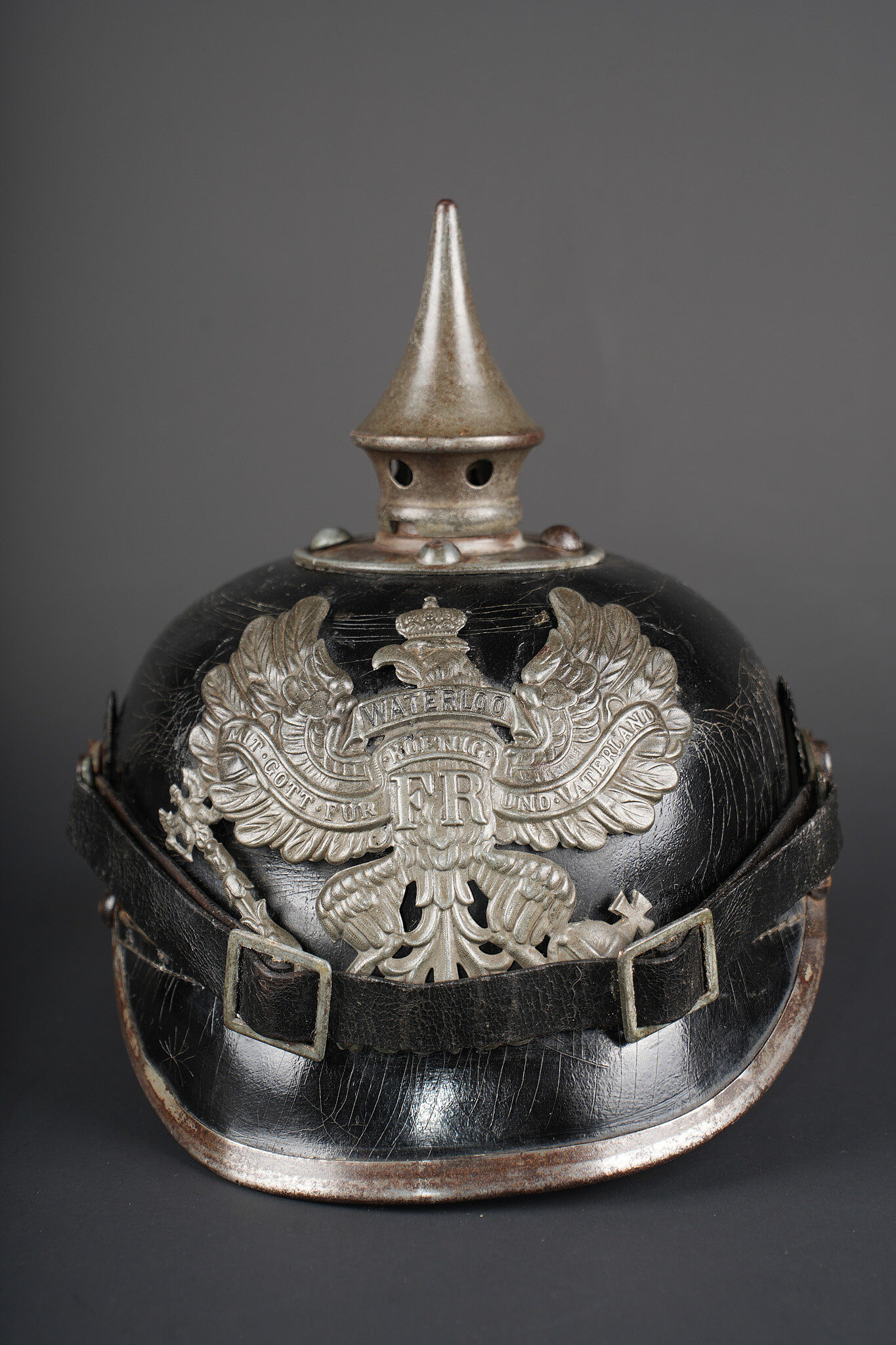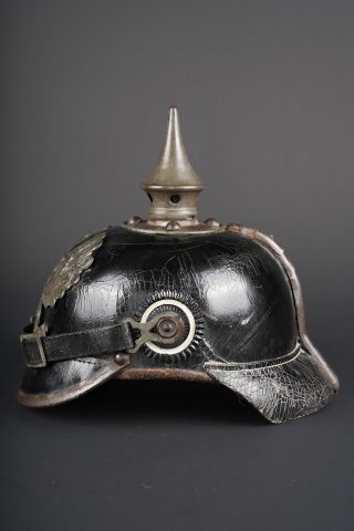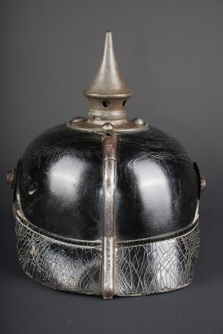 Détails de la vente >Casque à pointe M1915 troupe du Hanovre. Bombe en cuir non repercée. Pas de marquage visible. Garnitures fer peintes feldgrau. Plaque monobloc à banderole WATERLOO, pontets soudés... en savoir plus