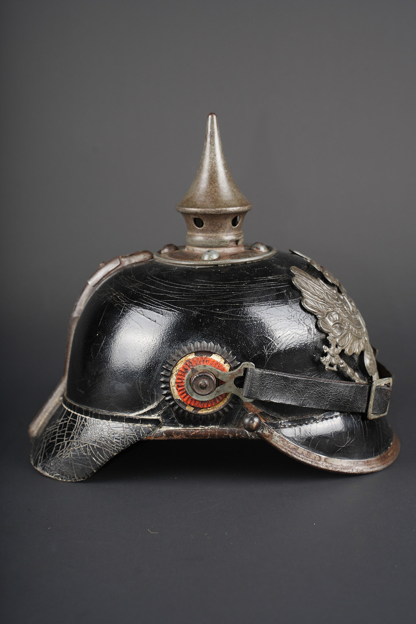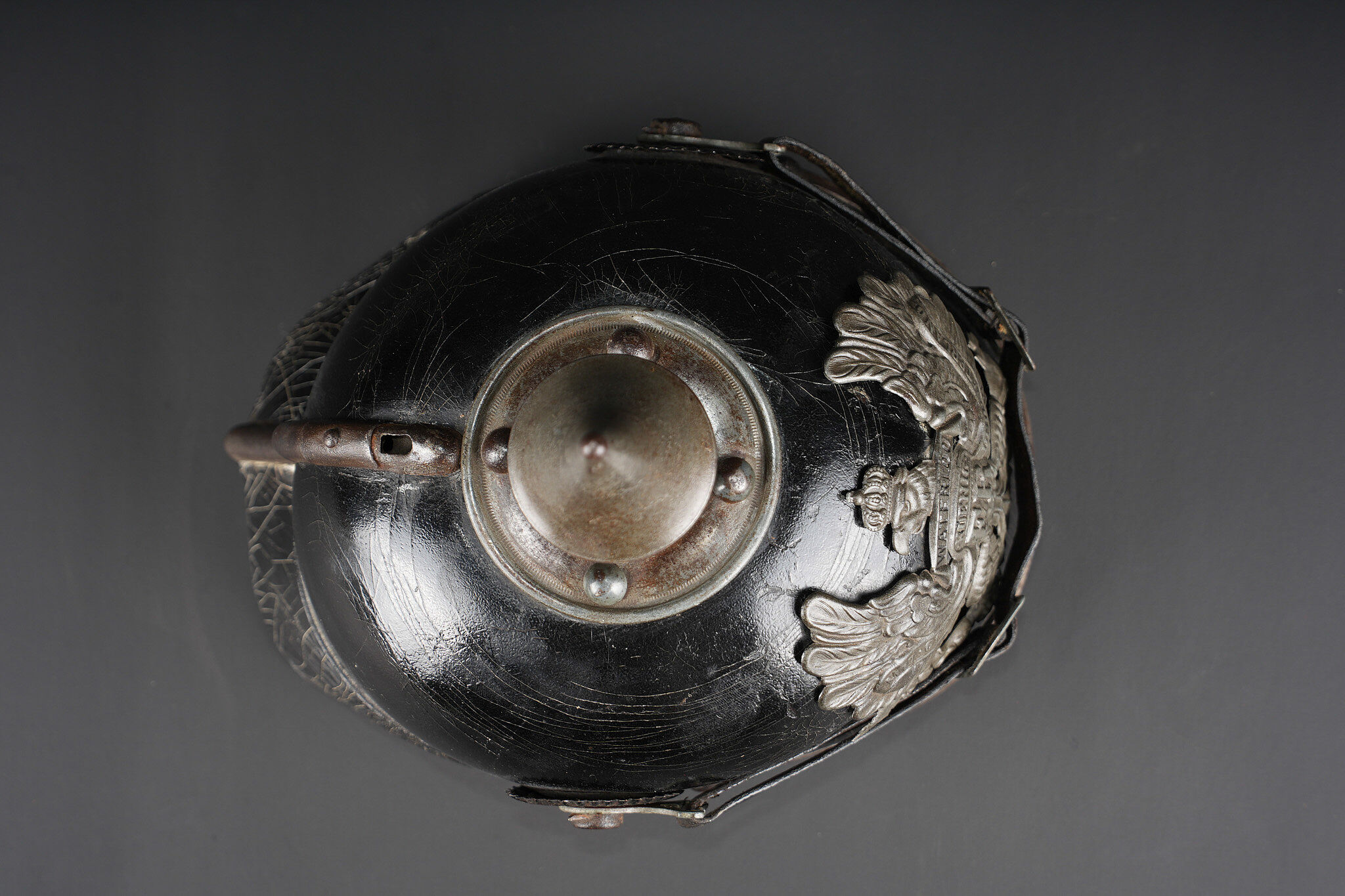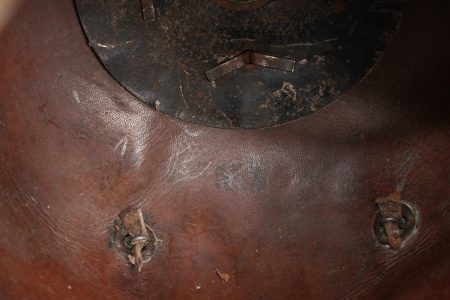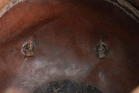 Casque à pointe M1915 troupe du Hanovre. Bombe en cuir non repercée. Pas de marquage visible. Garnitures fer peintes feldgrau. Plaque monobloc à banderole WATERLOO, pontets soudés d’origine et belle empreinte dans la bombe. Pointe amovible. Coiffe à dents de loup en cuir marron. Cocardes et jugulaire de bel aspect, sans garantie. Usure d’usage, patine. Hanoverian Pickelhaube M1915 for other ranks, leather shell not re pierced, no visible markings, steel fittings painted feldgrau, one piece plate with Waterloo scroll and original soldered loops leaving a strong imprint in the shell, removable spike, brown leather wolf tooth liner. Cockades and chinstrap attractive but not guaranteed original. Service wear and patina.