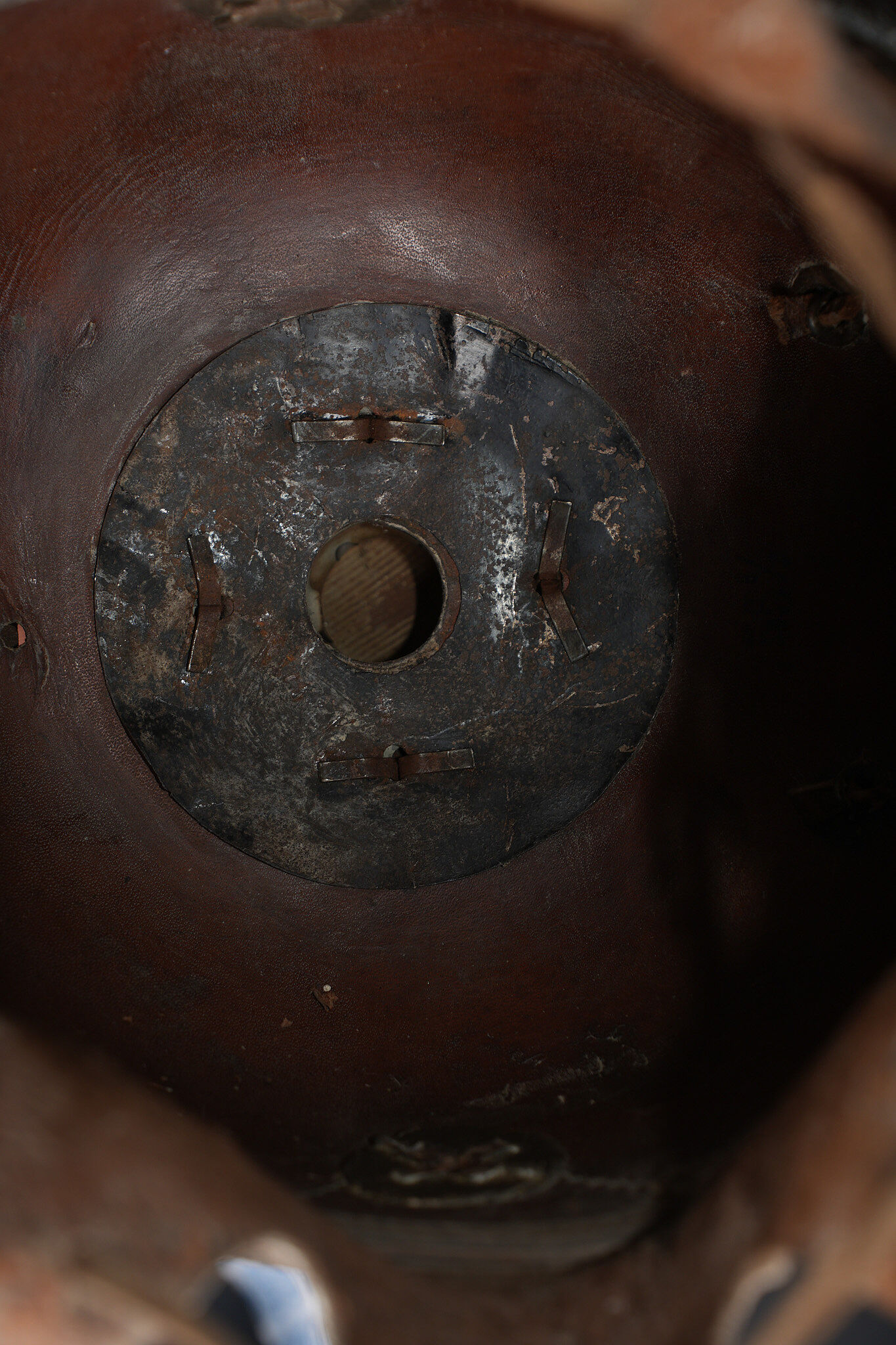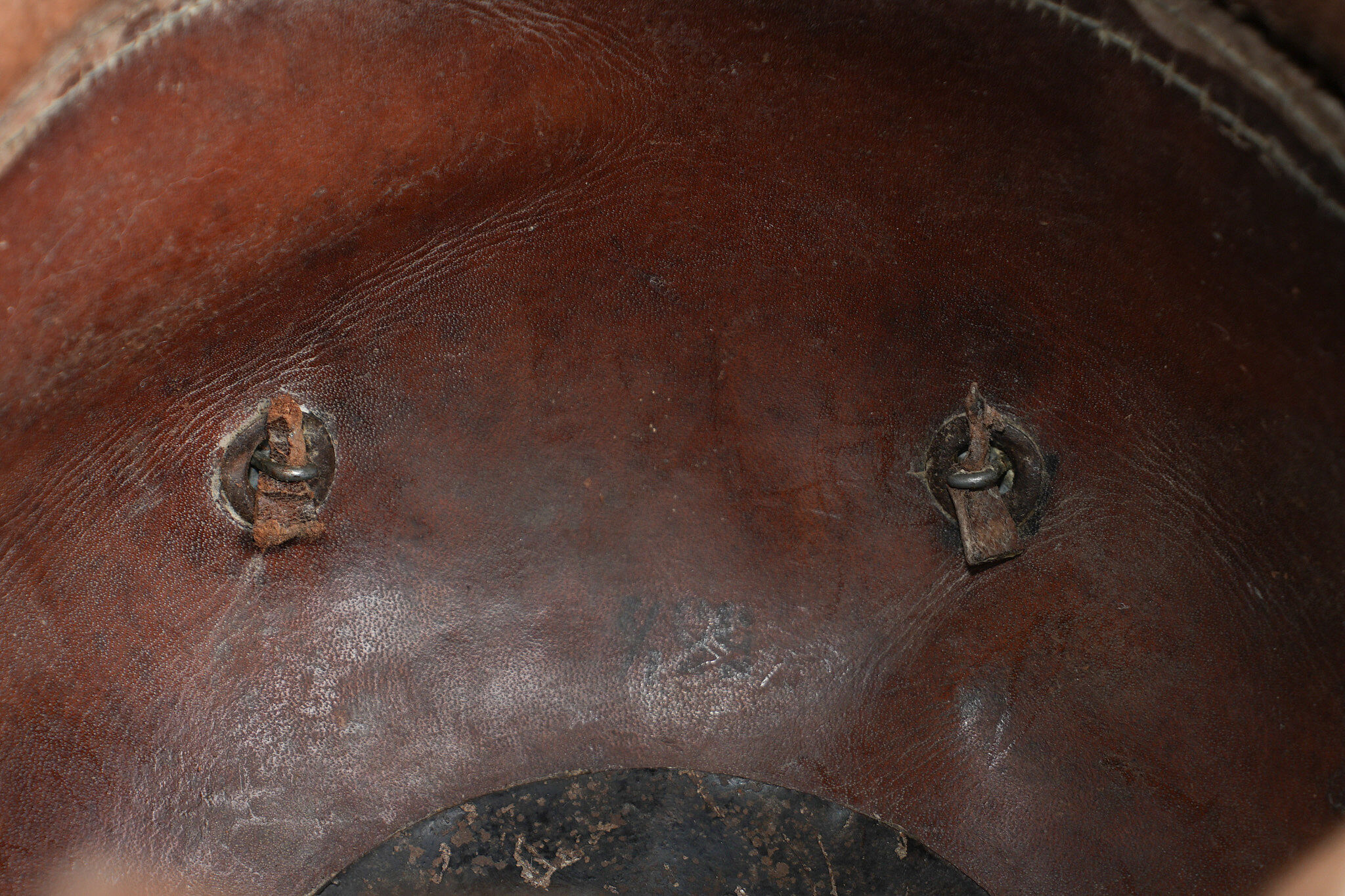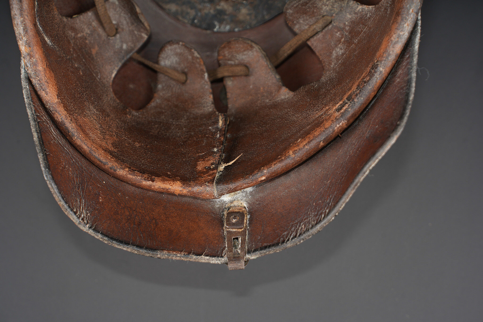Casque à pointe M1915 troupe du Hanovre. Bombe en cuir non repercée. Pas de marquage visible. Garnitures fer peintes feldgrau. Plaque monobloc à banderole WATERLOO, pontets soudés d’origine et belle empreinte dans la bombe. Pointe amovible. Coiffe à dents de loup en cuir marron. Cocardes et jugulaire de bel aspect, sans garantie. Usure d’usage, patine. Hanoverian Pickelhaube M1915 for other ranks, leather shell not re pierced, no visible markings, steel fittings painted feldgrau, one piece plate with Waterloo scroll and original soldered loops leaving a strong imprint in the shell, removable spike, brown leather wolf tooth liner. Cockades and chinstrap attractive but not guaranteed original. Service wear and patina.