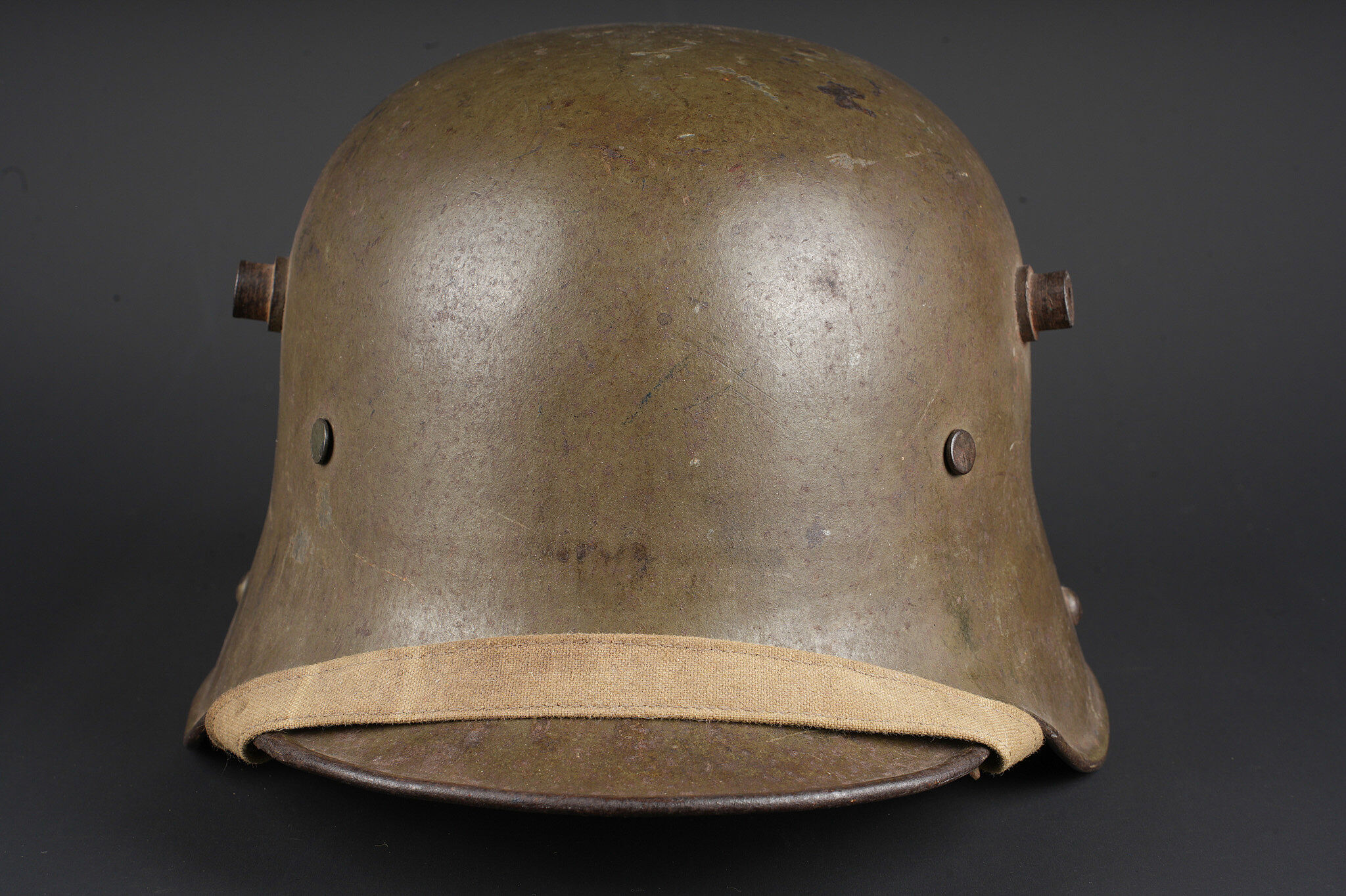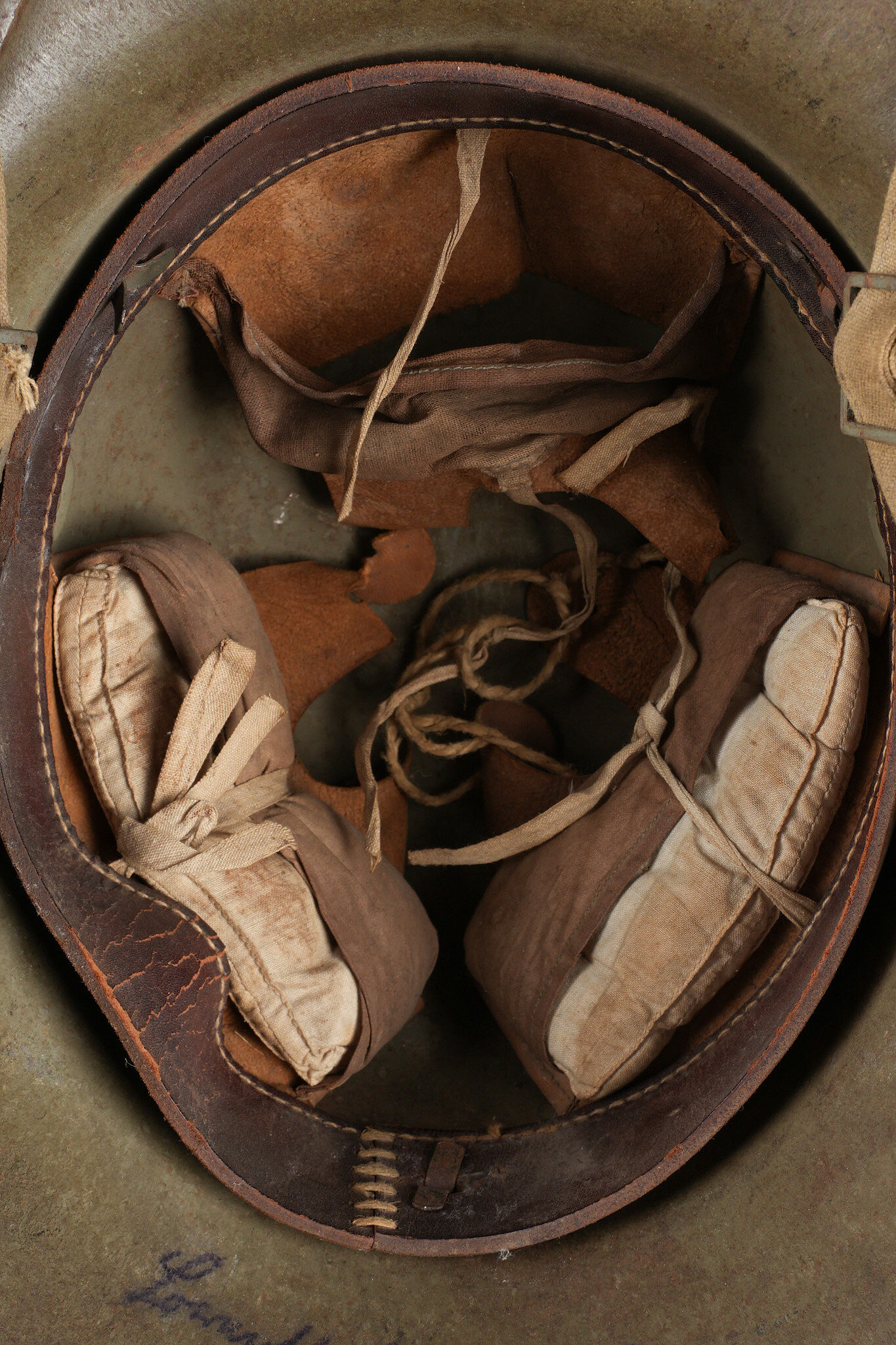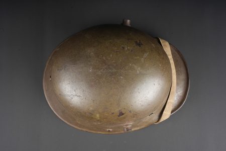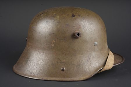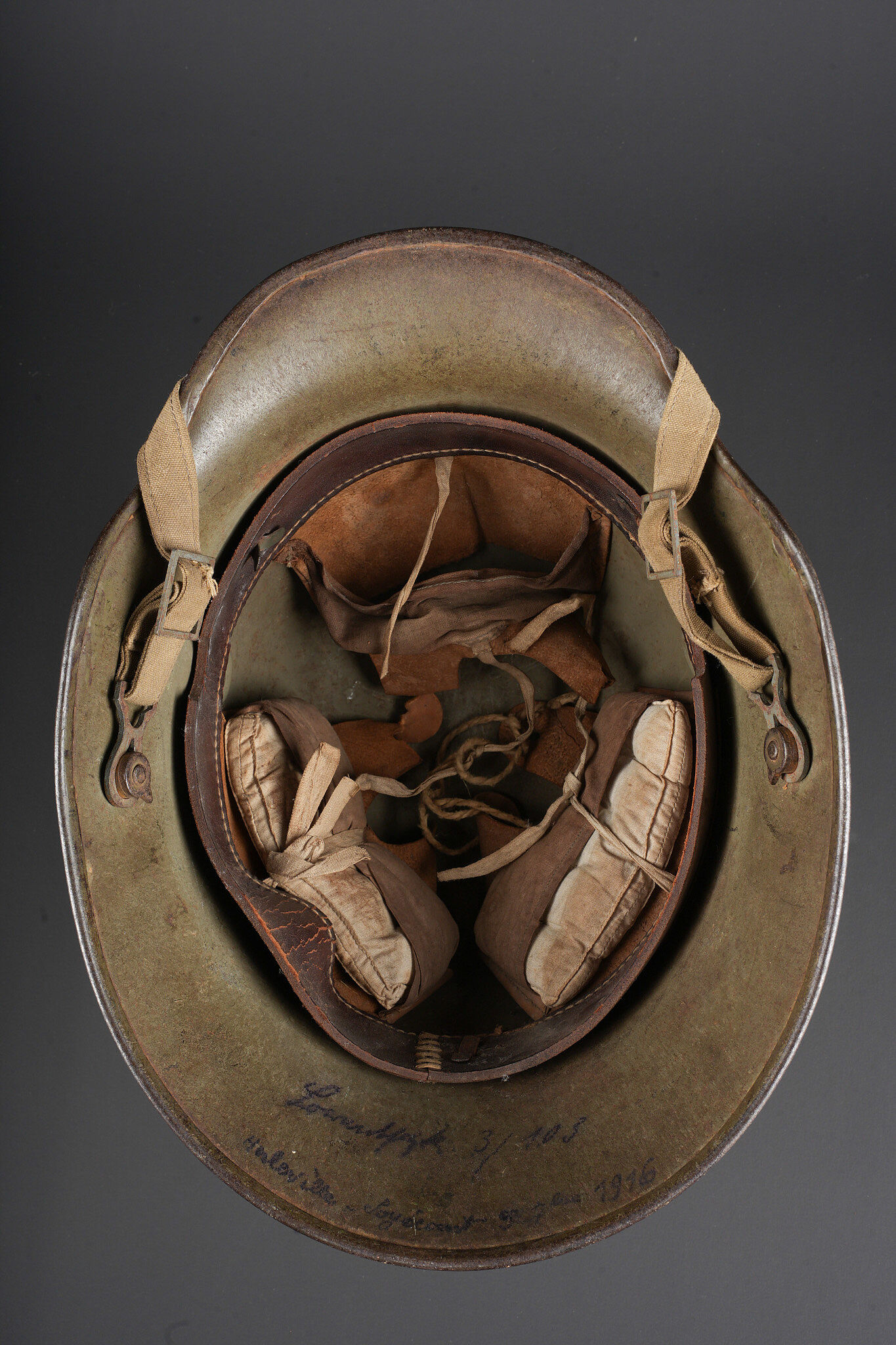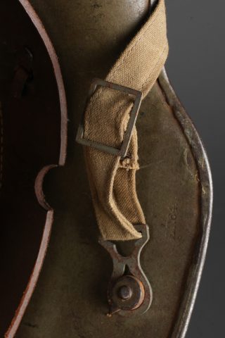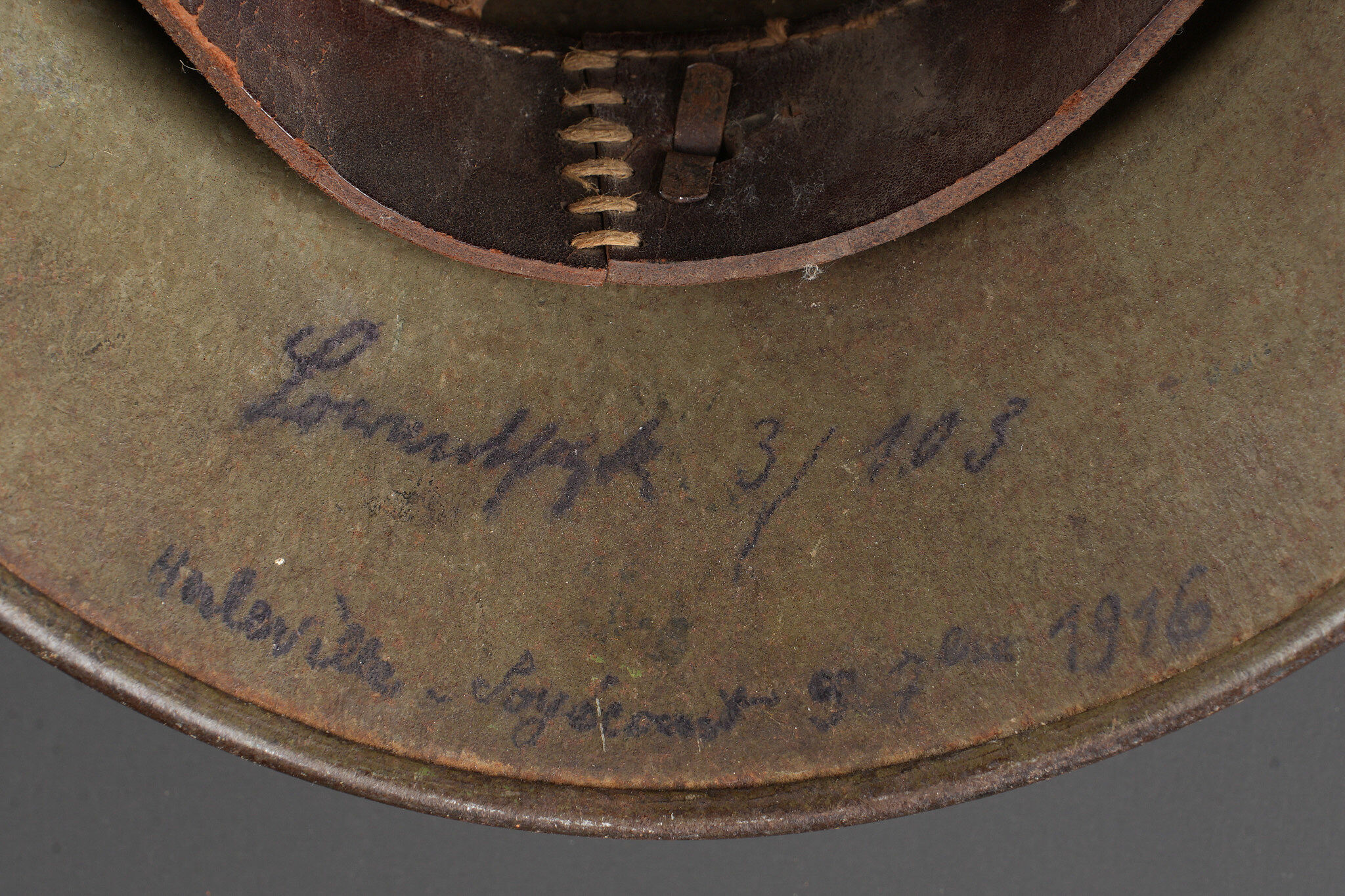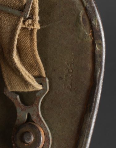 Casque allemand Stahlhelm M1916 du 103e régiment saxon et jugulaire toile. Beau Stahlhelm M16 fabricant E.T. taille 64 avec une belle peinture Feldgrau. Coiffe M1916 sur bandeau cuir Les panneaux de cuir sont présent, l’un a une coupure. 2 des coussinets de crin présent. Joli marquage sur la nuquière avec un nom, affectation 3/103 pour 3e Compagnie du RJR103 saxon. Marquage français indiquant la capture du casque à Herleville Soyécourt (dans la Somme) le 5 septembre 1916. A cette période, le seul régiment 103 présent sur ce secteur est le RJR103 de la 58ID. Equipé d’une jugulaire en toile feldgrau, sans garantie. Usure d’usage, patine. Stahlhelm M1916 fine M16 helmet by Eisenhüttenwerke Thale size 64 with attractive feldgrau paint. M1916 liner on leather band, all leather tongues present with one cut, two horsehair pads retained. Rear visor marked with a name and unit notation 3/103, corresponding to the 3rd Company of Reserve Infantry Regiment Nr 103. French inscription records capture at Herleville-Soyécourt on 5 September 1916. At that date the only regiment 103 in that sector was the RJR103 of the 58th Infantry Division. Fitted with one feldgrau canvas chinstrap, authenticity not guaranteed. Service wear and patina