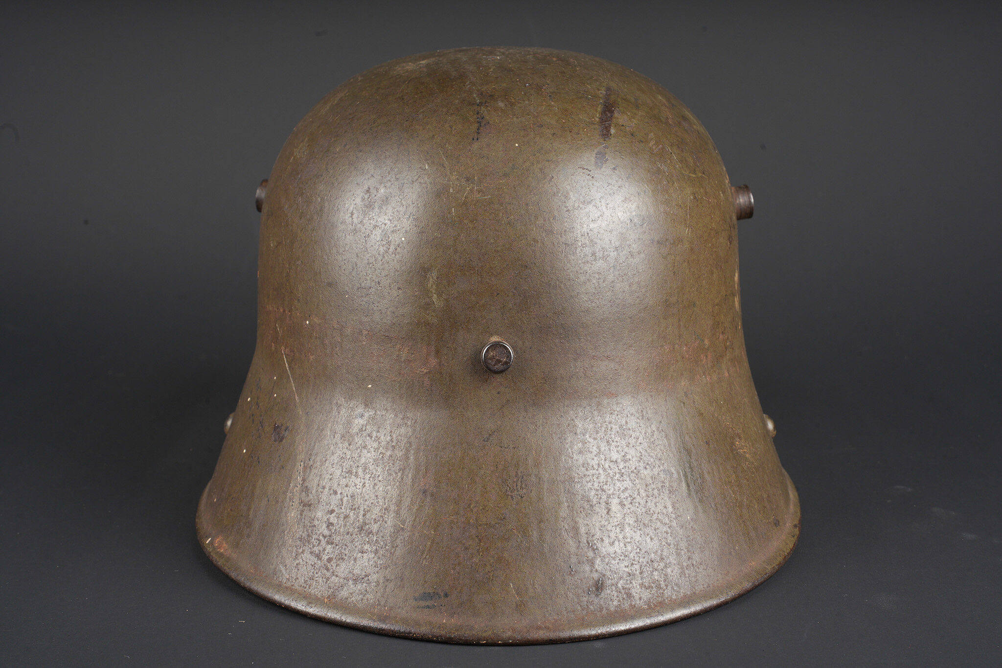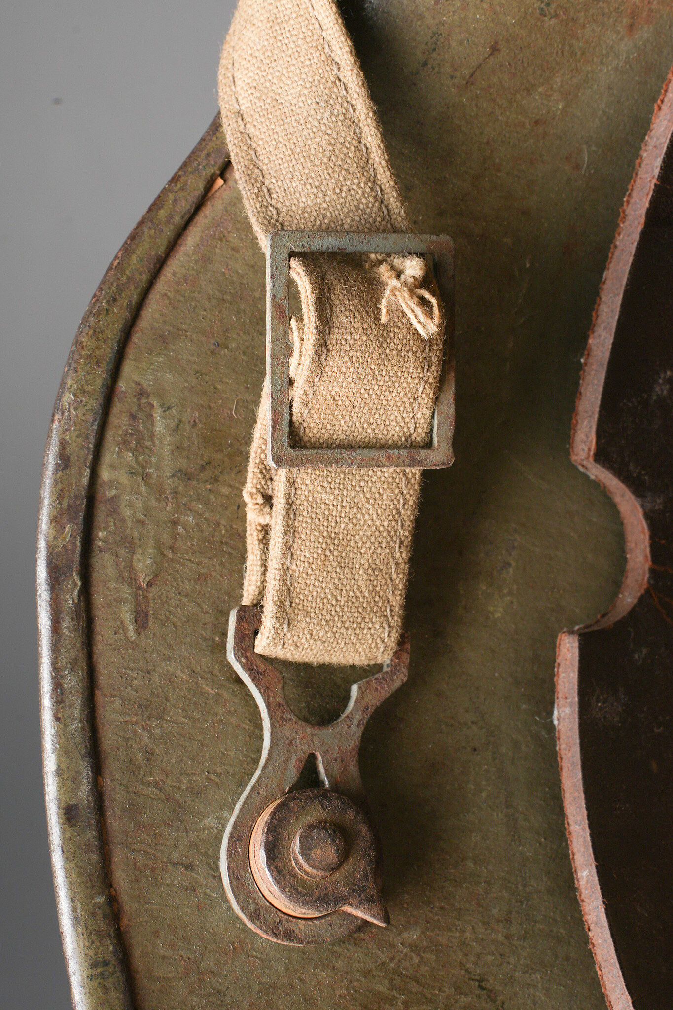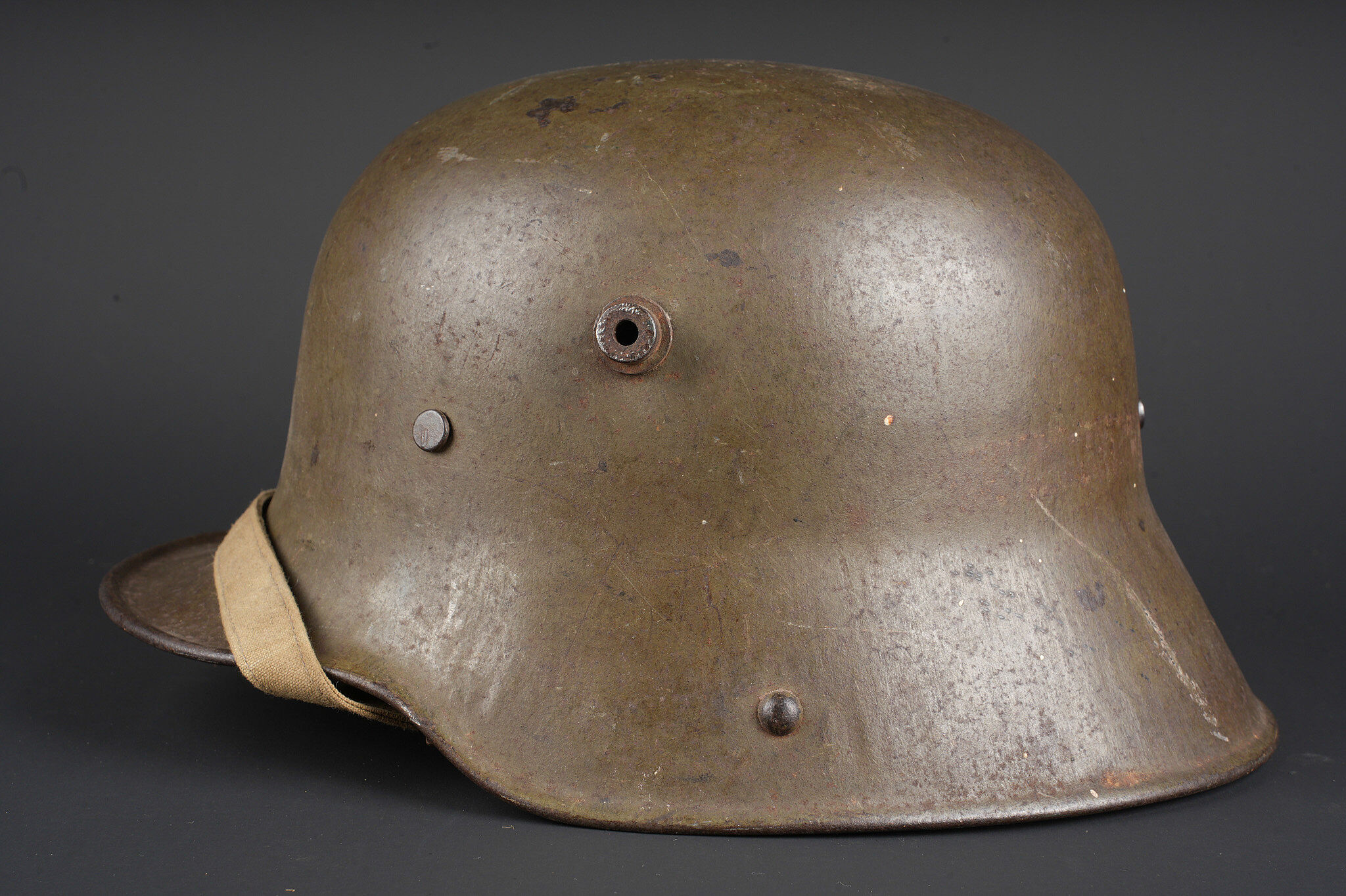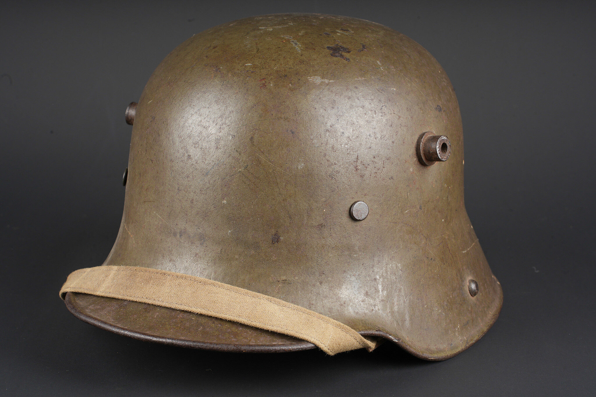 Casque allemand Stahlhelm M1916 du 103e régiment saxon et jugulaire toile. Beau Stahlhelm M16 fabricant E.T. taille 64 avec une belle peinture Feldgrau. Coiffe M1916 sur bandeau cuir Les panneaux de cuir sont présent, l’un a une coupure. 2 des coussinets de crin présent. Joli marquage sur la nuquière avec un nom, affectation 3/103 pour 3e Compagnie du RJR103 saxon. Marquage français indiquant la capture du casque à Herleville Soyécourt (dans la Somme) le 5 septembre 1916. A cette période, le seul régiment 103 présent sur ce secteur est le RJR103 de la 58ID. Equipé d’une jugulaire en toile feldgrau, sans garantie. Usure d’usage, patine. Stahlhelm M1916 fine M16 helmet by Eisenhüttenwerke Thale size 64 with attractive feldgrau paint. M1916 liner on leather band, all leather tongues present with one cut, two horsehair pads retained. Rear visor marked with a name and unit notation 3/103, corresponding to the 3rd Company of Reserve Infantry Regiment Nr 103. French inscription records capture at Herleville-Soyécourt on 5 September 1916. At that date the only regiment 103 in that sector was the RJR103 of the 58th Infantry Division. Fitted with one feldgrau canvas chinstrap, authenticity not guaranteed. Service wear and patina