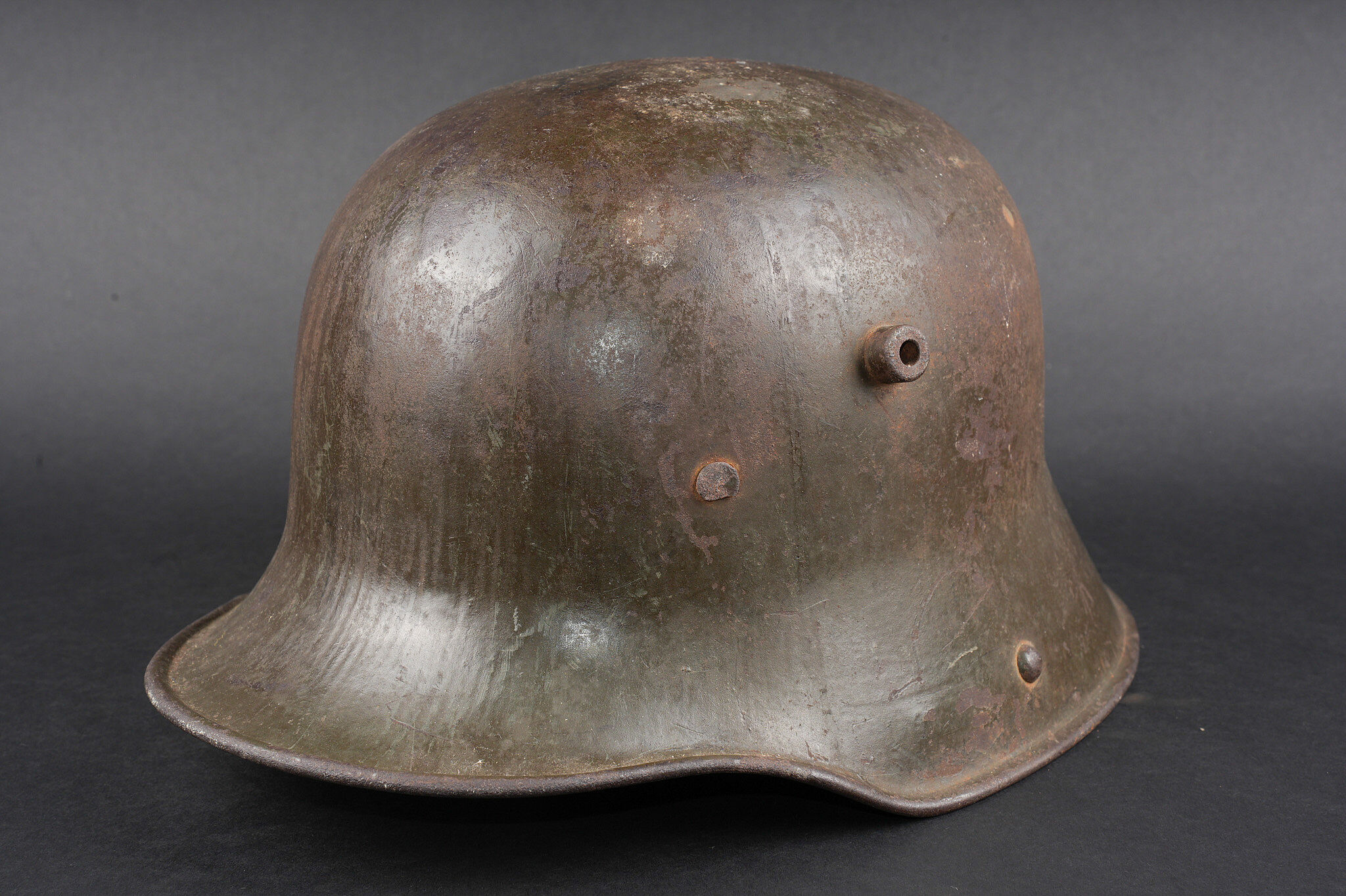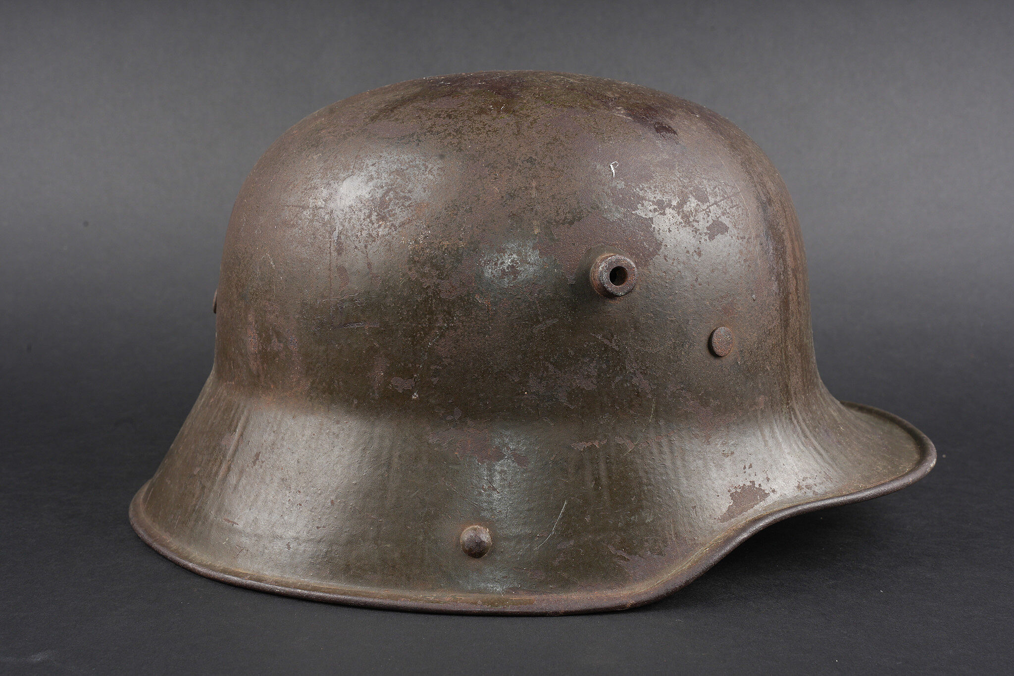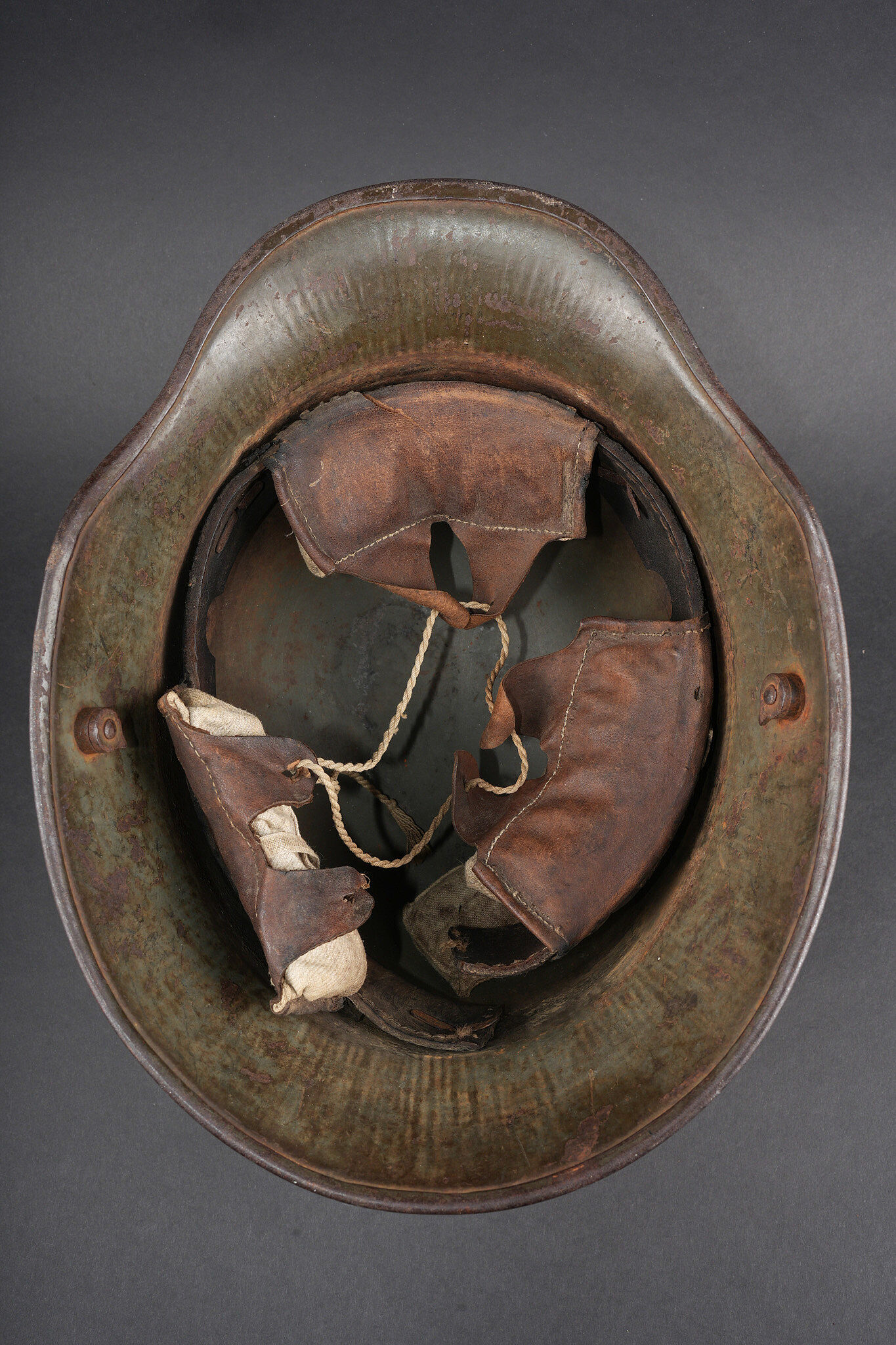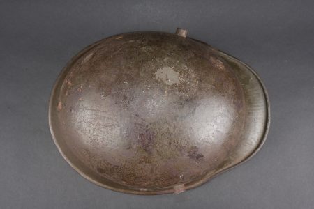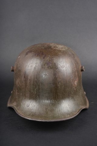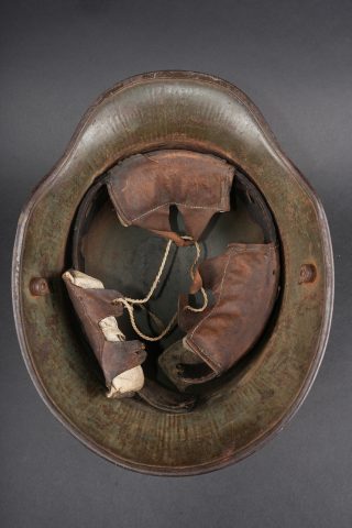 Casque allemand Stahlhelm M1916 Feldgrau. Coque de taille 66, fabricant illisible, avec encore une bonne part de sa peinture feldgrau. Coiffe M1916 sur bandeau cuir, la couture arrière de ce dernier a cédé. Les panneaux de cuir sont présent, un peu secs. Coussinets présents. Rivets fixés d’origine. Dans son jus. Stahlhelm M1916 shell size 66, maker unreadable, retaining a good portion of original feldgrau paint. M1916 liner on leather band, rear seam detached. Leather tongues present, somewhat dry. Pads present. Original rivets intact. Untouched condition