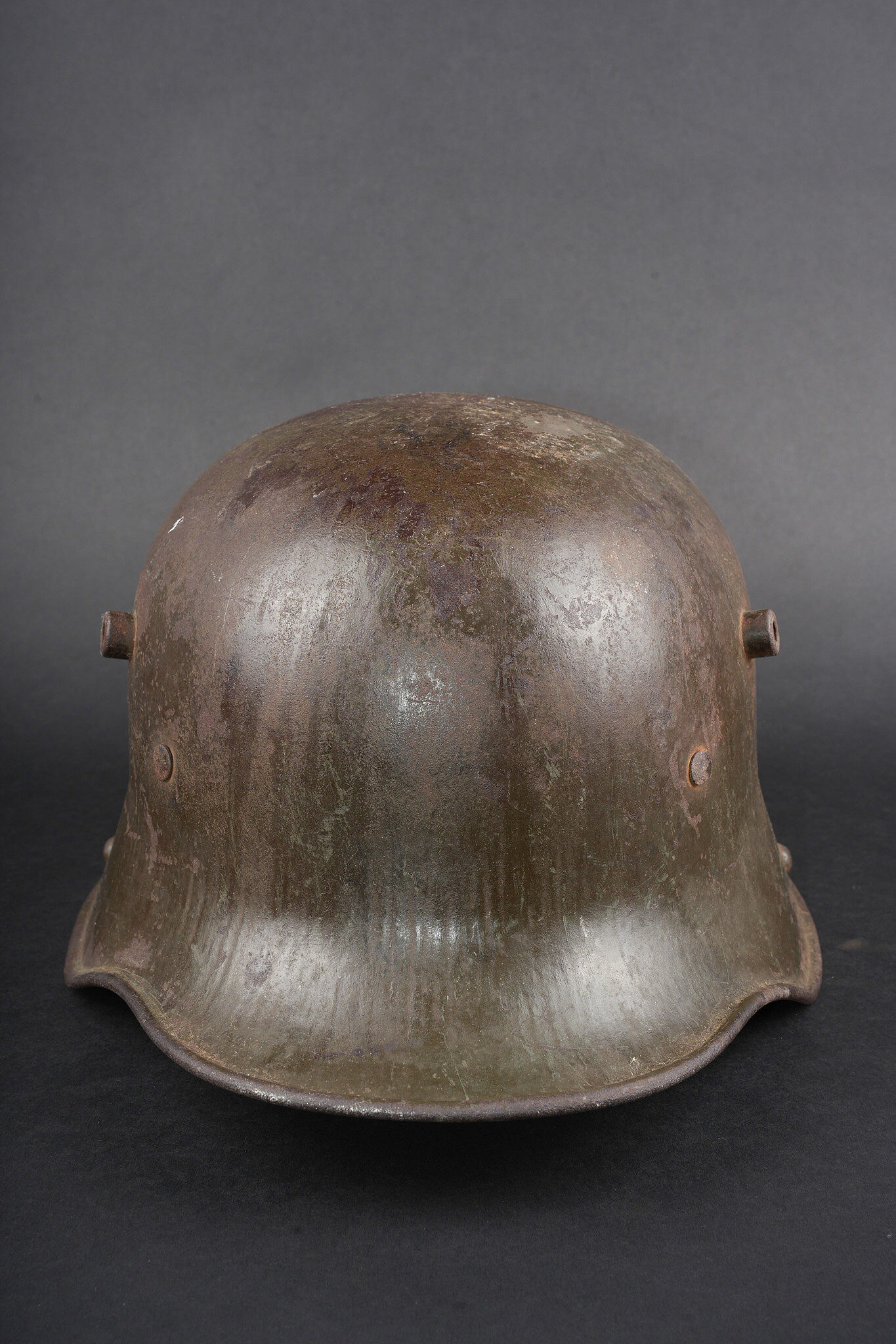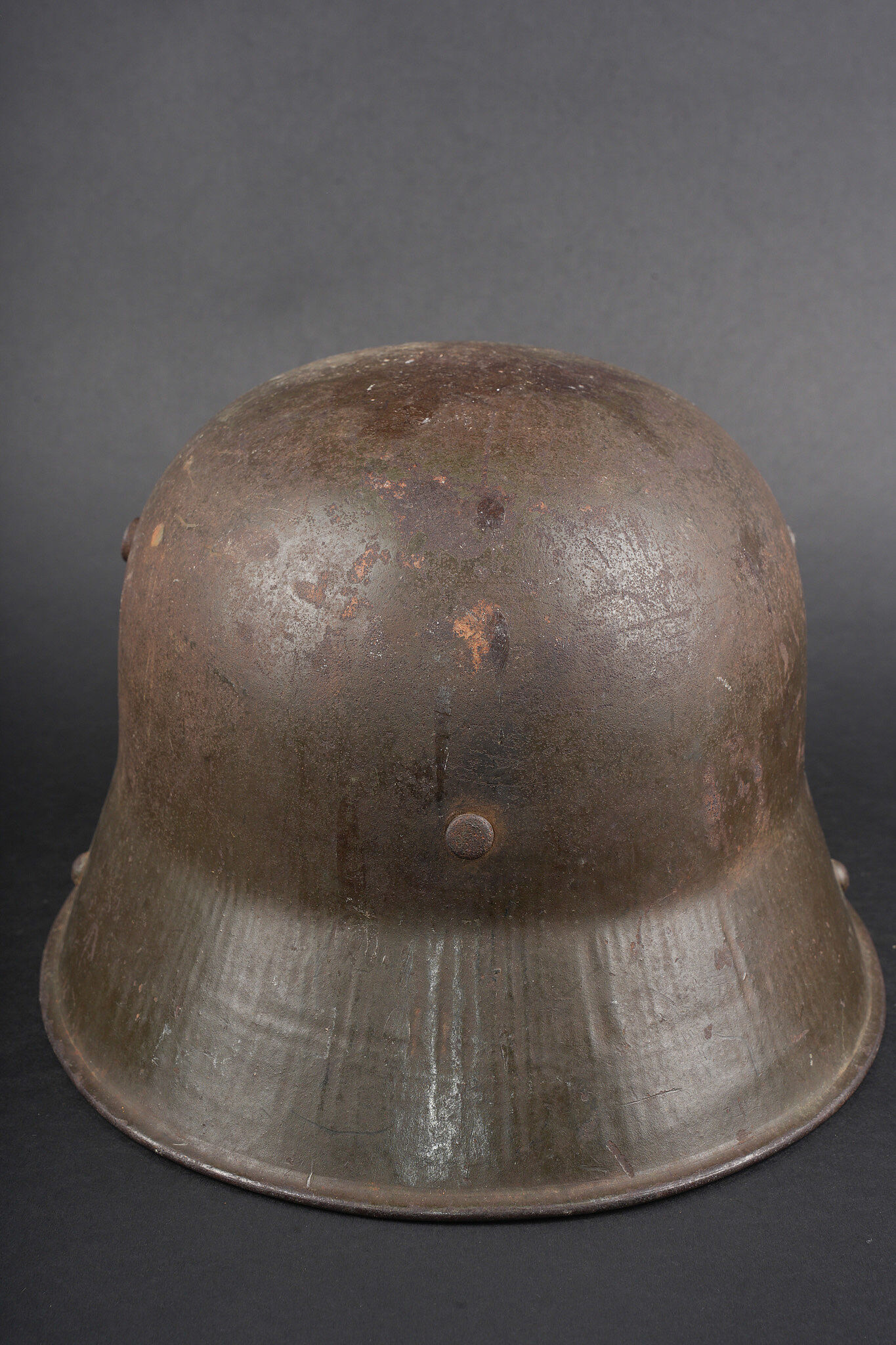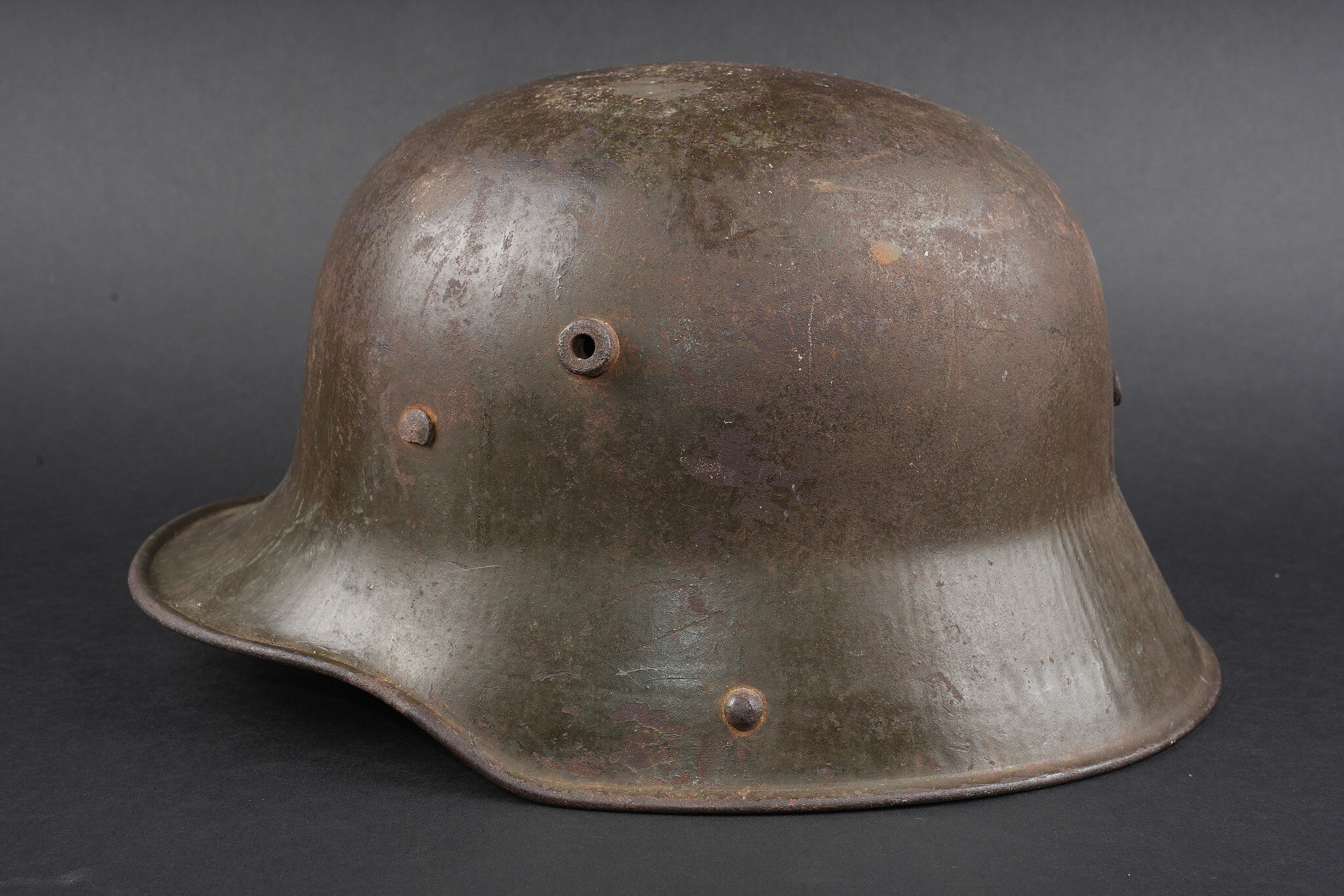 Casque allemand Stahlhelm M1916 Feldgrau. Coque de taille 66, fabricant illisible, avec encore une bonne part de sa peinture feldgrau. Coiffe M1916 sur bandeau cuir, la couture arrière de ce dernier a cédé. Les panneaux de cuir sont présent, un peu secs. Coussinets présents. Rivets fixés d’origine. Dans son jus. Stahlhelm M1916 shell size 66, maker unreadable, retaining a good portion of original feldgrau paint. M1916 liner on leather band, rear seam detached. Leather tongues present, somewhat dry. Pads present. Original rivets intact. Untouched condition
