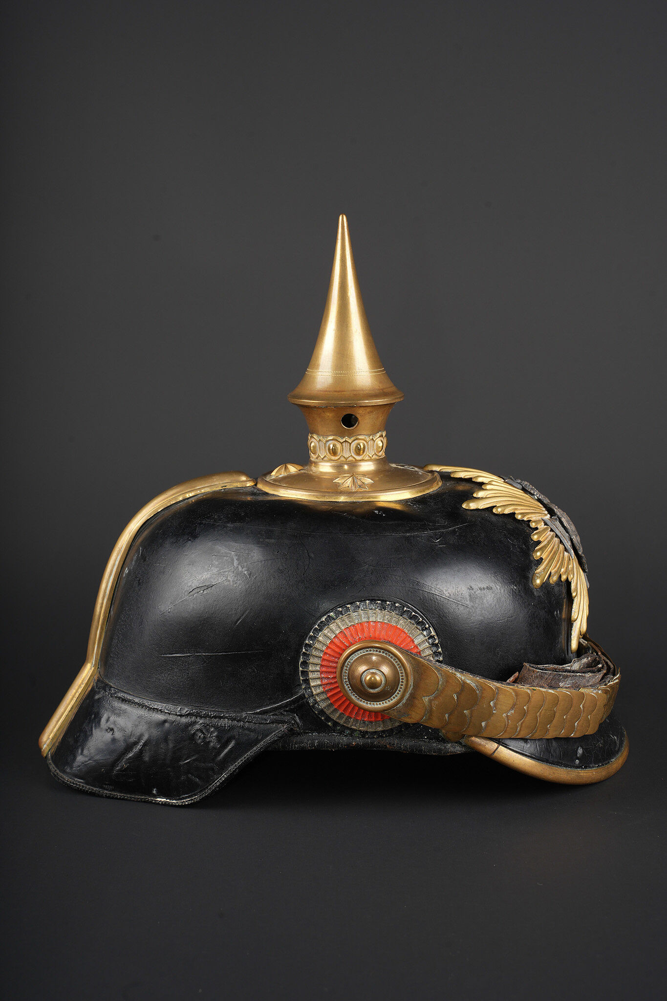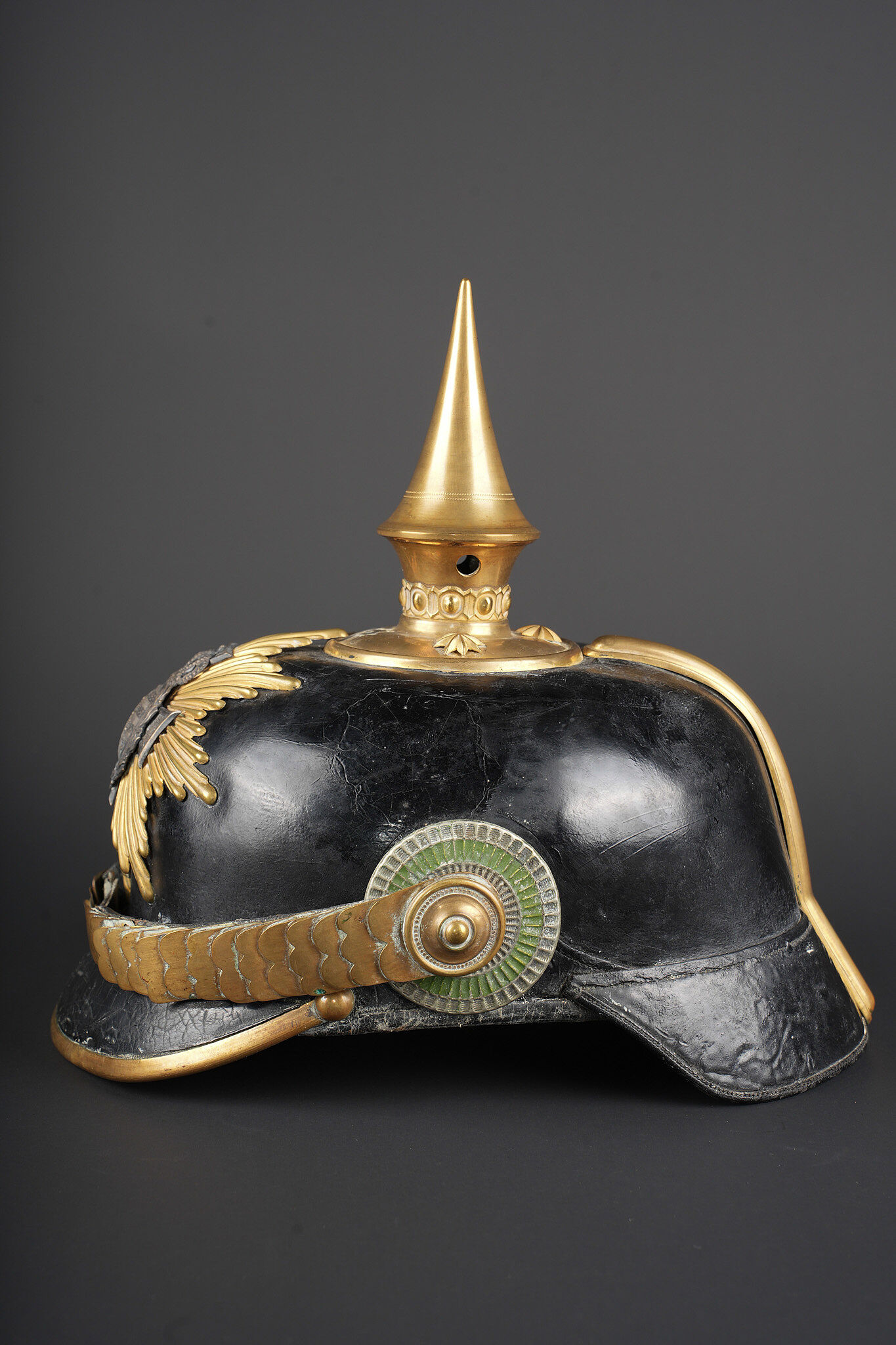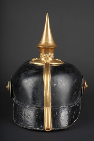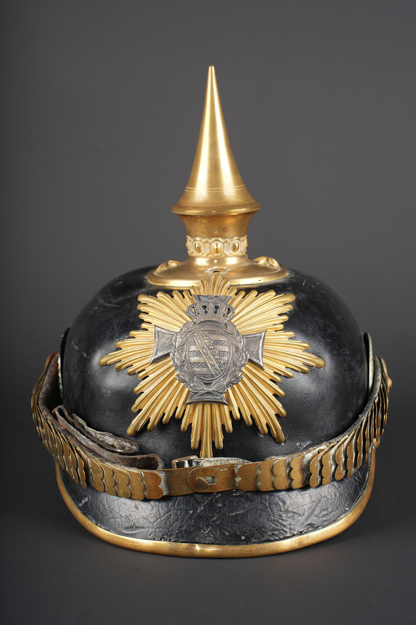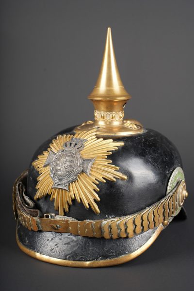 Casque du 101ème régiment de Grenadiers du royaume de Saxe – modèle 1871-99 d’officier de réserve. Ce casque est dans la forme basse et cylindrique en vogue pour les casques d’officiers de l’empire allemand vers 1900-1910. La bombe est en bel état, ainsi que la visière doublée de chagrin vert et la nuquière doublée de chagrin rouge. Le bandeau de sudation en cuir et la coiffe en soie écrue sont bien présents. La plaque au soleil rayonnant est en laiton doré avec les armoiries du royaume de saxe en maillechort reposant sur la croix de réserve de même matière. Elle est parfaitement plaquée sur le devant de la bombe qui n’est pas repercée. La pointe se dévisse, ce qui caractérise le seul régiment d’infanterie du royaume de Saxe à porter un haarbusch (noir) en tenue de parade avec le 100ème régiment de Grenadiers également appelé 1.Leib-Grenadier-regiment n°100 mais dont les garnitures sont maillechort argentées. On note qu’une étoile de fixation de l’embase de la pointe est absente sur le devant. Les cocardes sont au bon modèle d’officier et non dentelées comme il se doit pour ce royaume. La paire de jugulaires à écailles plates ne présente aucun manque. Belle coiffure ayant appartenu à un officier du corps des unités de réserve du royaume de Saxe sous le règne de l’empereur Guillaume II. Saxon reserve officer Pickelhaube of Grenadier Regiment Nr 101 reserve officer model 1871 to 1899. Low cylindrical shell in the style worn by German officers around 1900 to 1910. Shell in fine condition, visor lined in green leather and rear peak in red leather, leather sweatband and cream silk liner intact. Sunburst plate in gilt brass with arms of the Kingdom of Saxony in nickel silver mounted over a reserve cross of the same metal, perfectly seated on a shell that has not been re pierced. Removable spike, a feature specific to the only Saxon infantry regiment entitled to wear a black parade plume together with Grenadier Regiment Nr 100, whose fittings were silvered instead. One spike base star missing at the front. Correct officer cockades of non serrated Saxon pattern. Complete pair of flat scale chinstraps. Fine helmet from a reserve officer of the Saxon army under Wilhelm II