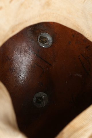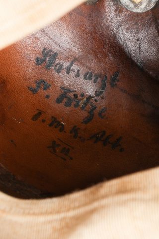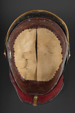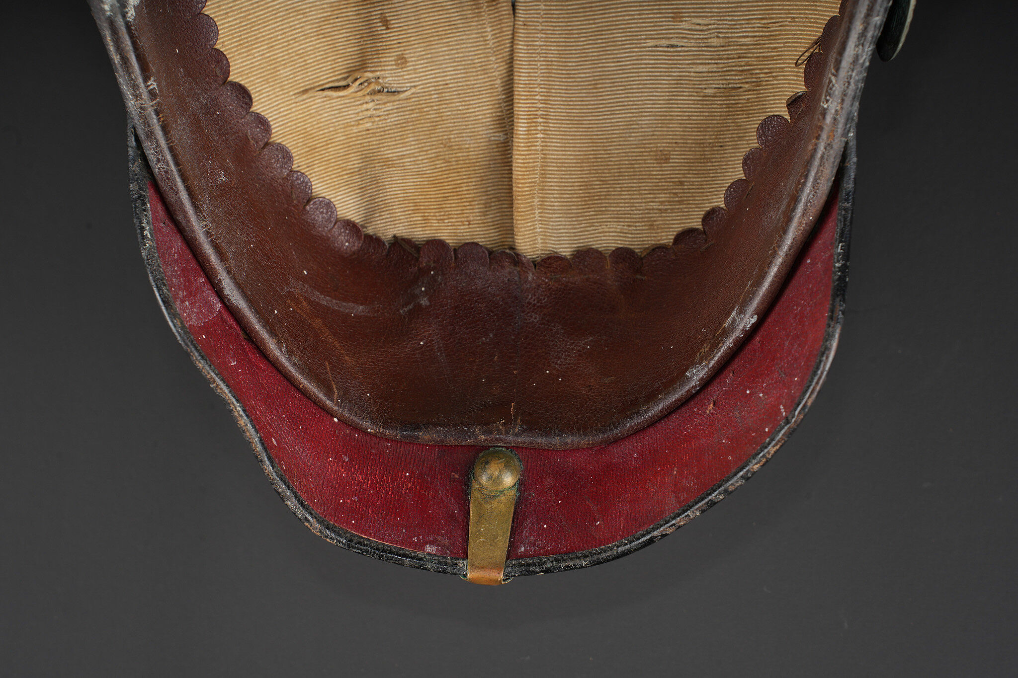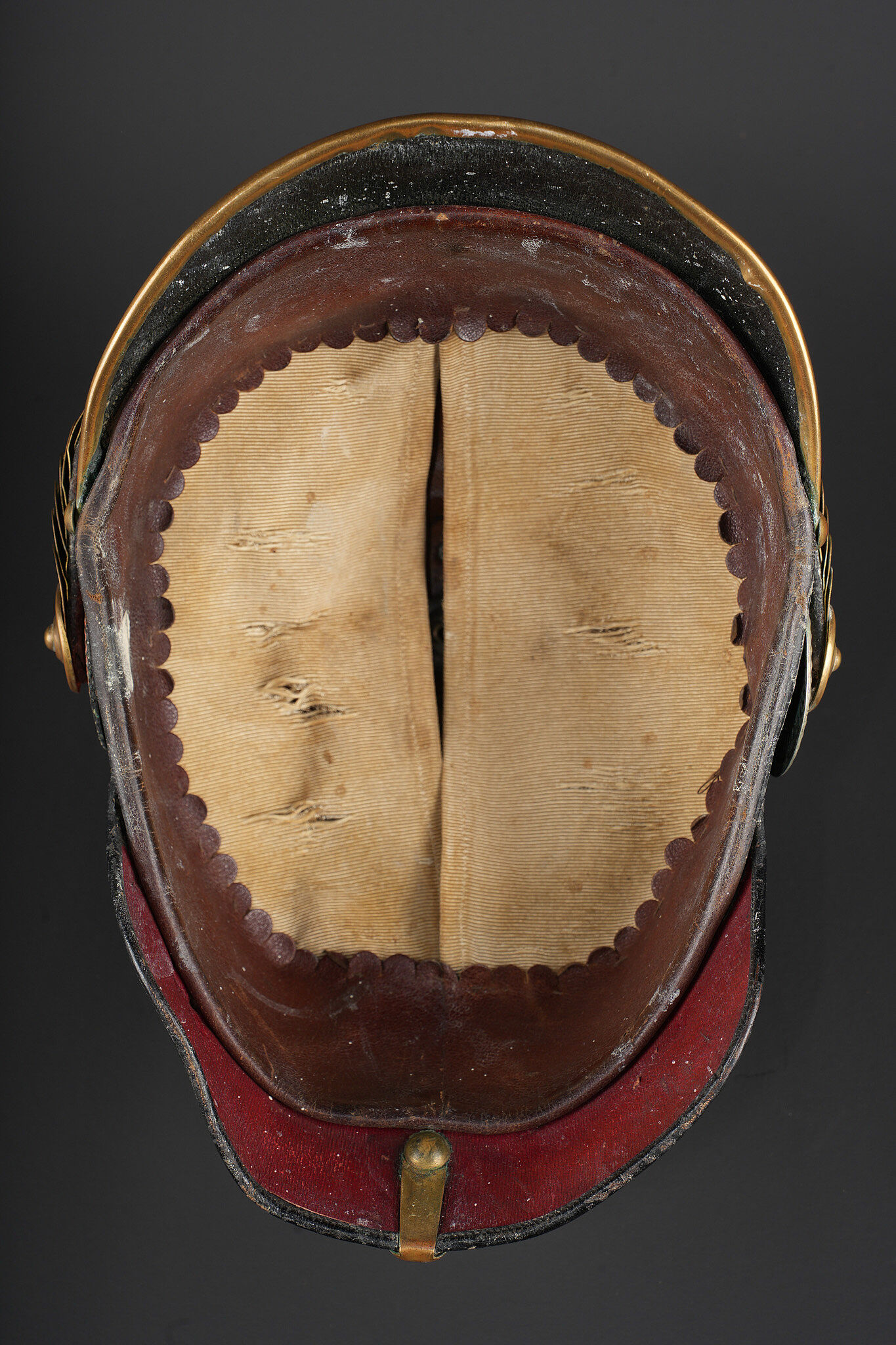 Casque du 101ème régiment de Grenadiers du royaume de Saxe – modèle 1871-99 d’officier de réserve. Ce casque est dans la forme basse et cylindrique en vogue pour les casques d’officiers de l’empire allemand vers 1900-1910. La bombe est en bel état, ainsi que la visière doublée de chagrin vert et la nuquière doublée de chagrin rouge. Le bandeau de sudation en cuir et la coiffe en soie écrue sont bien présents. La plaque au soleil rayonnant est en laiton doré avec les armoiries du royaume de saxe en maillechort reposant sur la croix de réserve de même matière. Elle est parfaitement plaquée sur le devant de la bombe qui n’est pas repercée. La pointe se dévisse, ce qui caractérise le seul régiment d’infanterie du royaume de Saxe à porter un haarbusch (noir) en tenue de parade avec le 100ème régiment de Grenadiers également appelé 1.Leib-Grenadier-regiment n°100 mais dont les garnitures sont maillechort argentées. On note qu’une étoile de fixation de l’embase de la pointe est absente sur le devant. Les cocardes sont au bon modèle d’officier et non dentelées comme il se doit pour ce royaume. La paire de jugulaires à écailles plates ne présente aucun manque. Belle coiffure ayant appartenu à un officier du corps des unités de réserve du royaume de Saxe sous le règne de l’empereur Guillaume II. Saxon reserve officer Pickelhaube of Grenadier Regiment Nr 101 reserve officer model 1871 to 1899. Low cylindrical shell in the style worn by German officers around 1900 to 1910. Shell in fine condition, visor lined in green leather and rear peak in red leather, leather sweatband and cream silk liner intact. Sunburst plate in gilt brass with arms of the Kingdom of Saxony in nickel silver mounted over a reserve cross of the same metal, perfectly seated on a shell that has not been re pierced. Removable spike, a feature specific to the only Saxon infantry regiment entitled to wear a black parade plume together with Grenadier Regiment Nr 100, whose fittings were silvered instead. One spike base star missing at the front. Correct officer cockades of non serrated Saxon pattern. Complete pair of flat scale chinstraps. Fine helmet from a reserve officer of the Saxon army under Wilhelm II