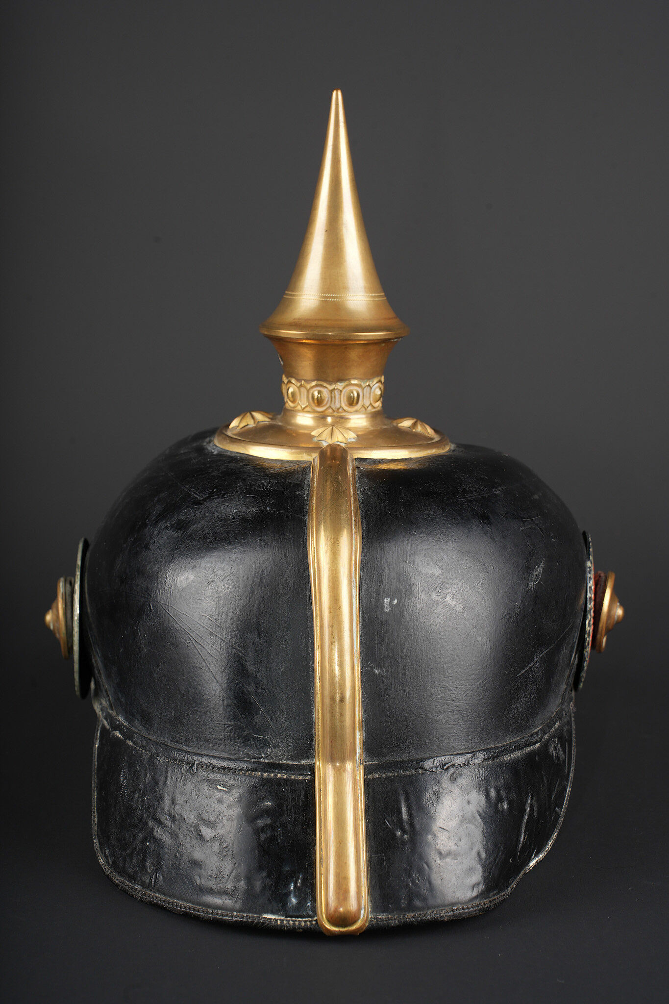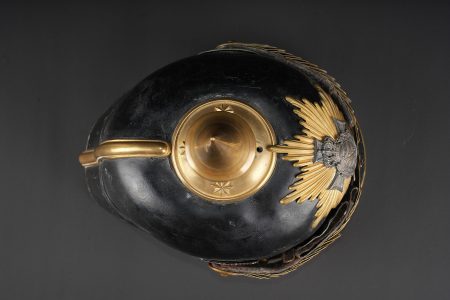 Détails de la vente >Casque du 101ème régiment de Grenadiers du royaume de Saxe – modèle 1871-99 d’officier de réserve. Ce casque est dans la forme basse et cylindrique en vogue pour les casques... en savoir plus