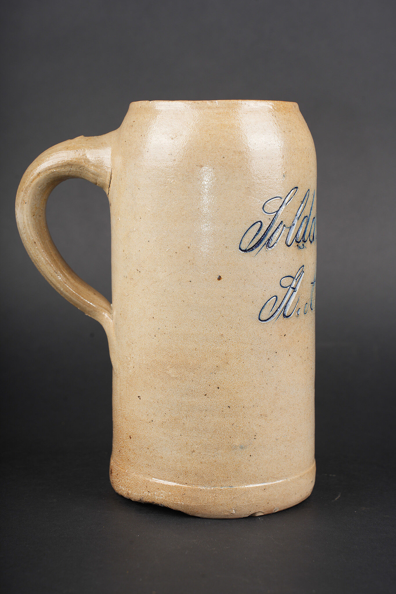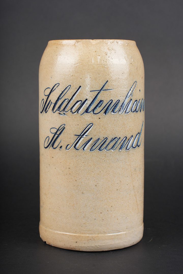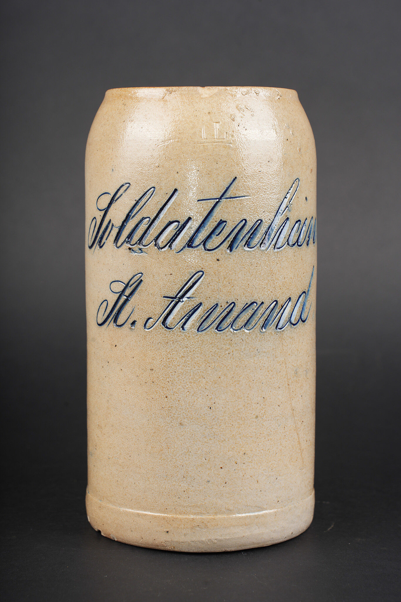 Chope du Soldatenheim de St Amand. Chope de 1 litre en grès vernissé, marquée en bleu Soldatenheim St. Amand. Un tout petit coup au col sinon bel état. Stoneware mug from the soldiers’ home at Saint-Amand-les-Eaux marked in blue Soldatenheim St. Amand, one litre capacity. Tiny chip to the rim, otherwise very good condition.