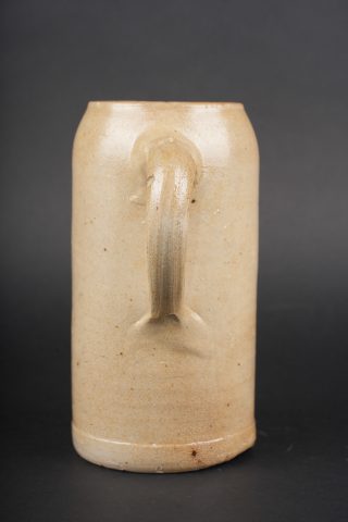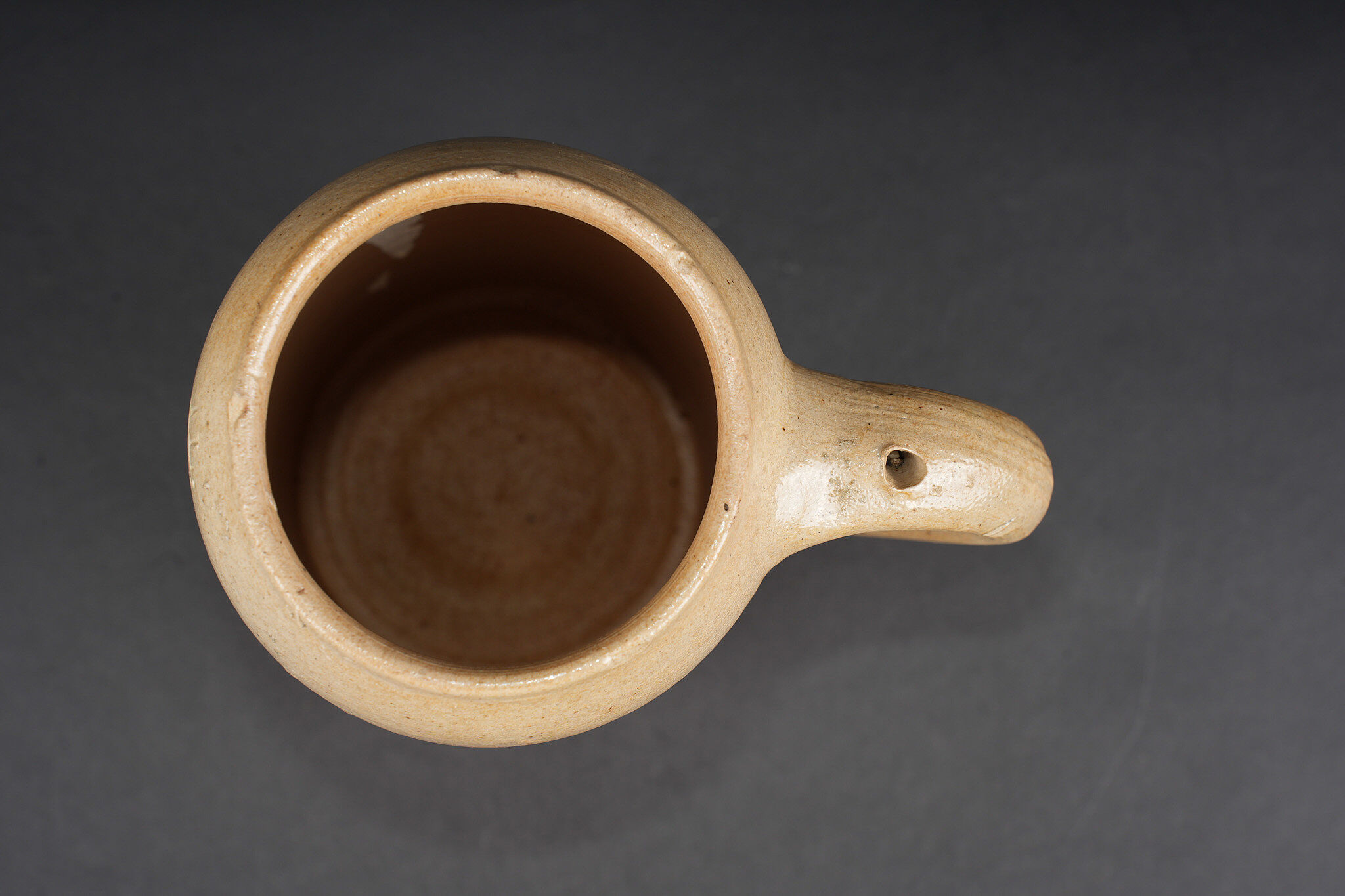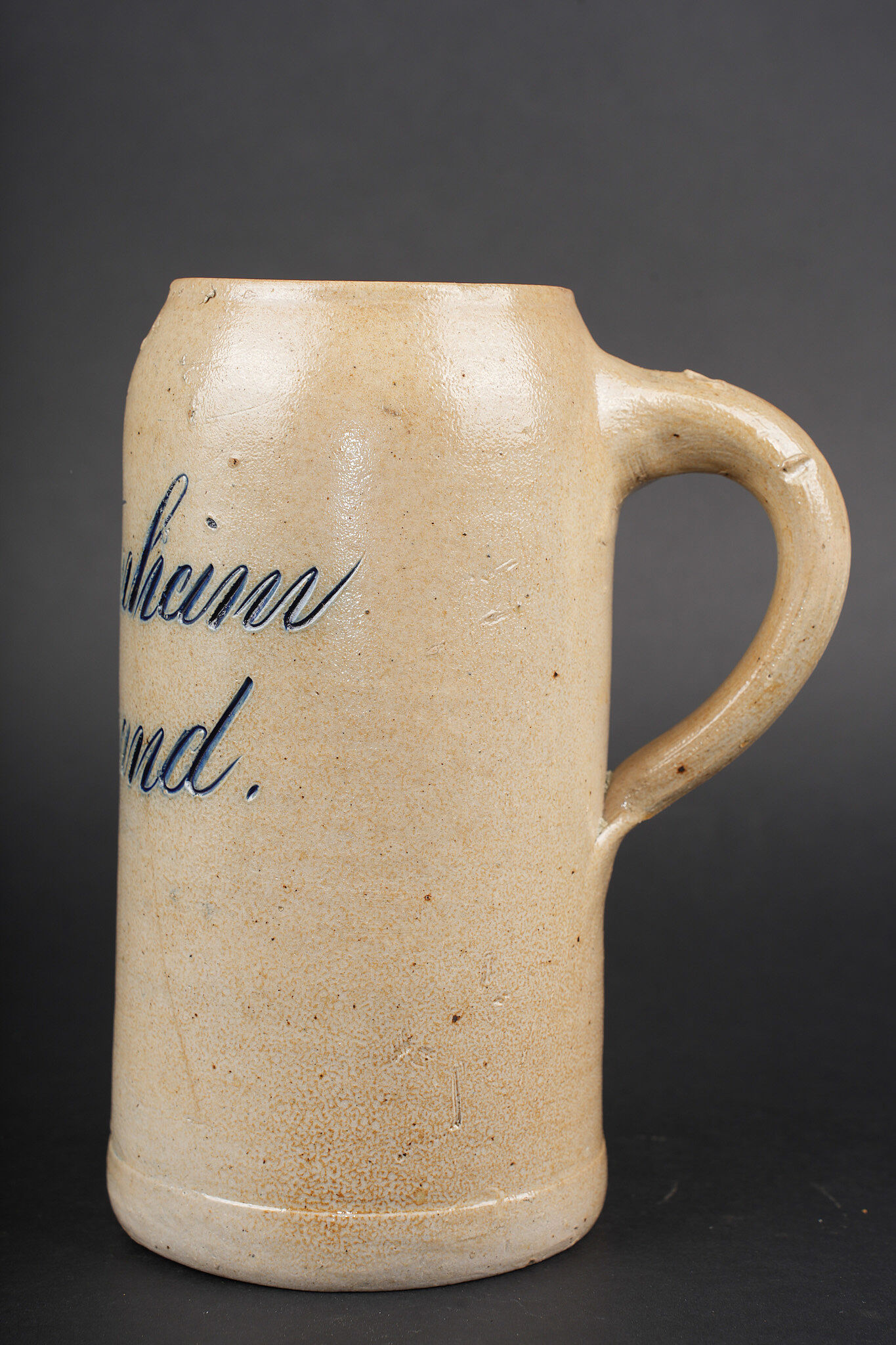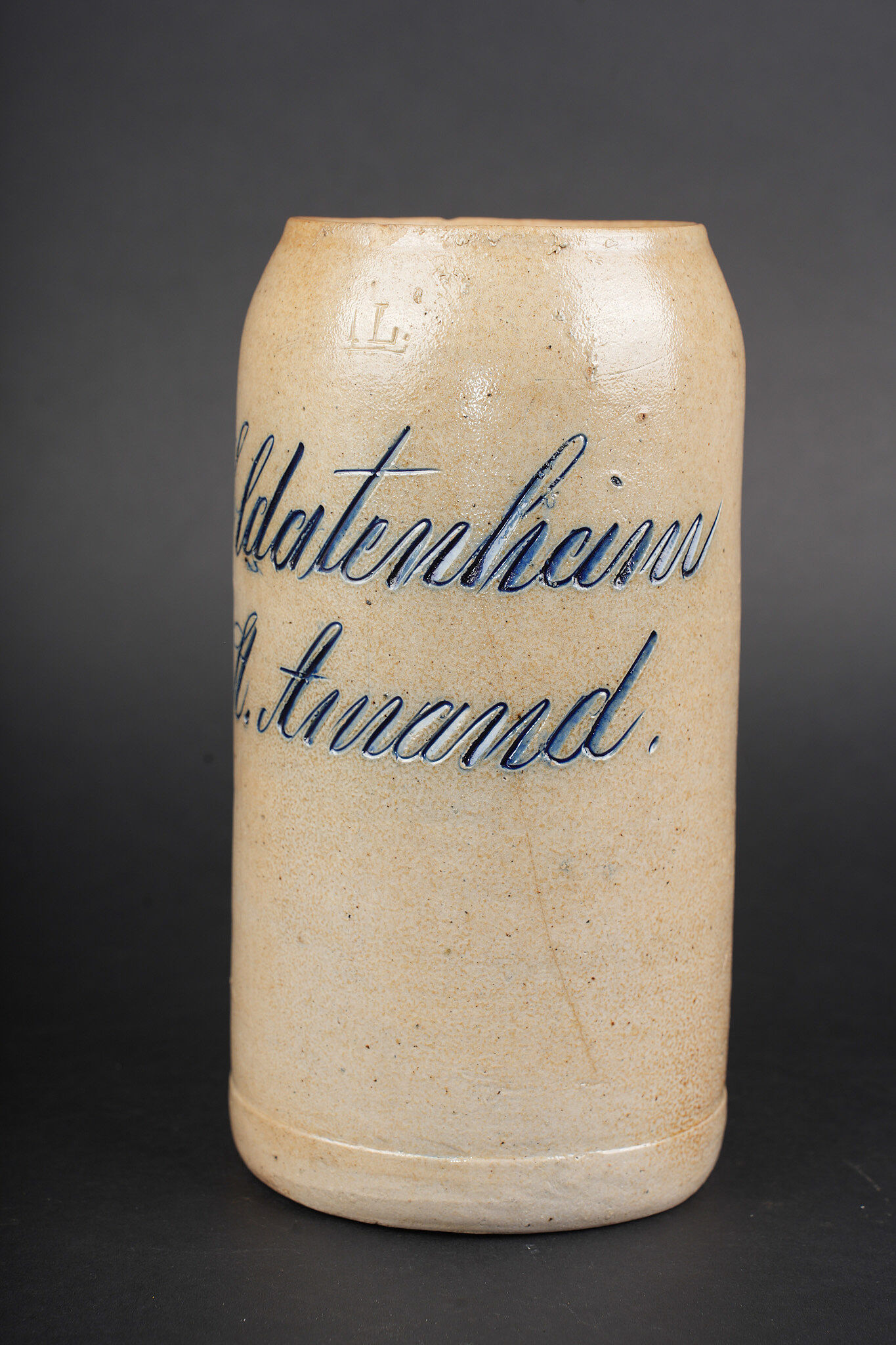 Chope du Soldatenheim de St Amand. Chope de 1 litre en grès vernissé, marquée en bleu Soldatenheim St. Amand. Un tout petit coup au col sinon bel état. Stoneware mug from the soldiers’ home at Saint-Amand-les-Eaux marked in blue Soldatenheim St. Amand, one litre capacity. Tiny chip to the rim, otherwise very good condition.