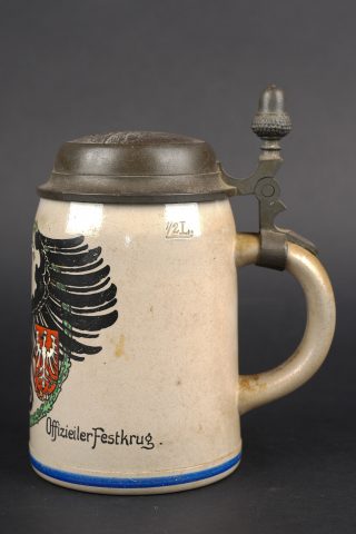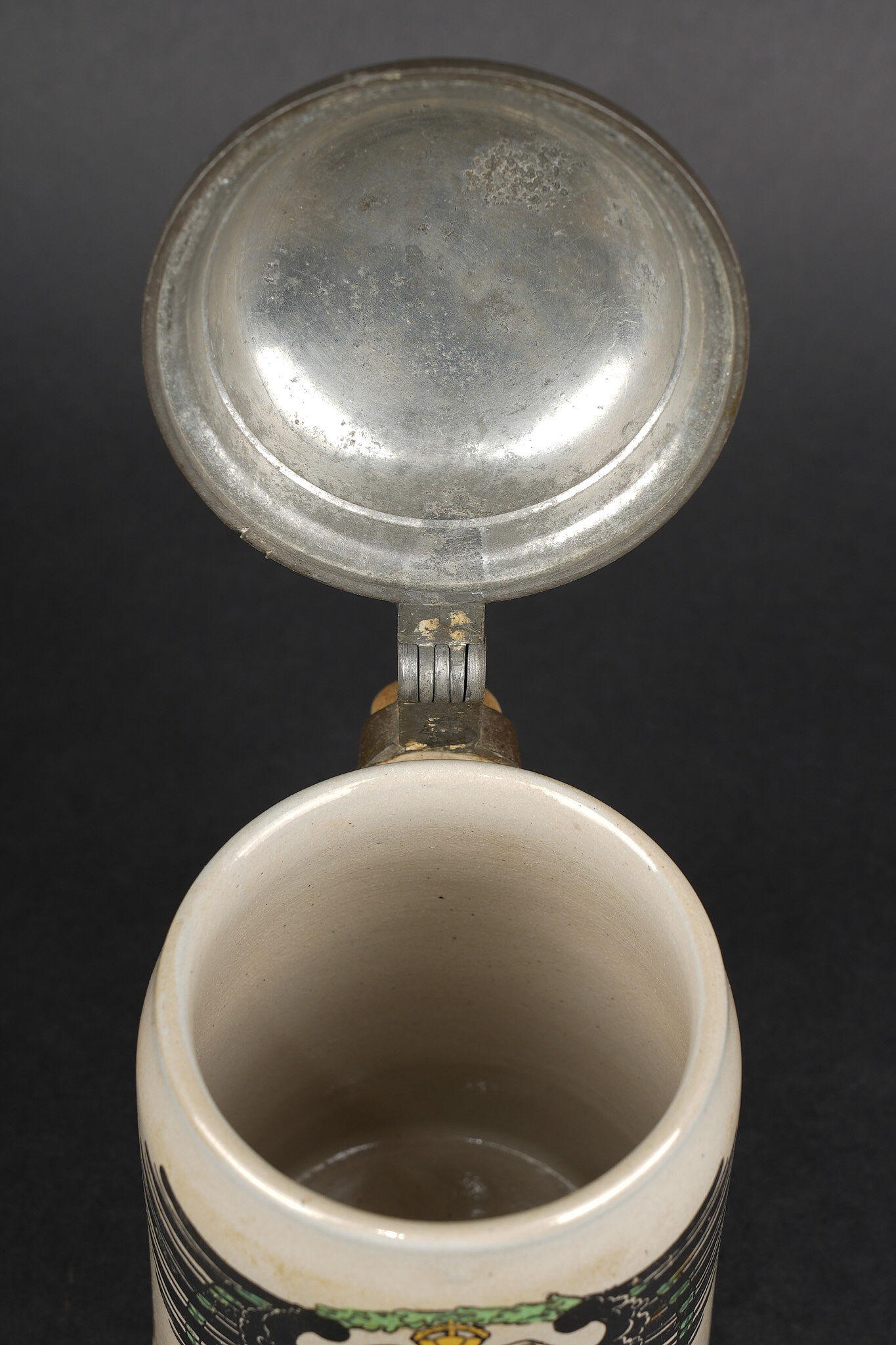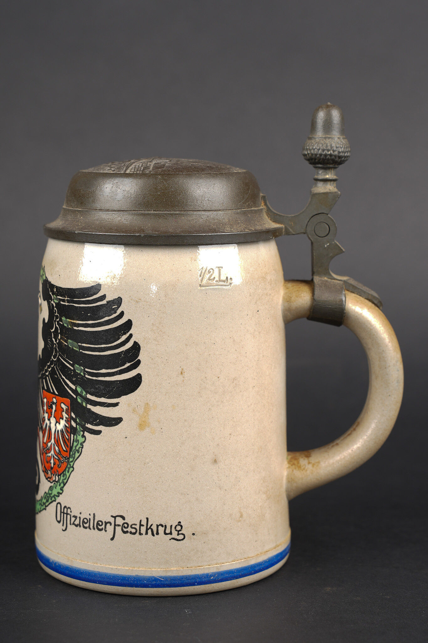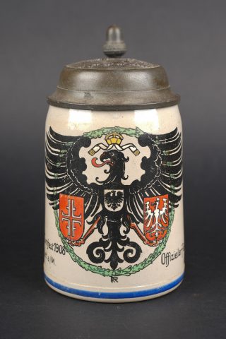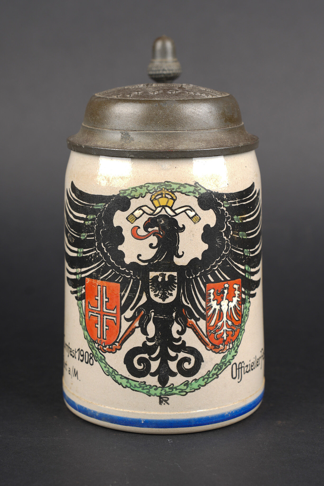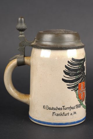Chope en grès Turnfest Frankfurt am Main 1908 et insigne. Stoneware stein from the Turnfest Frankfurt am Main 1908 with badge