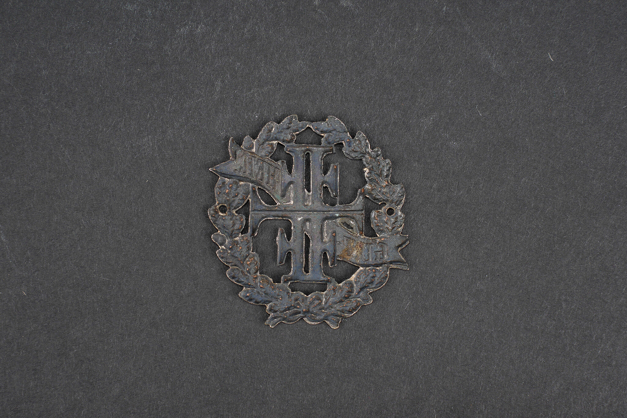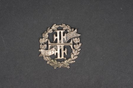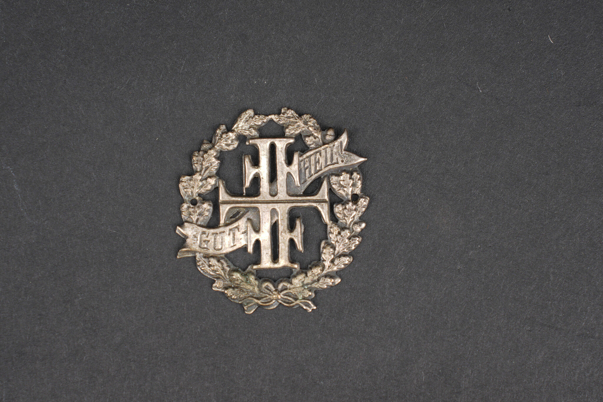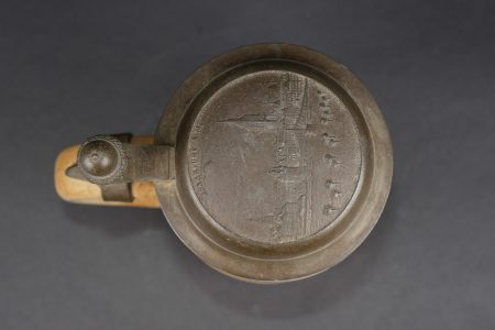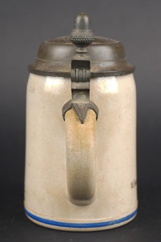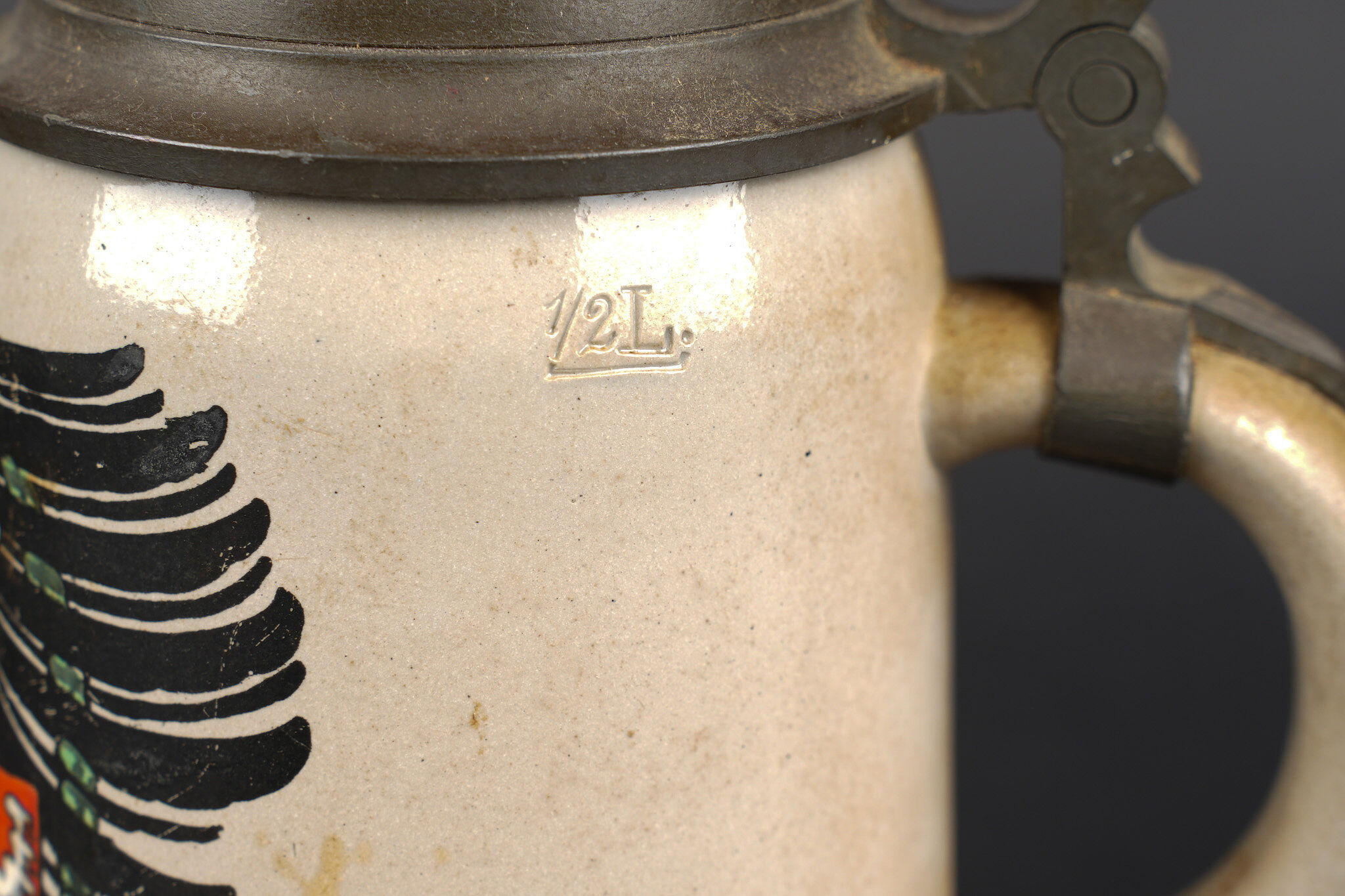 Chope en grès Turnfest Frankfurt am Main 1908 et insigne. Stoneware stein from the Turnfest Frankfurt am Main 1908 with badge