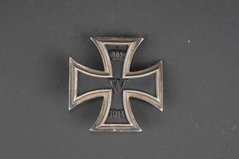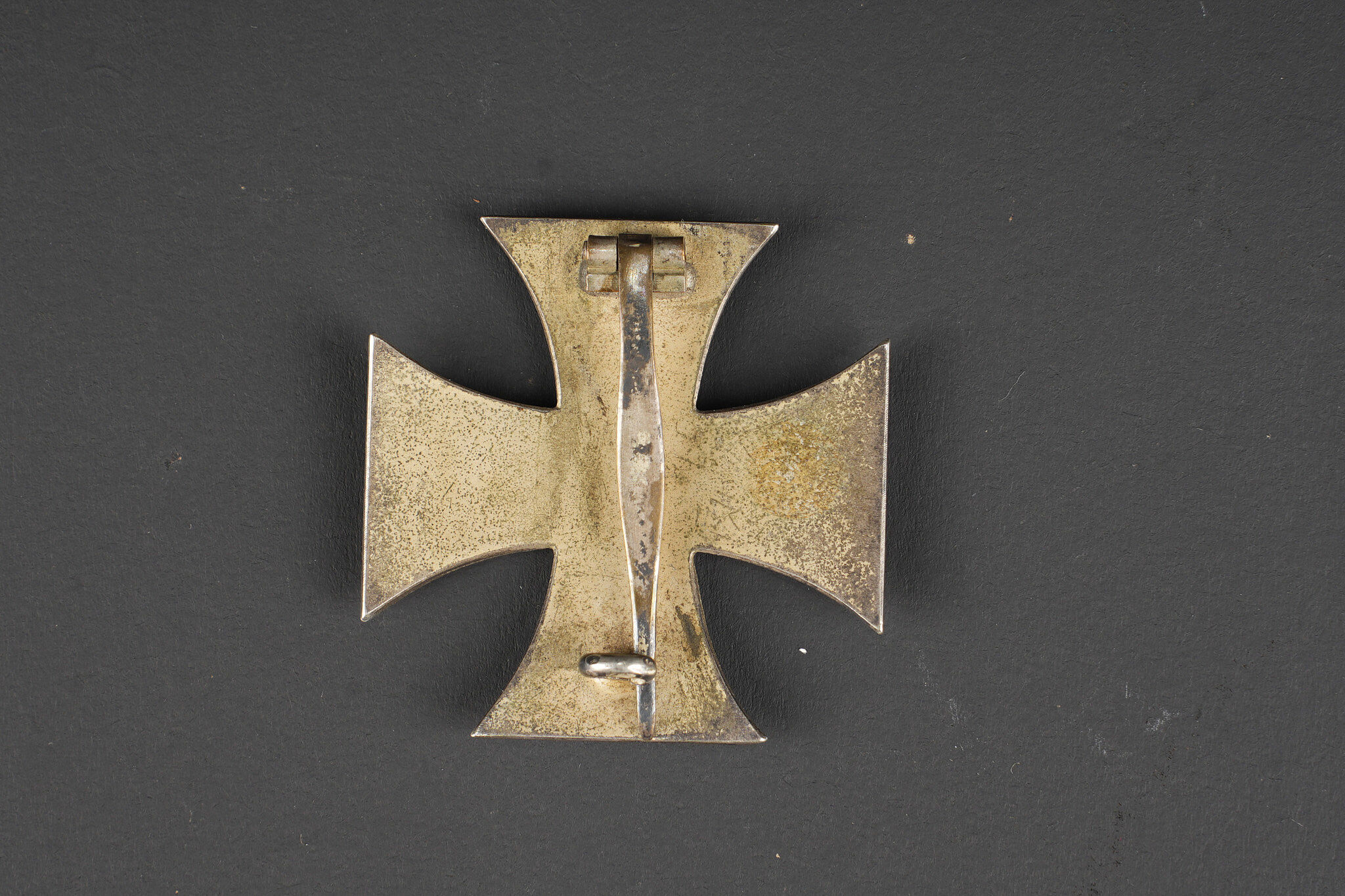 Croix de Fer 1914 de 1ère Classe. Médaille en 3 parties avec centre magnétique. Epingle verticale au dos, avec son crochet. Usure d’usage, patine. Iron Cross First Class 1914 pattern, three piece construction with magnetic core. Vertical pin and hook on reverse intact. Service wear and patina