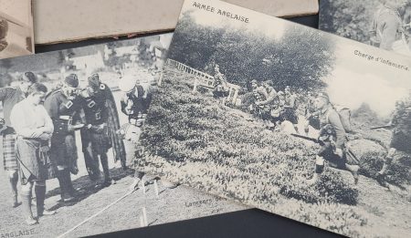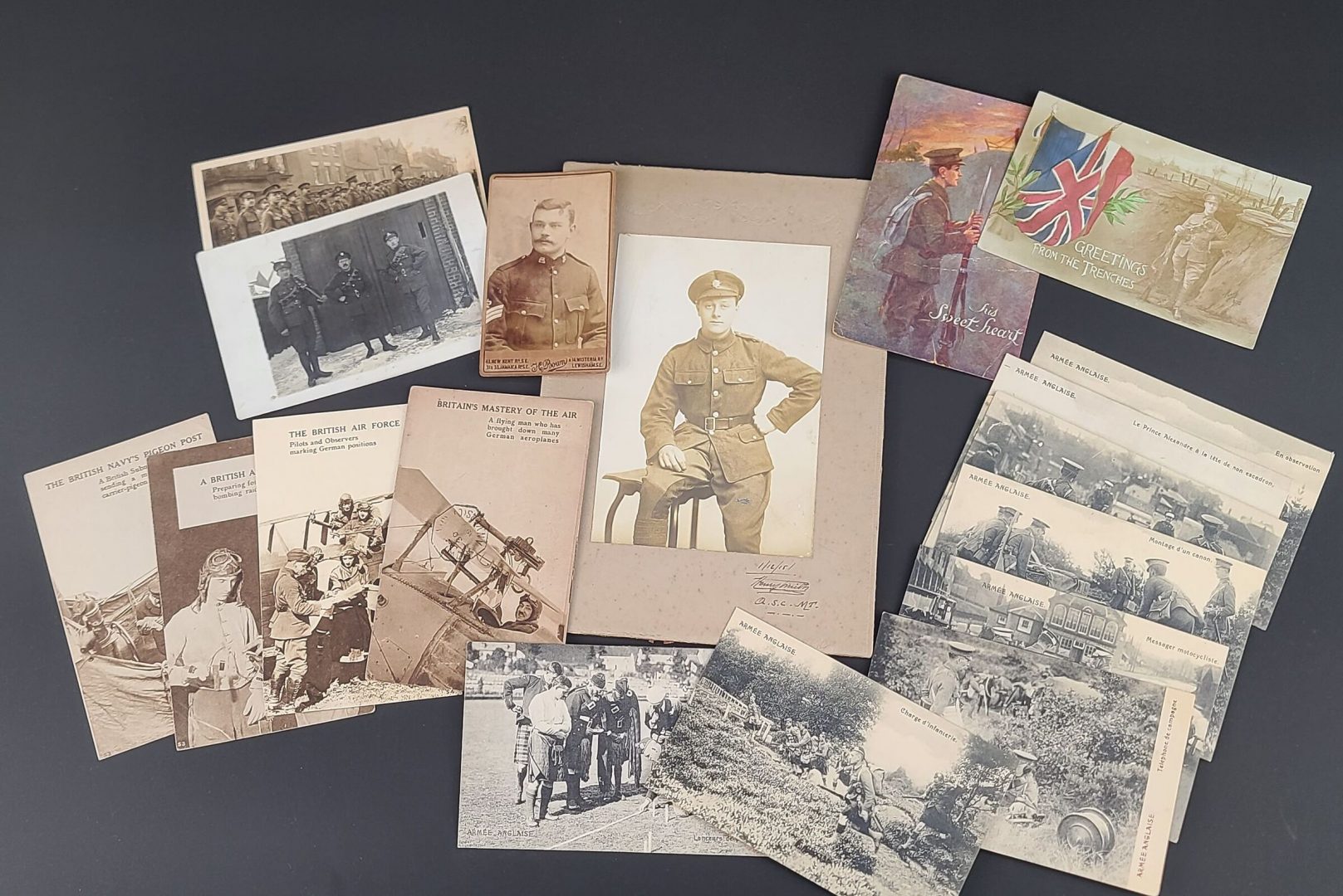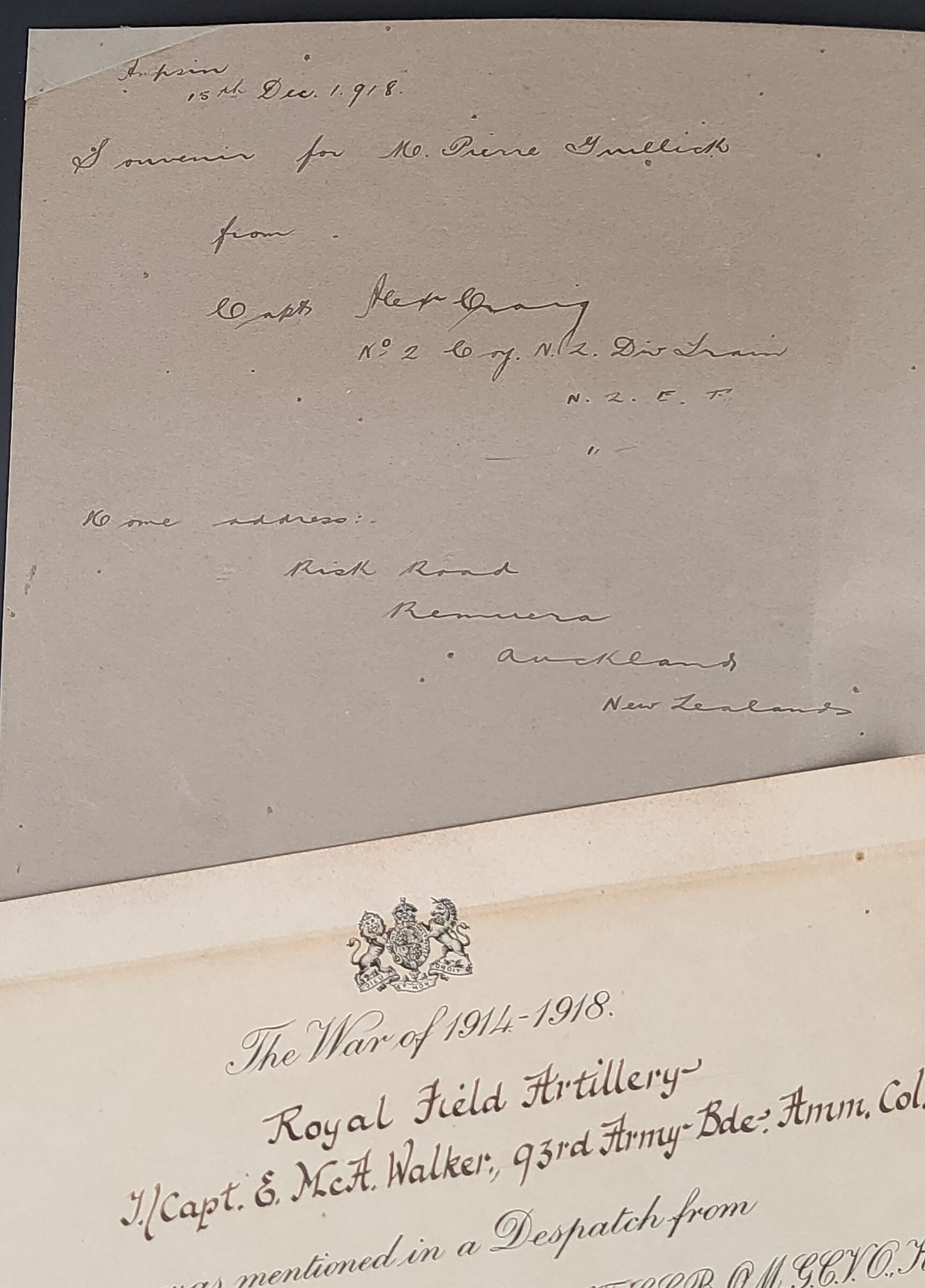 Photo d’un officier Neo-Zelandais, citation d’un officier anglais d’artillerie, cartes postales et photos anglaises ww1. Lot comprenant une jolie photo d’un officier du New Zeland Army Service Corps, prise en 1918. Une citation pour le Captain Walker, 93rd Army Brigade Ammunition Column RFA, un portrait d’un soldat du Queen’s West Surrey Regiment, un autre d’un ASC Motor Transport, 14 cartes postales sur l’armée anglaise dont 3 sur le Royal Flying Corps, une photo, et 2 cartes de vœux dont une voyagée en 1917. Total 21 pièces. Usure d’usage, patine. Lot of New Zealand officer photograph, citation to a British artillery officer, postcards and British WWI photographs including a fine 1918 portrait of an officer of the New Zealand Army Service Corps, a citation for Captain Walker of the 93rd Army Brigade Ammunition Column of the Royal Field Artillery, a portrait of a soldier of the Queen’s Royal Regiment, another of Army Service Corps motor transport, fourteen postcards relating to the British Army including three of the Royal Flying Corps, one photograph and two greeting cards, one postally used in 1917. Total of twenty-one pieces. Wear and patina.