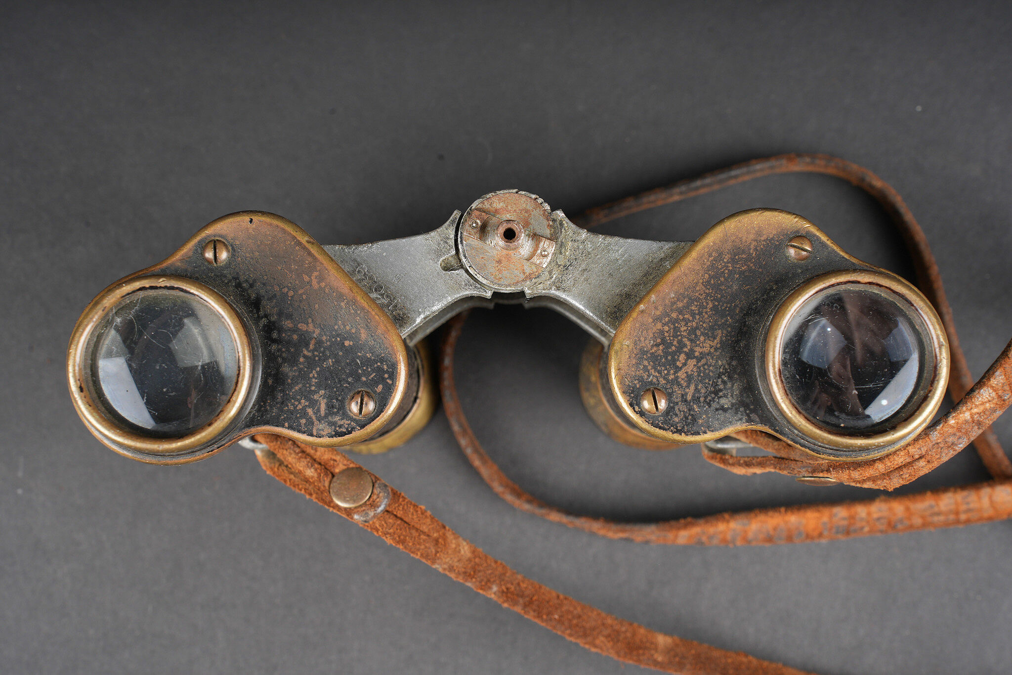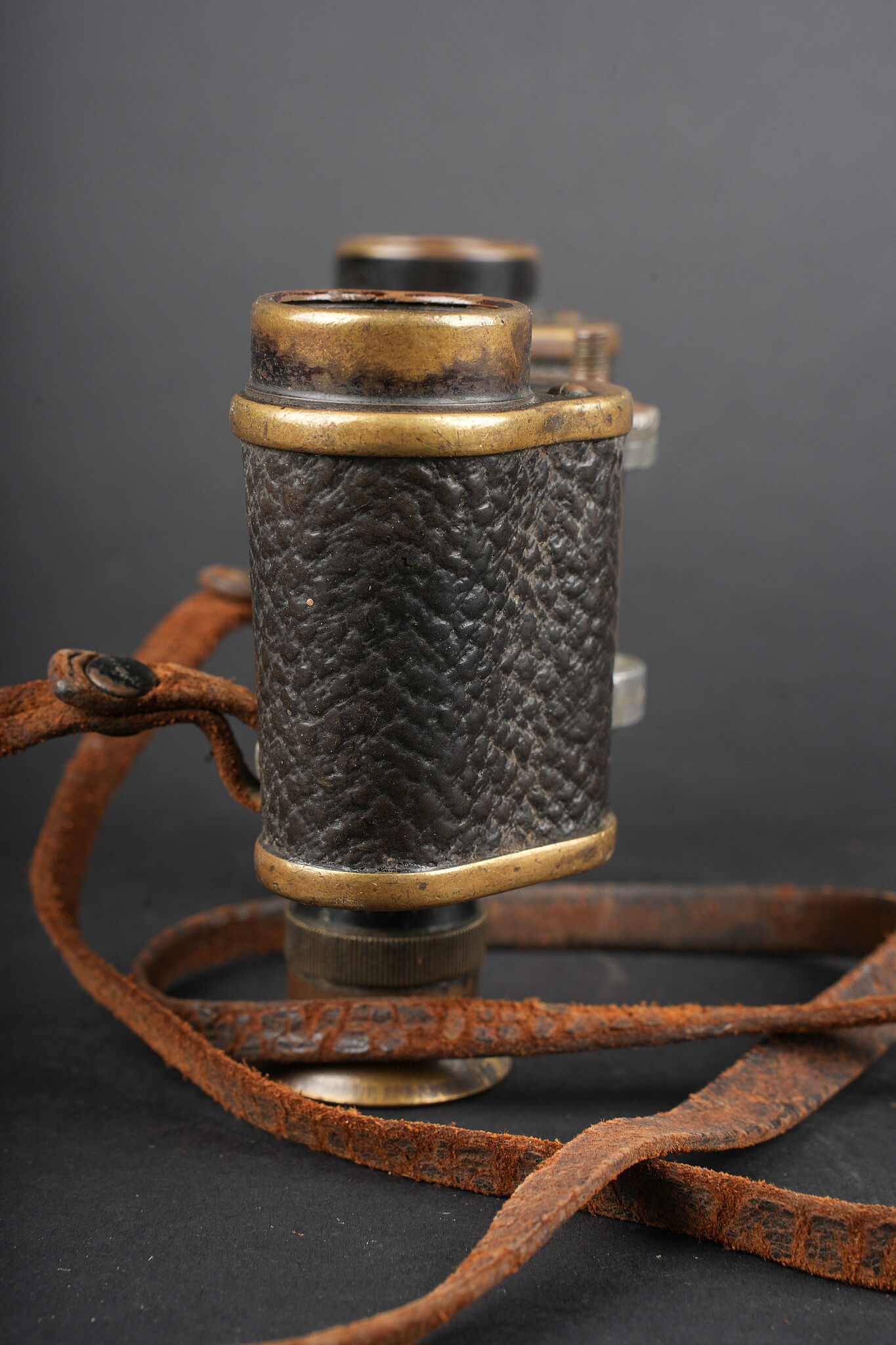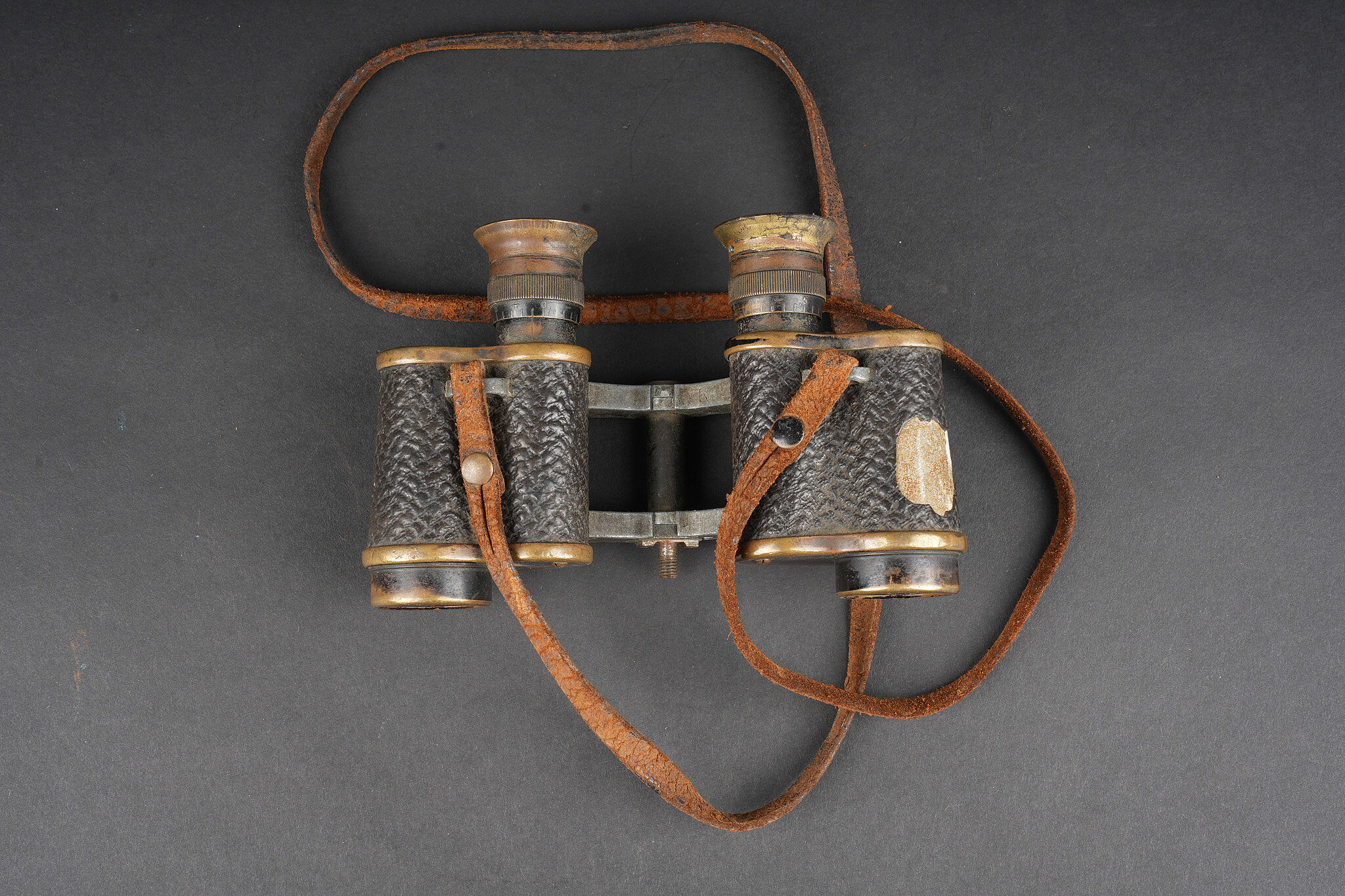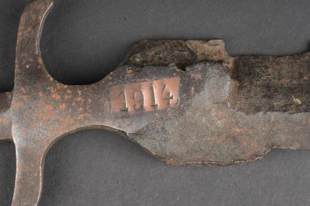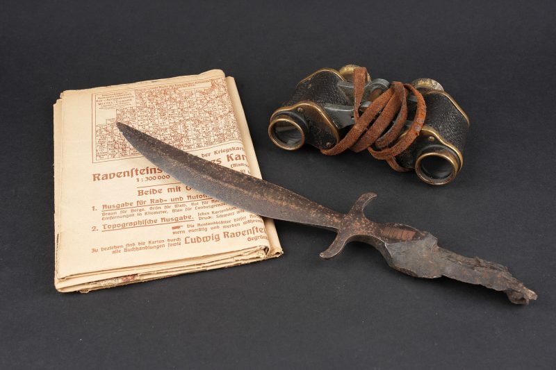 Ensemble allemand ww1 jumelles, carte et coupe papier artisanal. Une paire de jumelles DF03 règlementaires du fabricant Goerz, sanglon cuir présent, mollette absente, optique claire, usure d’usage. Une carte allemande de la Belgique et Nord de la France, édition juste après guerre, usure, déchirures. Un spectaculaire coupe papier réalisé dans un éclat d’obus, avec un insert cuivre avec date 1914, longueur environ 32,2 cm. German First World War field set including one pair of DF03 binoculars by C. P. Goerz, leather strap present, focusing wheel missing, optics clear, normal wear. One German map of Belgium and northern France issued just after the war, with tears and wear. One striking trench made letter opener fashioned from shell fragment, with copper insert dated 1914, length approximately 32.2 cm