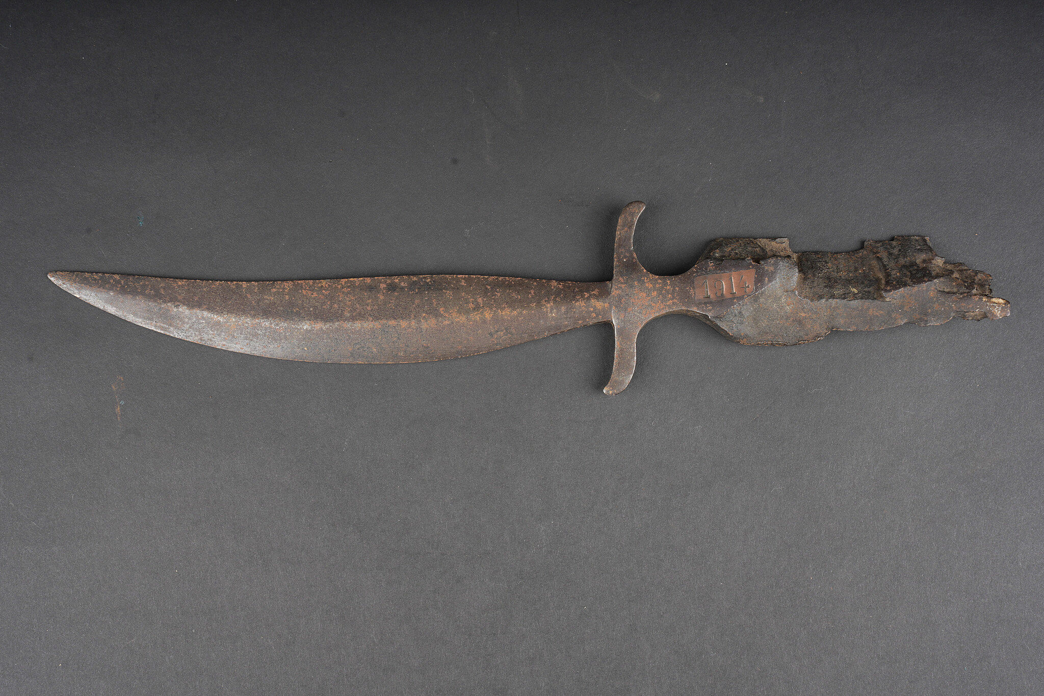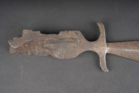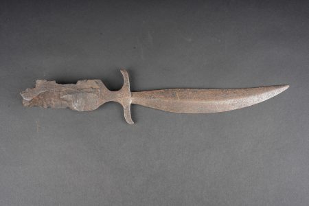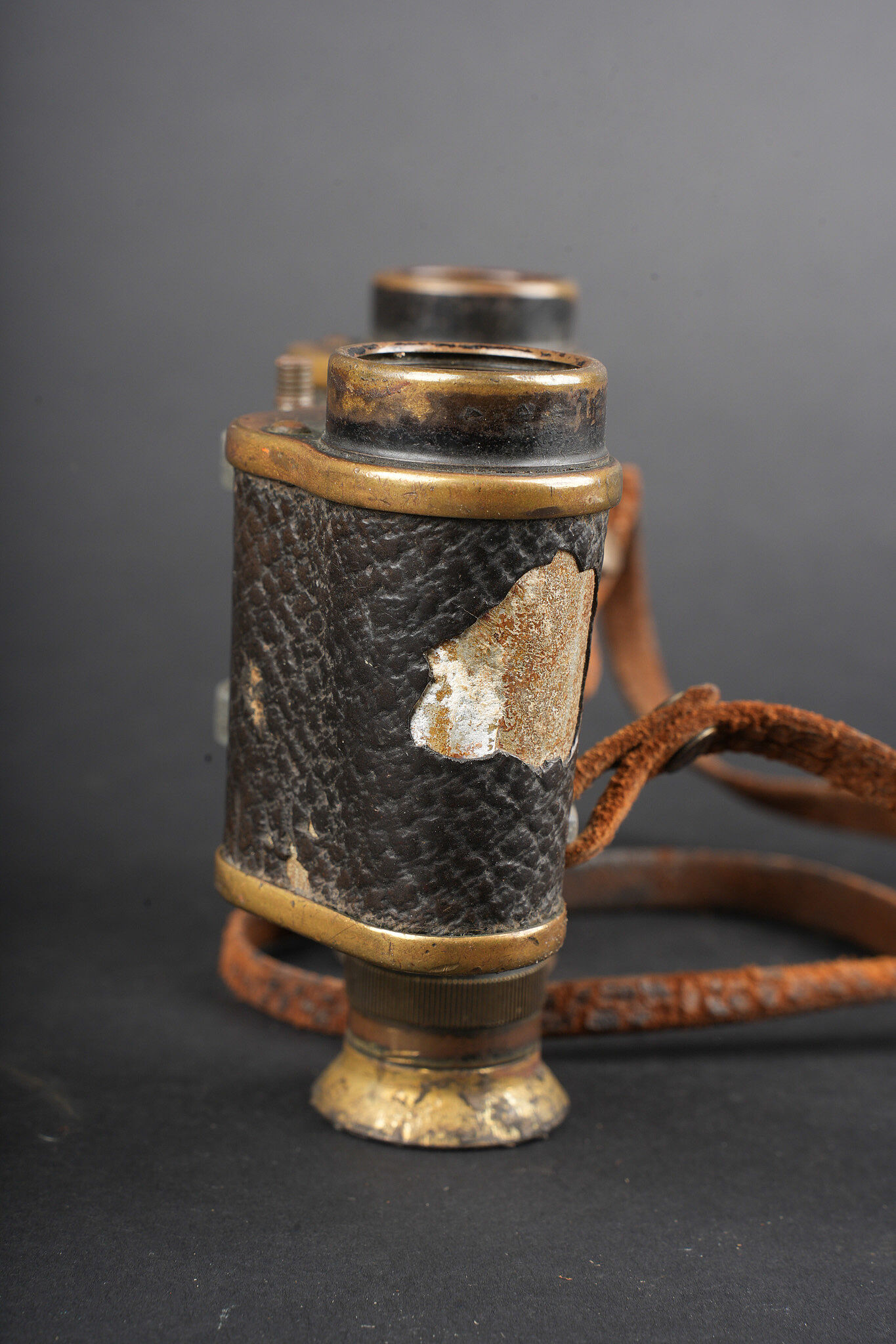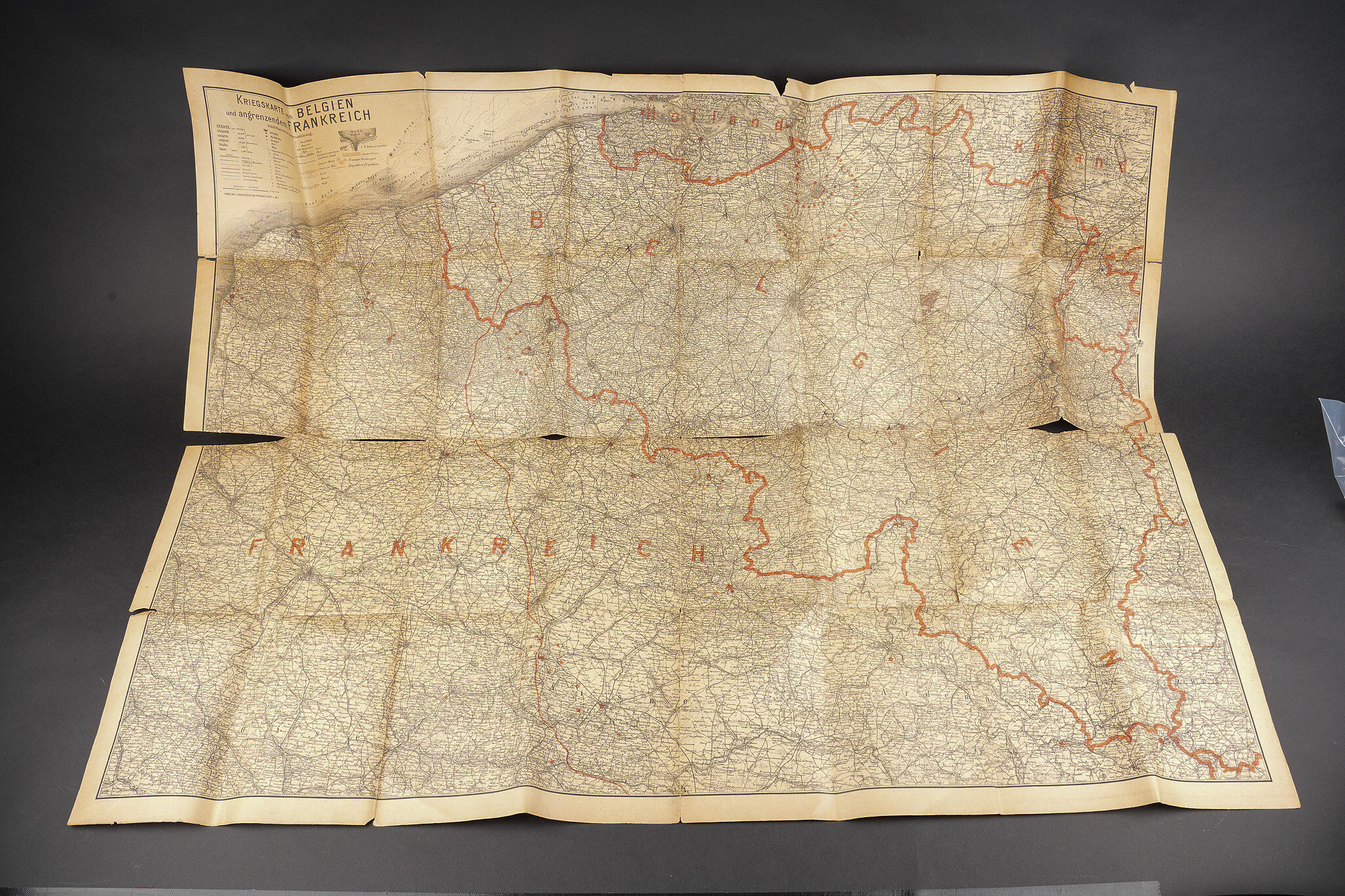 Ensemble allemand ww1 jumelles, carte et coupe papier artisanal. Une paire de jumelles DF03 règlementaires du fabricant Goerz, sanglon cuir présent, mollette absente, optique claire, usure d’usage. Une carte allemande de la Belgique et Nord de la France, édition juste après guerre, usure, déchirures. Un spectaculaire coupe papier réalisé dans un éclat d’obus, avec un insert cuivre avec date 1914, longueur environ 32,2 cm. German First World War field set including one pair of DF03 binoculars by C. P. Goerz, leather strap present, focusing wheel missing, optics clear, normal wear. One German map of Belgium and northern France issued just after the war, with tears and wear. One striking trench made letter opener fashioned from shell fragment, with copper insert dated 1914, length approximately 32.2 cm