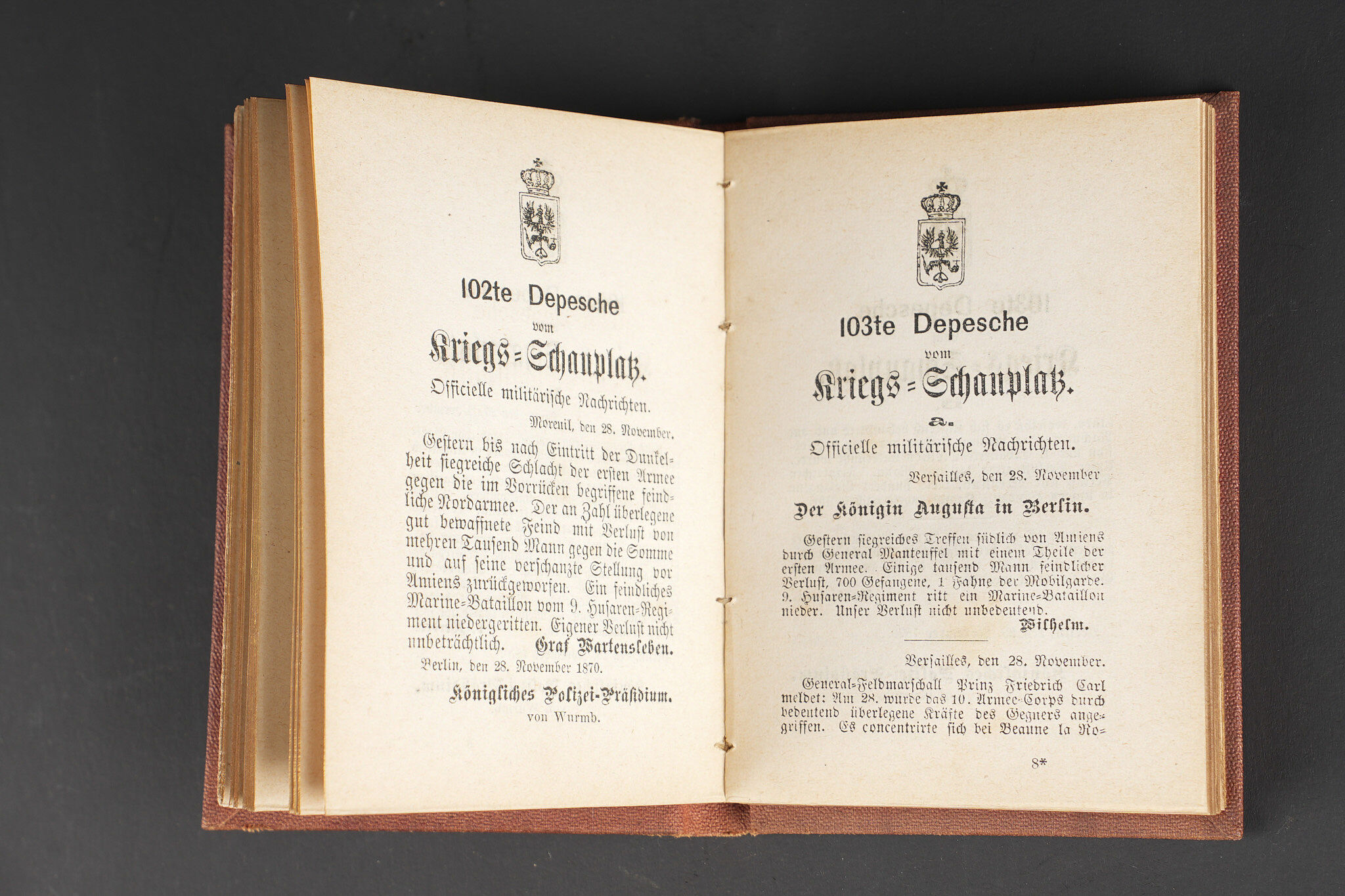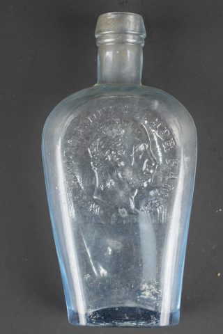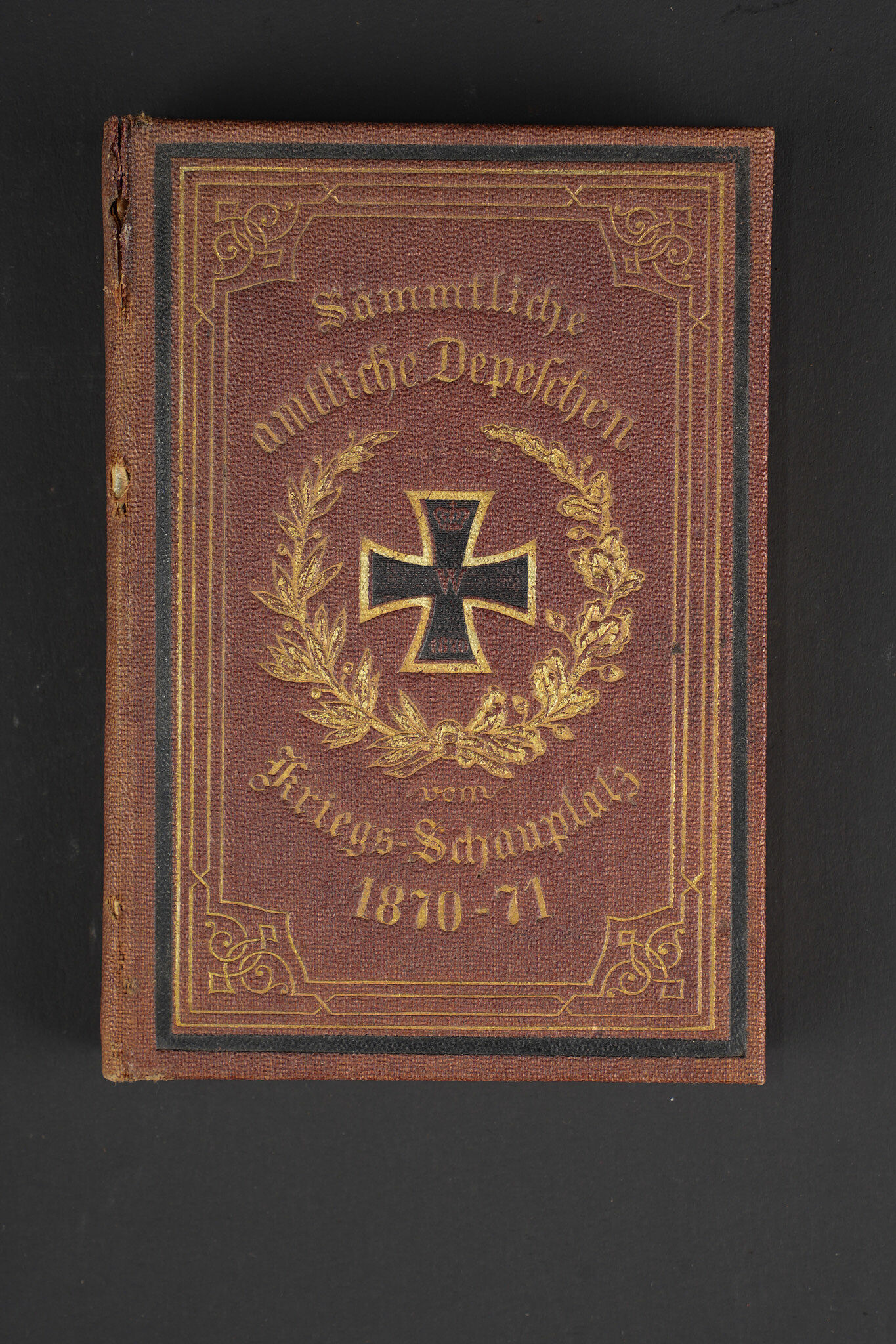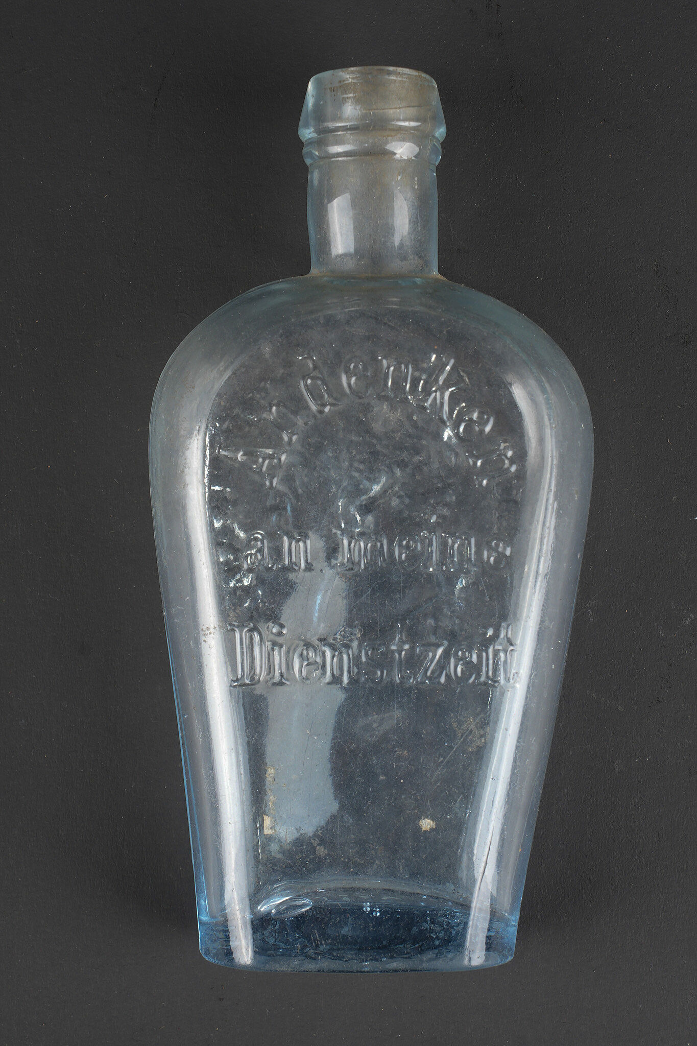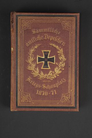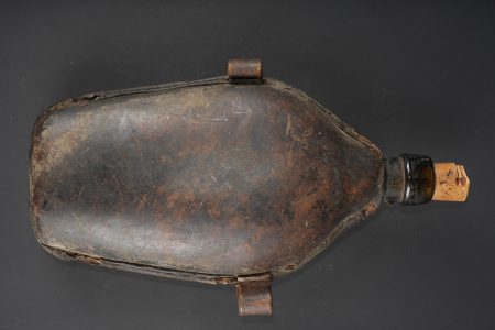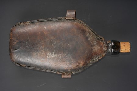 Gourde, et souvenirs allemands Guerre de 1870 jusque 1888. Gourde en verre gainée de cuir avec un passant de chaque côté. Bouchon non d’origine. Une bouteille en verre marquée Andenken an meine Dienstzeit d’un côté et de l’autre portrait du Kaiser Wilhelm I (règne 1861 à 1888). Un petit recueil des dépêches du Kriegs-Schauplatz 1870-1871. Usure d’usage, patine. German souvenirs from the Franco Prussian War through 1888, including one glass canteen covered in leather with side loops, stopper replaced, one glass bottle inscribed Andenken an meine Dienstzeit with portrait of Wilhelm I on the reverse, and one small compilation of dispatches from the Kriegs Schauplatz 1870 1871. Service wear and patina.