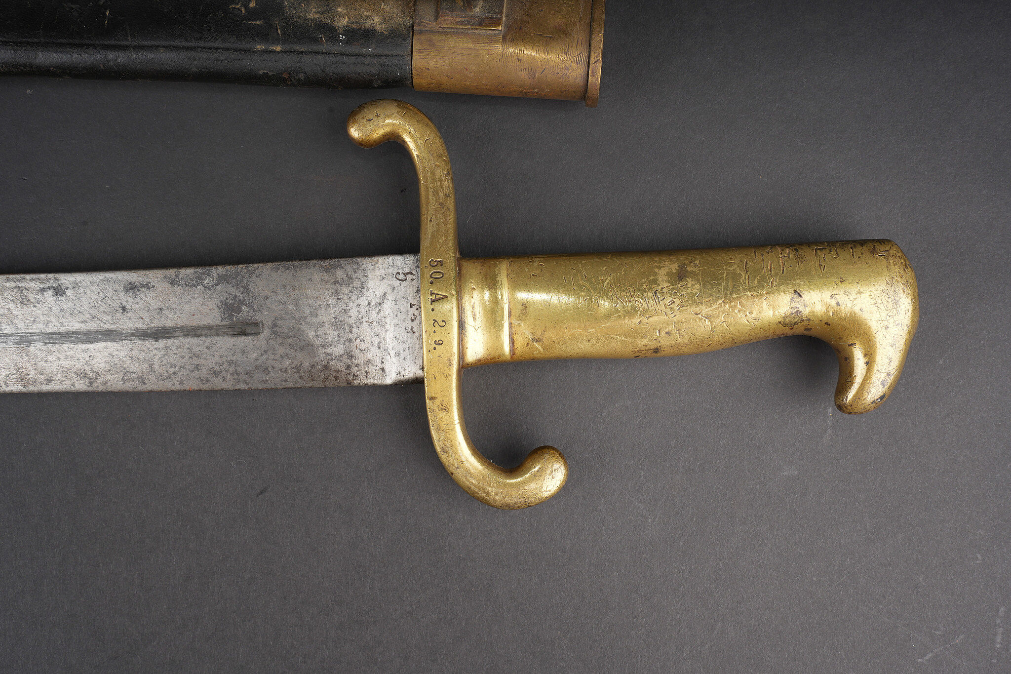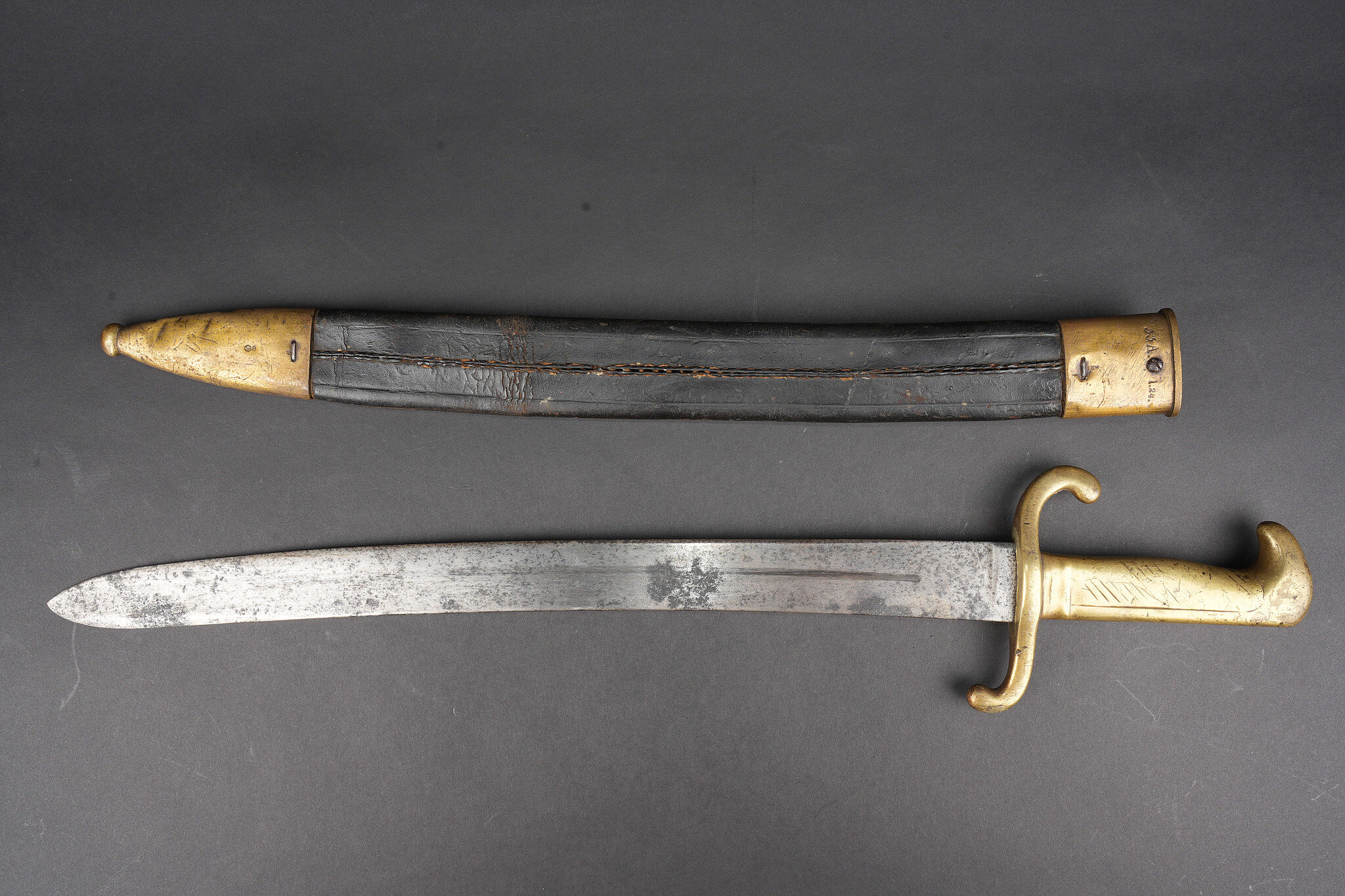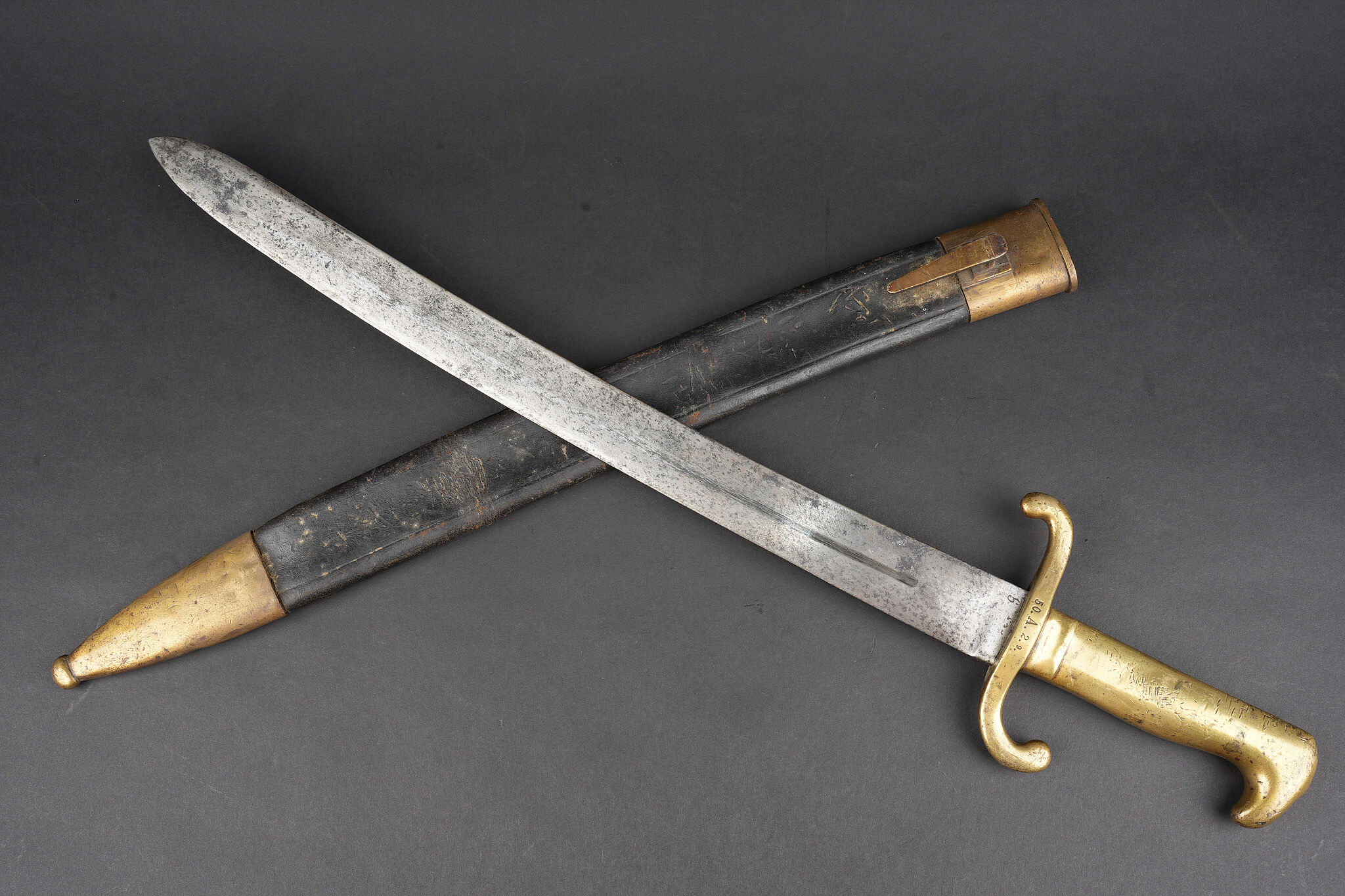 Glaive d’artilleur prussien M1864 régimenté. Faschinenmesser M1864, poignée laiton moulée, régimenté 50 A sur la croisière. Lame datée 1872. Fourreau cuir à garnitures laitons, régimenté 33 A au dos de la chape. Usure prononcée, patine. Prussian Faschinenmesser M1864 artillery sidearm, regiment marked, with cast brass grip and crossguard stamped 50 A. Blade dated 1872. Leather scabbard with brass mounts, rear of chape marked 33 A. Pronounced wear and patina.