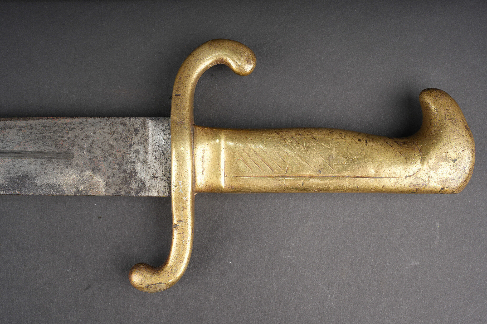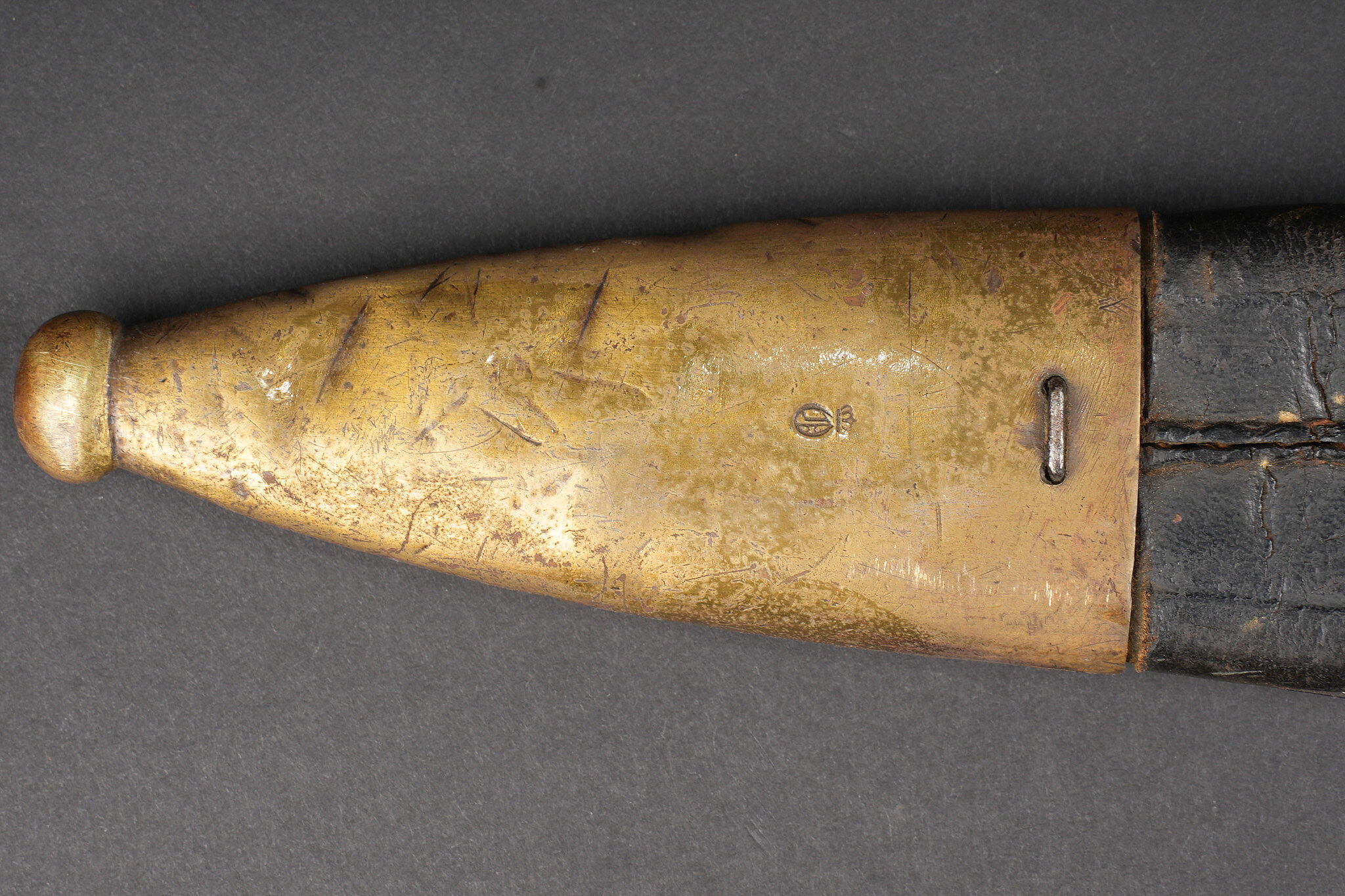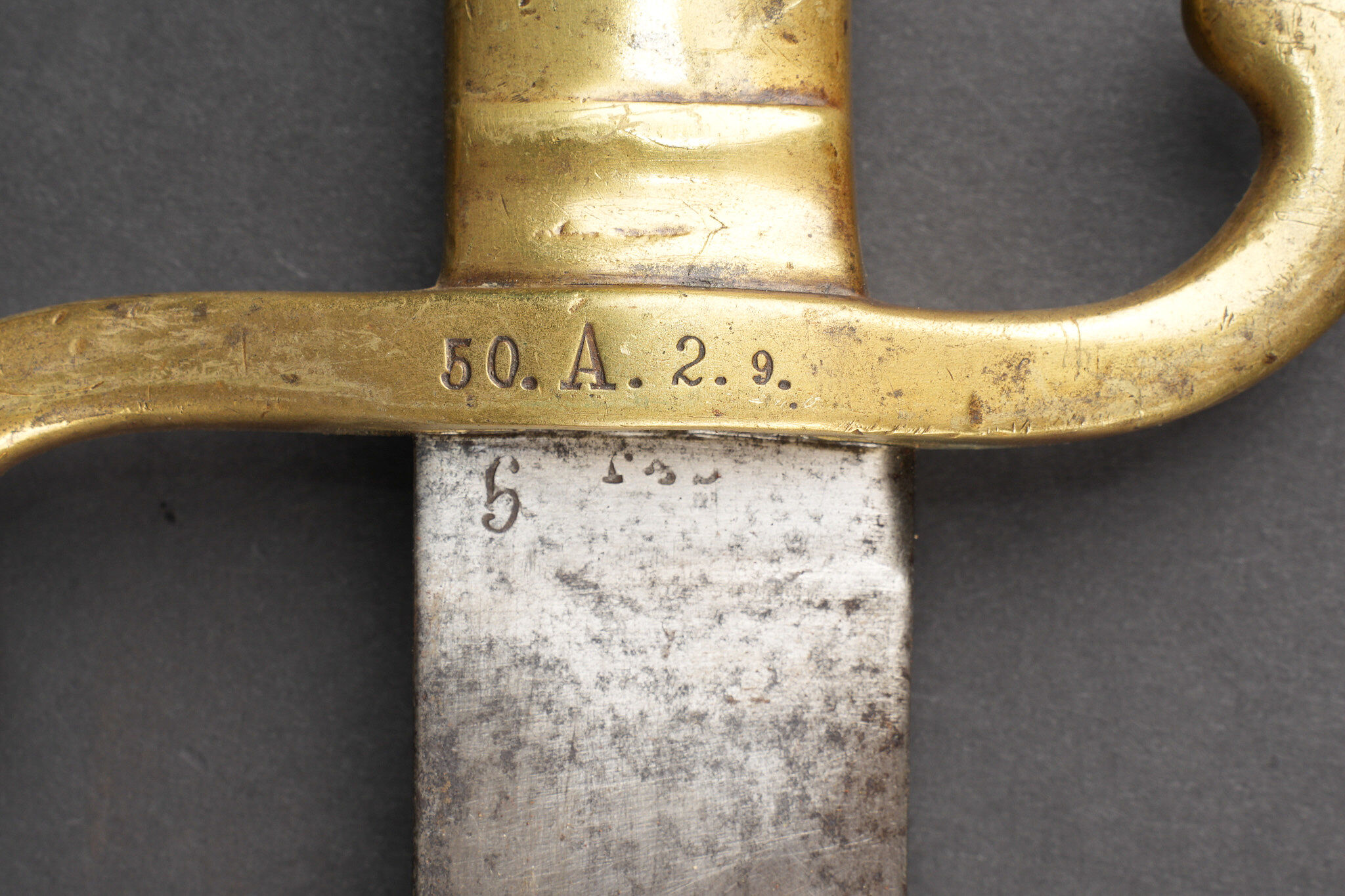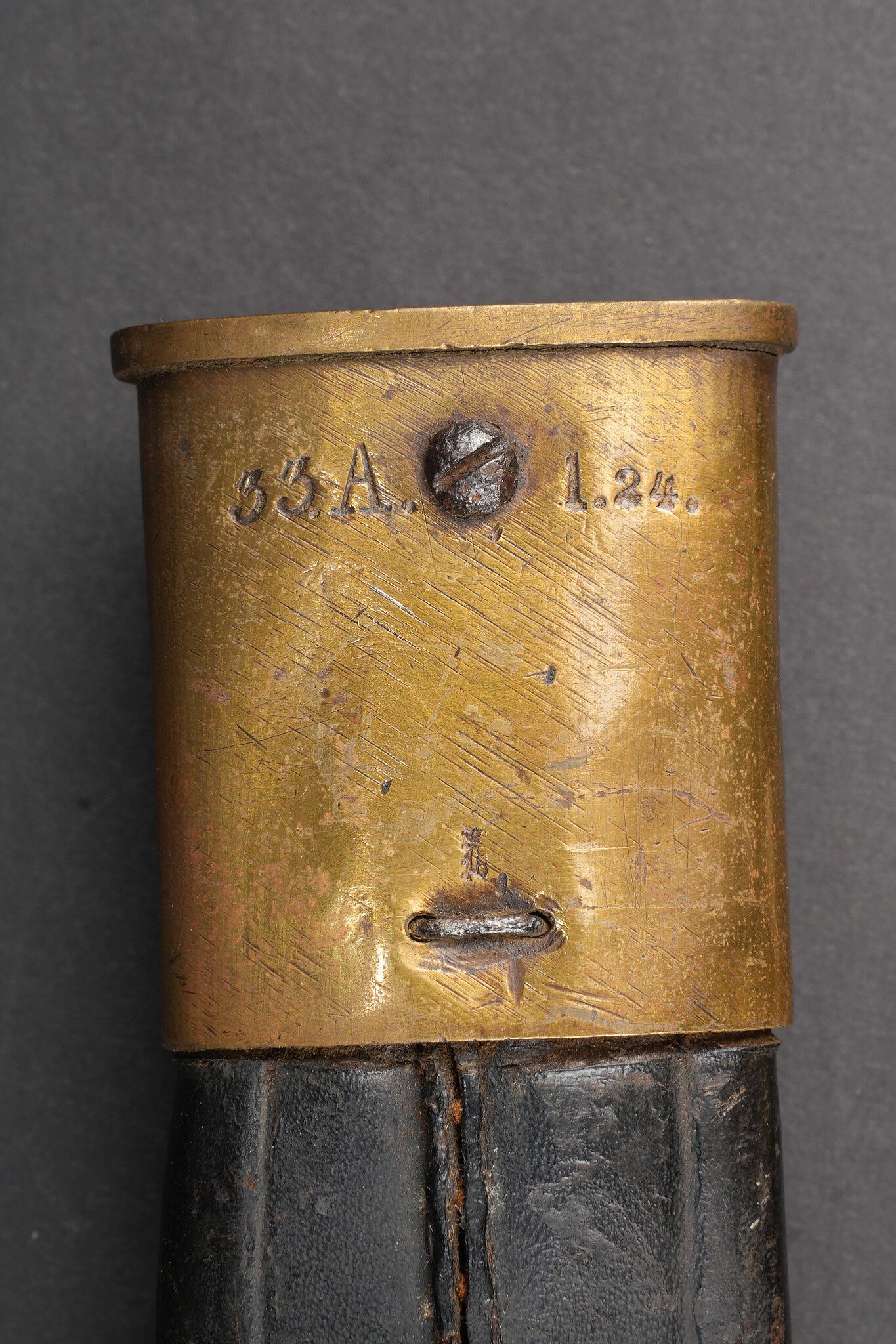 Glaive d’artilleur prussien M1864 régimenté. Faschinenmesser M1864, poignée laiton moulée, régimenté 50 A sur la croisière. Lame datée 1872. Fourreau cuir à garnitures laitons, régimenté 33 A au dos de la chape. Usure prononcée, patine. Prussian Faschinenmesser M1864 artillery sidearm, regiment marked, with cast brass grip and crossguard stamped 50 A. Blade dated 1872. Leather scabbard with brass mounts, rear of chape marked 33 A. Pronounced wear and patina.