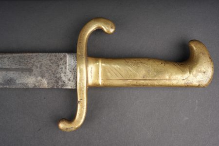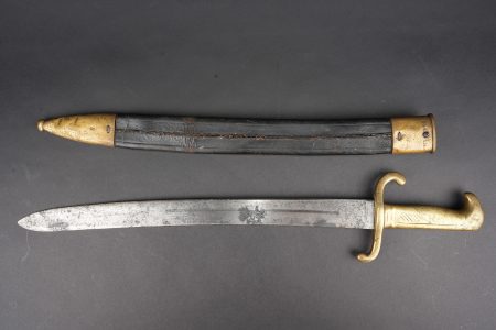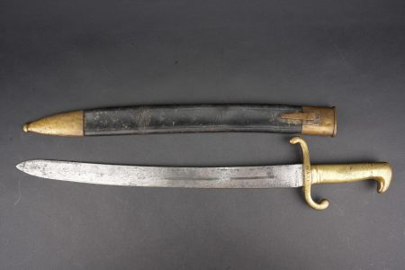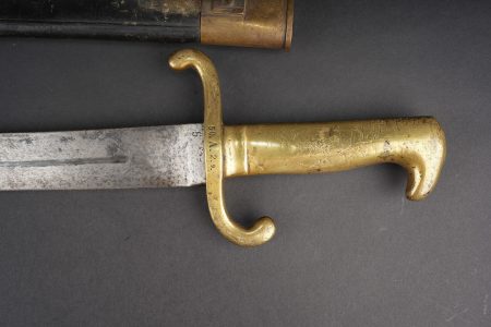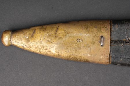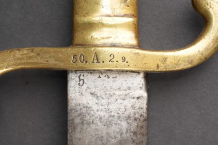 Détails de la vente >Glaive d’artilleur prussien M1864 régimenté. Faschinenmesser M1864, poignée laiton moulée, régimenté 50 A sur la croisière. Lame datée 1872. Fourreau cuir à garnitures laitons,... en savoir plus
