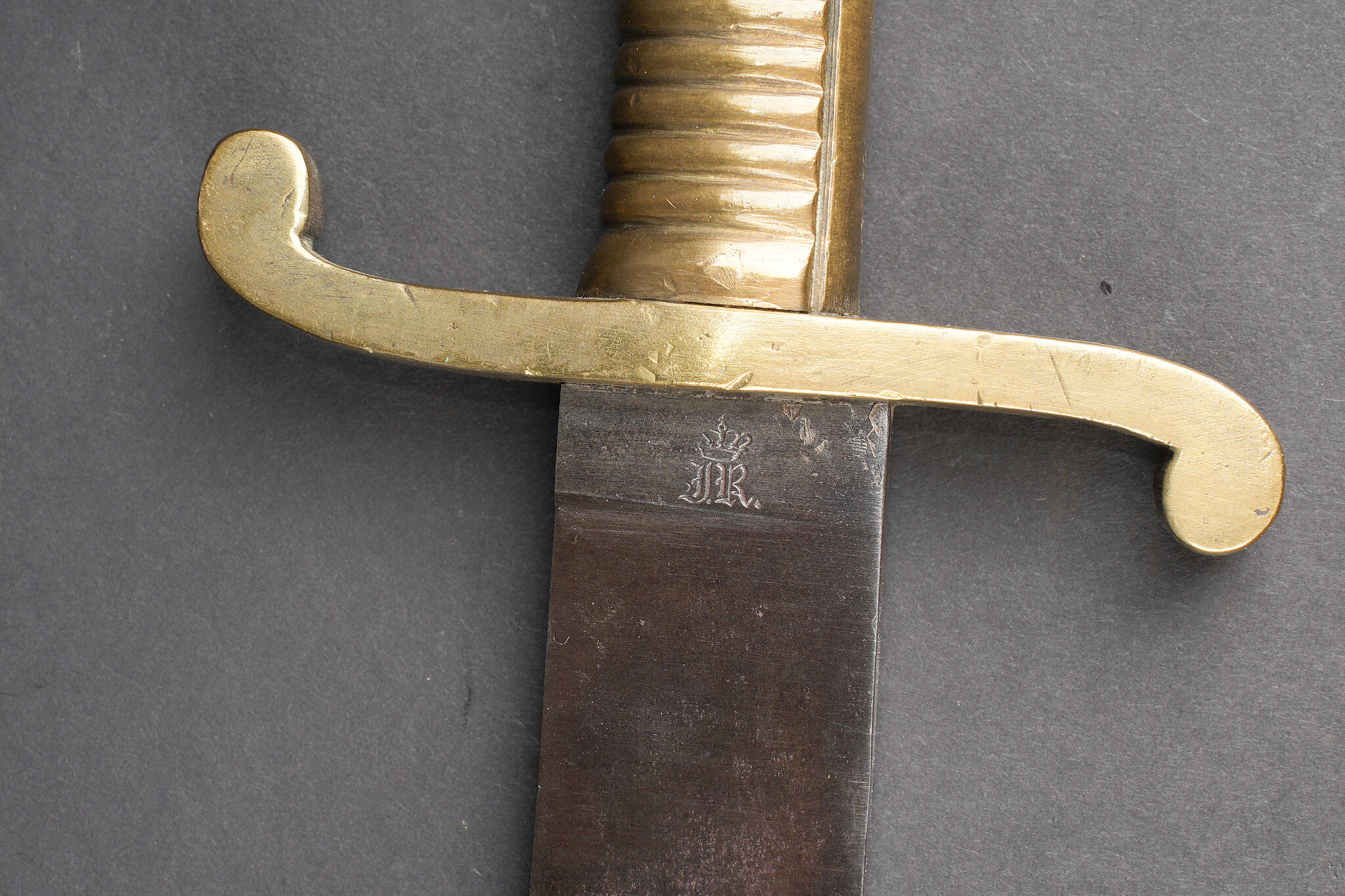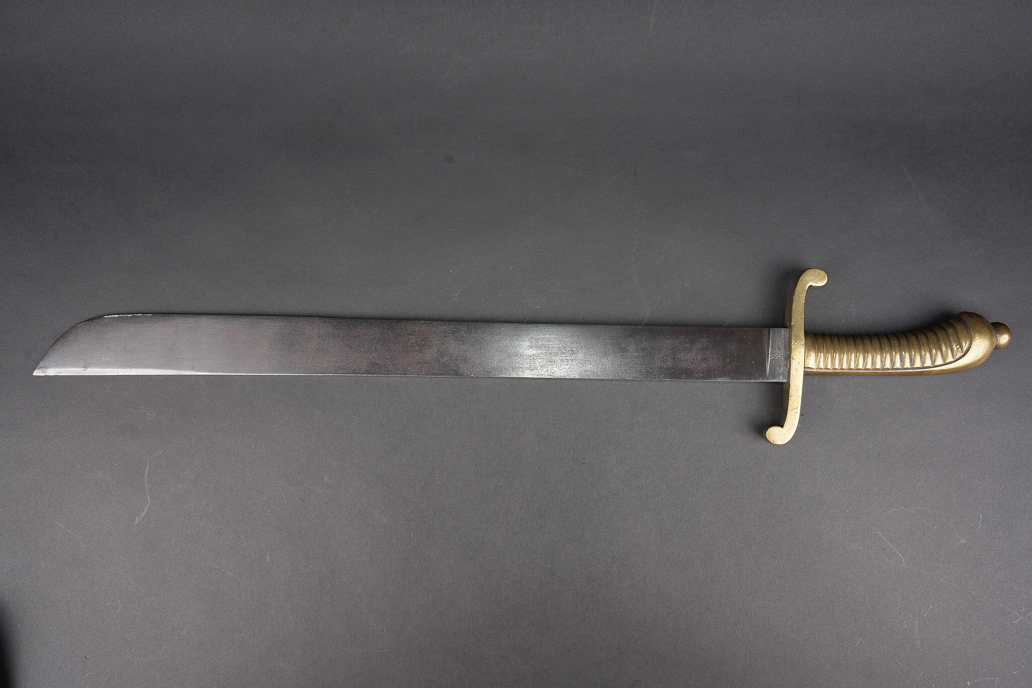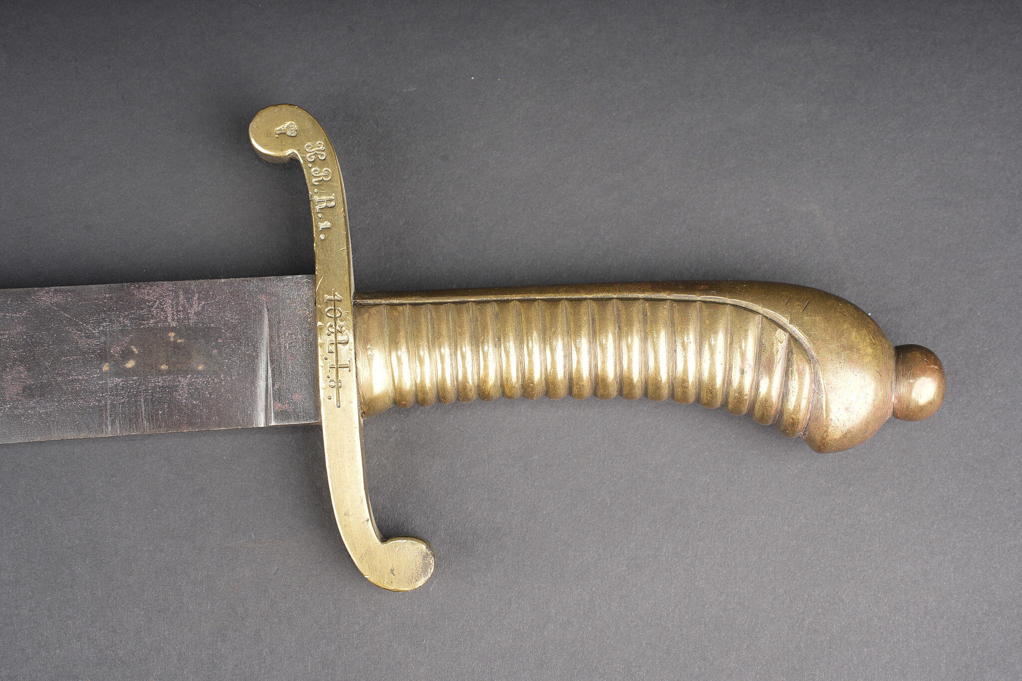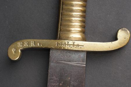 Glaive saxon M1845. Poignée laiton moulée, striée. Croisière réceptionnée au 103e Landwehr Regiment I Bataillon, barré puis réaffecté à un régiment de réserve. Lame à dos plat. Sans fourreau. Usure d’usage, patine. Saxon Faschinenmesser M1845 model 1845 with cast ribbed brass grip, crossguard accepted to the 103rd Landwehr Regiment 1st Battalion, later crossed out and reassigned to a reserve regiment. Flat backed blade, without scabbard. Service wear and patina.