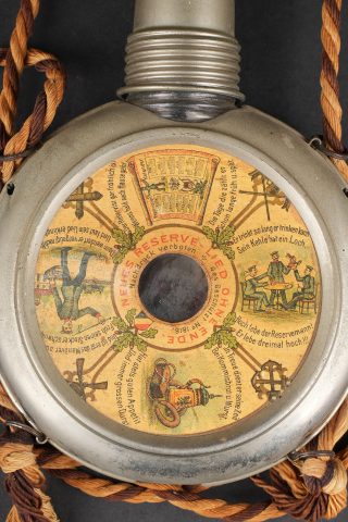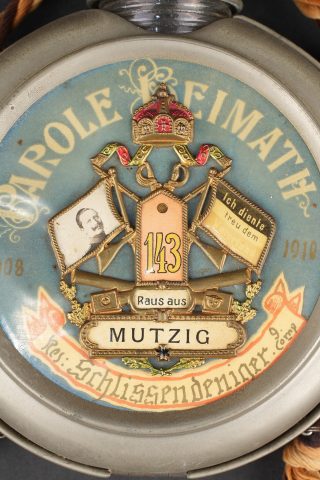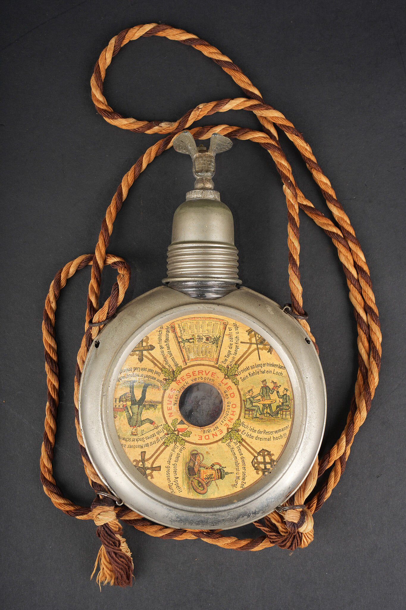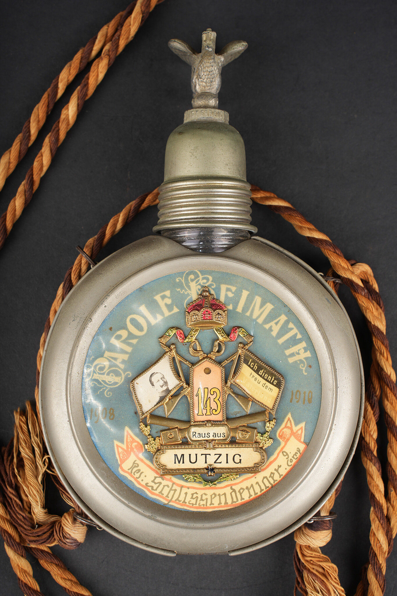 Gourde de réserviste du JR143 de Mutzig. Gourde en verre en bon état, avec ses bouchons, dans sa coque en fer blanc. Motif patte d’épaule du JR143 de Mützig, 9e Kompanie. Avec son cordon tricolore. Usure d’usage, patine. Reservist canteen of Infanterie Regiment Nr 143 from Mutzig, glass flask in good condition with both stoppers inside its tinned shell, decorated with shoulder strap motif of JR143 9th Company, complete with tricolour cord, showing normal service wear and patina.