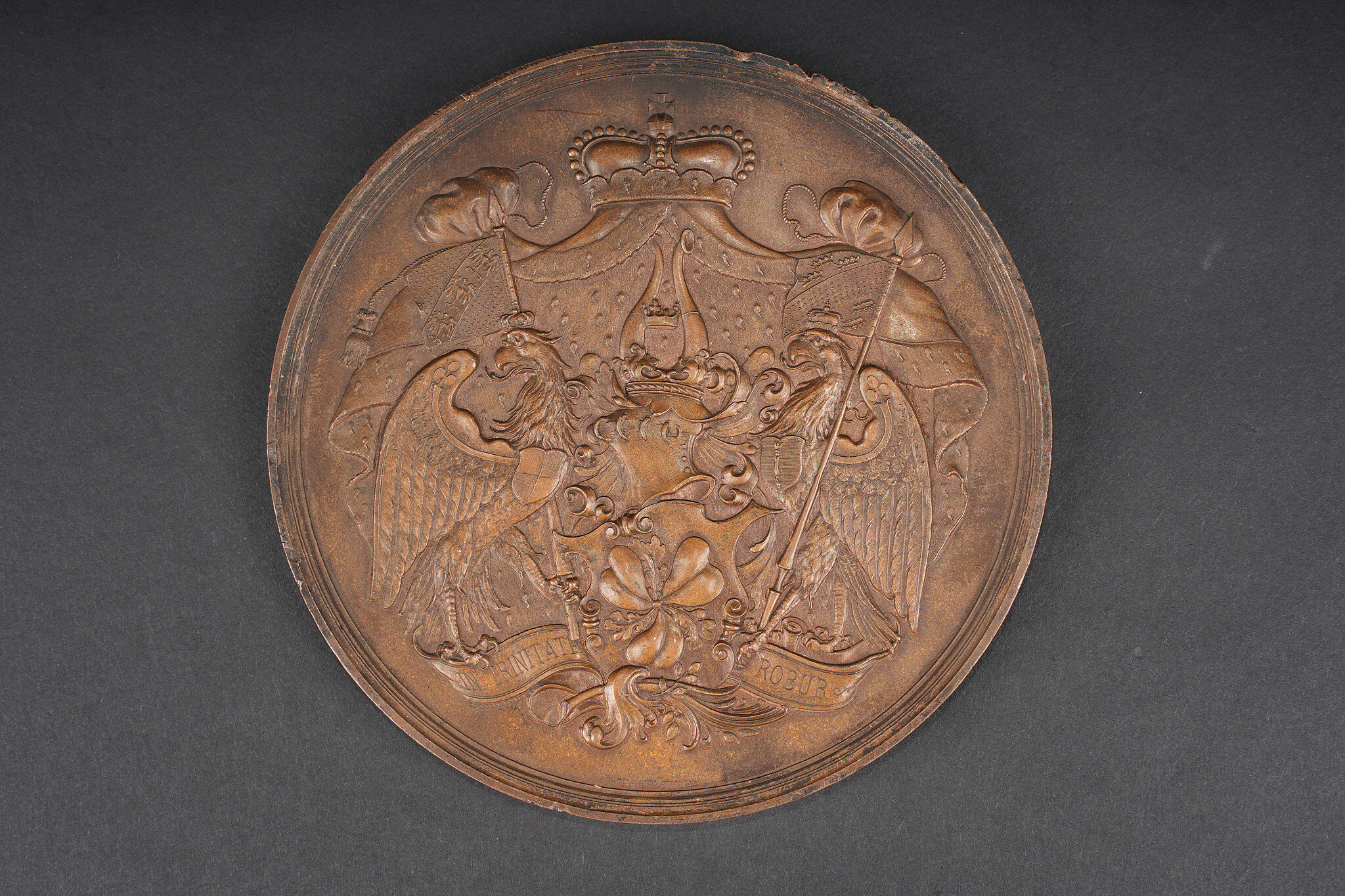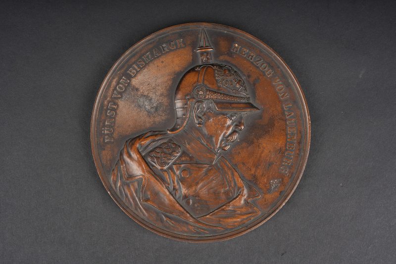 Grande médaille du Prince von Bismarck. Grande médaille de table en bronze ou cuivre patiné, à l’effigie de Bismarck, prince de Lauenburg. Diamètre environ 11,6 cm pour près de 515 grammes. Quelques coups sur la tranche. Large table medal of Otto von Bismarck in bronze or patinated copper, bearing his effigy as Prince of Lauenburg, diameter about 11.6 cm and weight nearly 515 grams. Minor edge knocks.