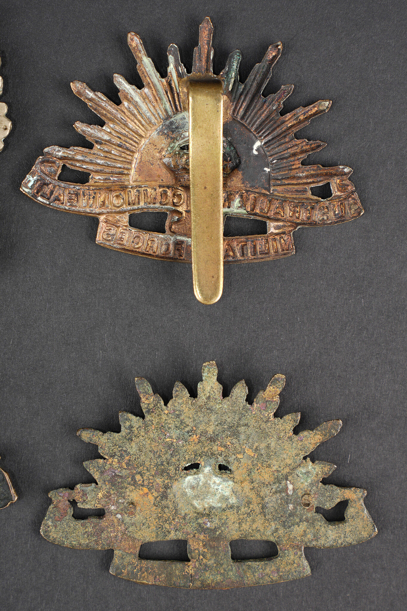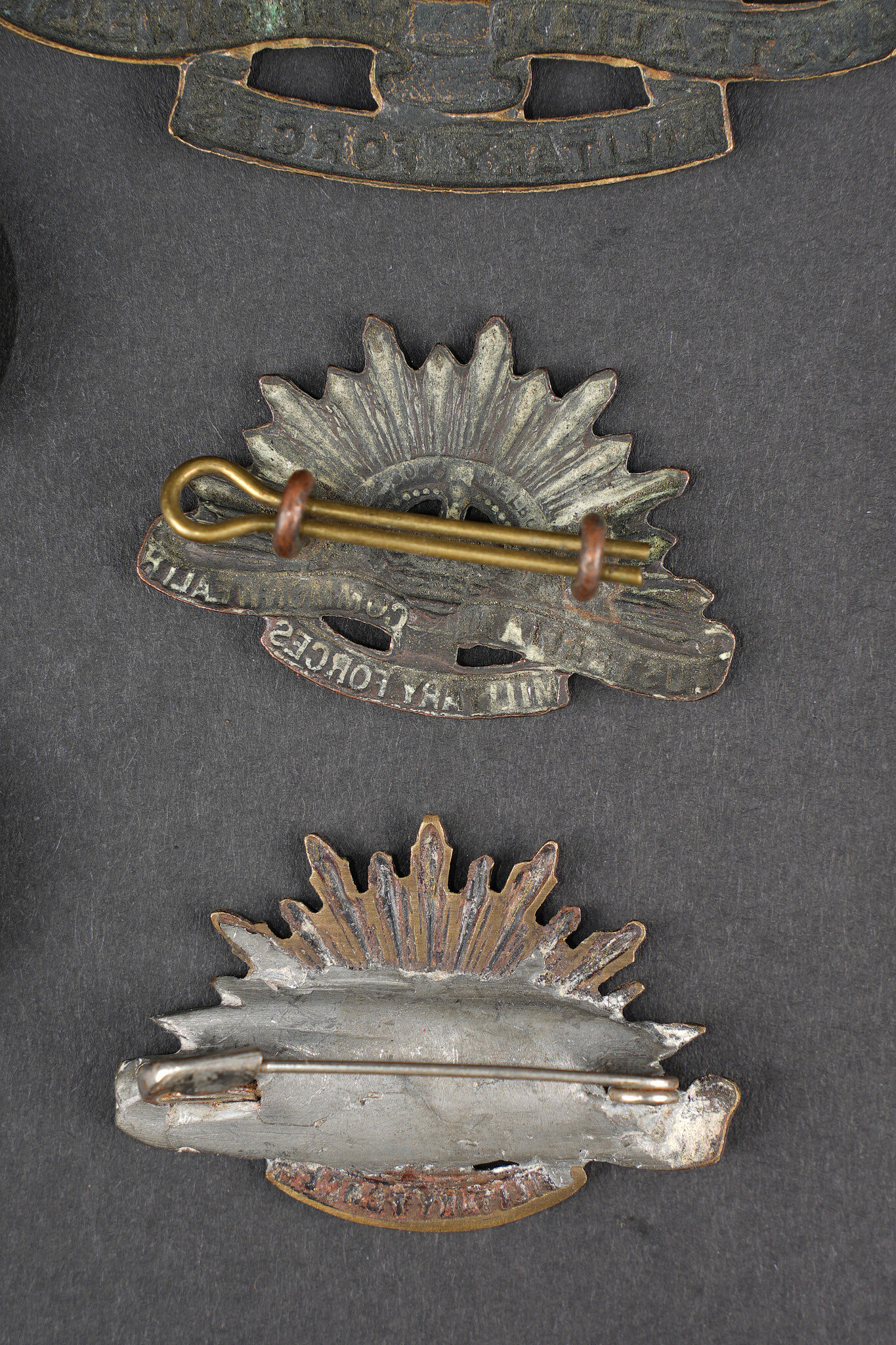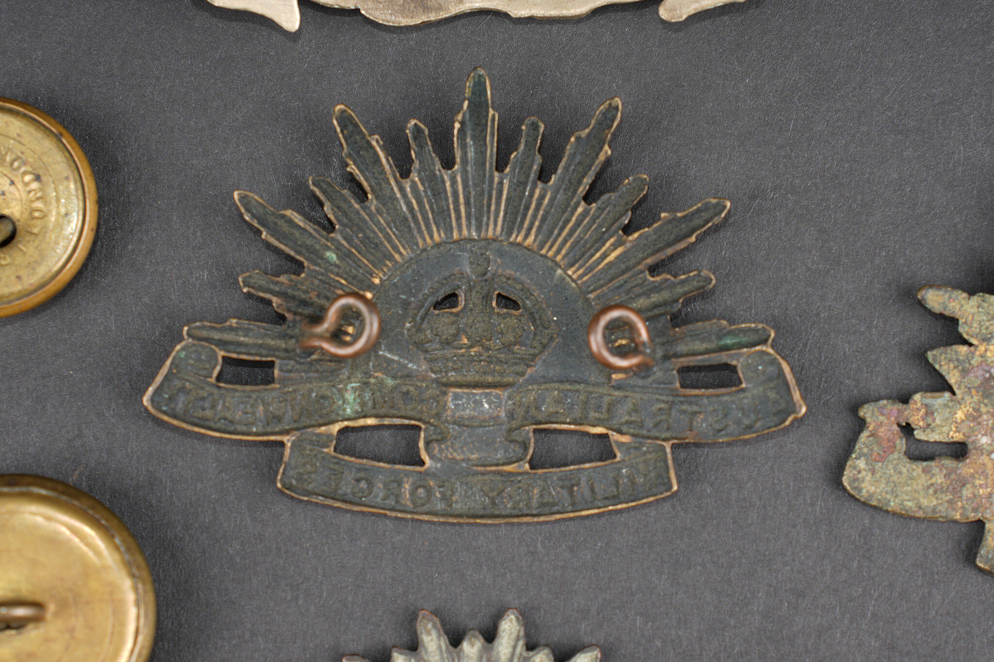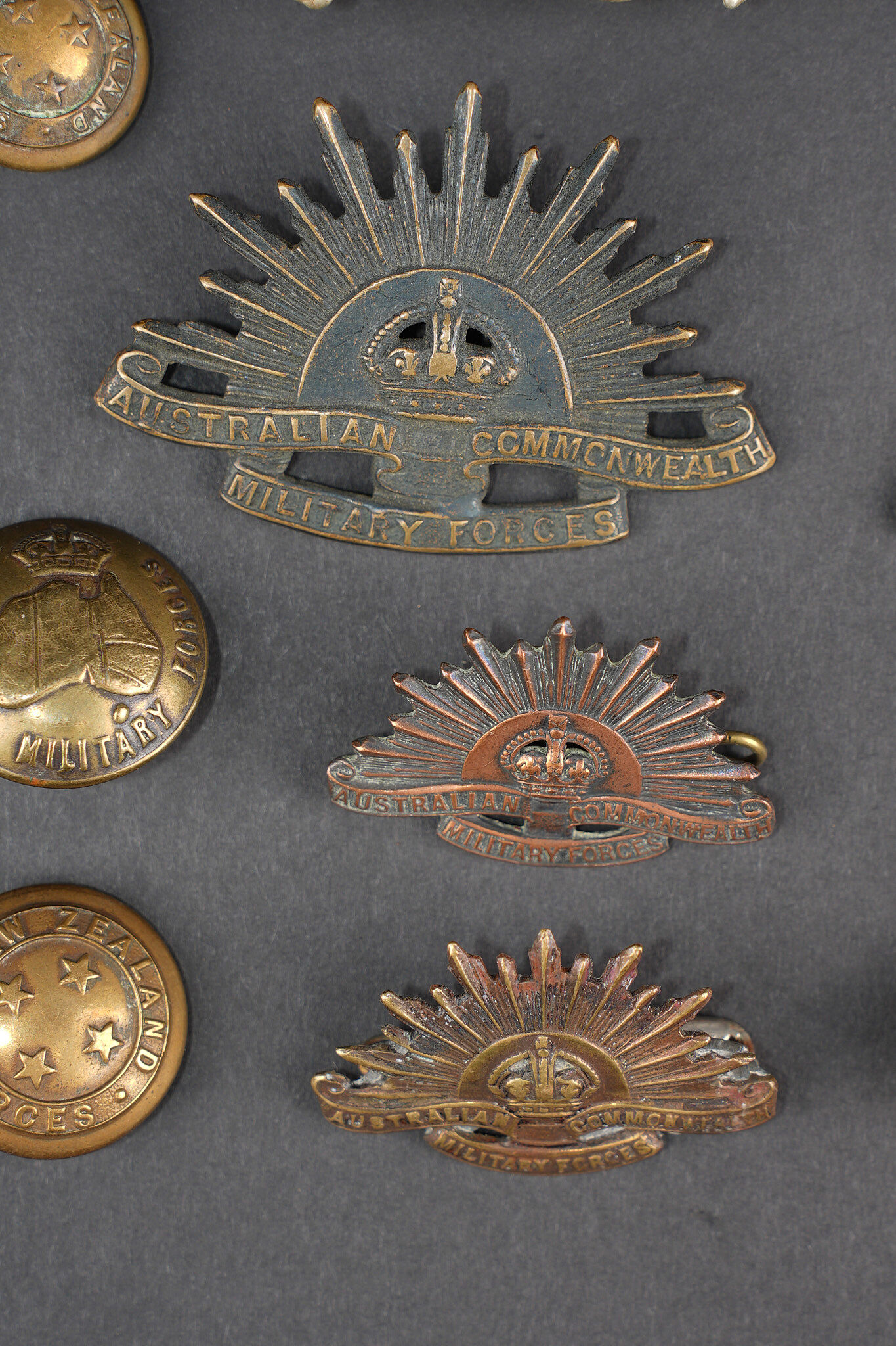 Lot d’insignes ANZAC ww1. 4 cap badges, 2 collars et un bouton australiens. 2 boutons New Zealand. On joint un cap badge du 93rd Sutherland Highlanders Cape of good hope, réalisé par surmoulage. Total 10 pièces. Usure, patine, certains avec attaches manquantes. Lot of ANZAC WWI insignia including four Australian cap badges, two collar badges and one button, together with two New Zealand buttons. Also included is a reproduction cap badge of the 93rd Sutherland Highlanders Cape of Good Hope made by recasting. Total of ten pieces, with wear, patina and some missing fasteners.