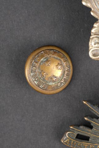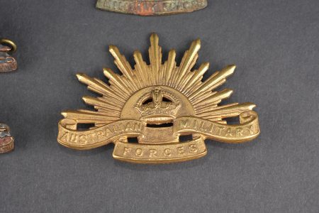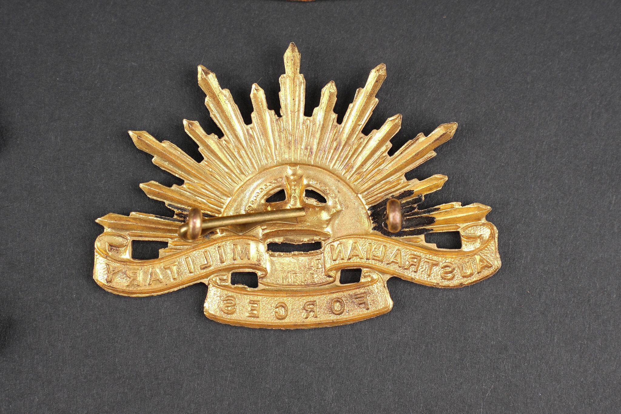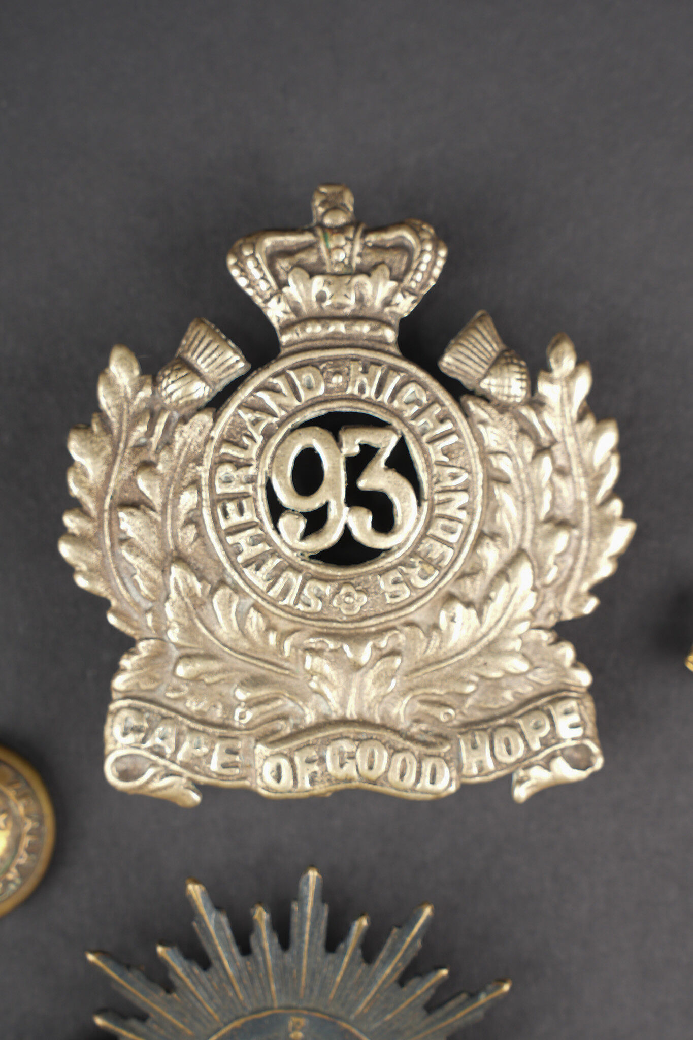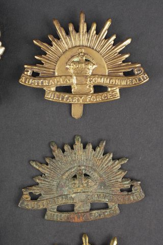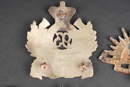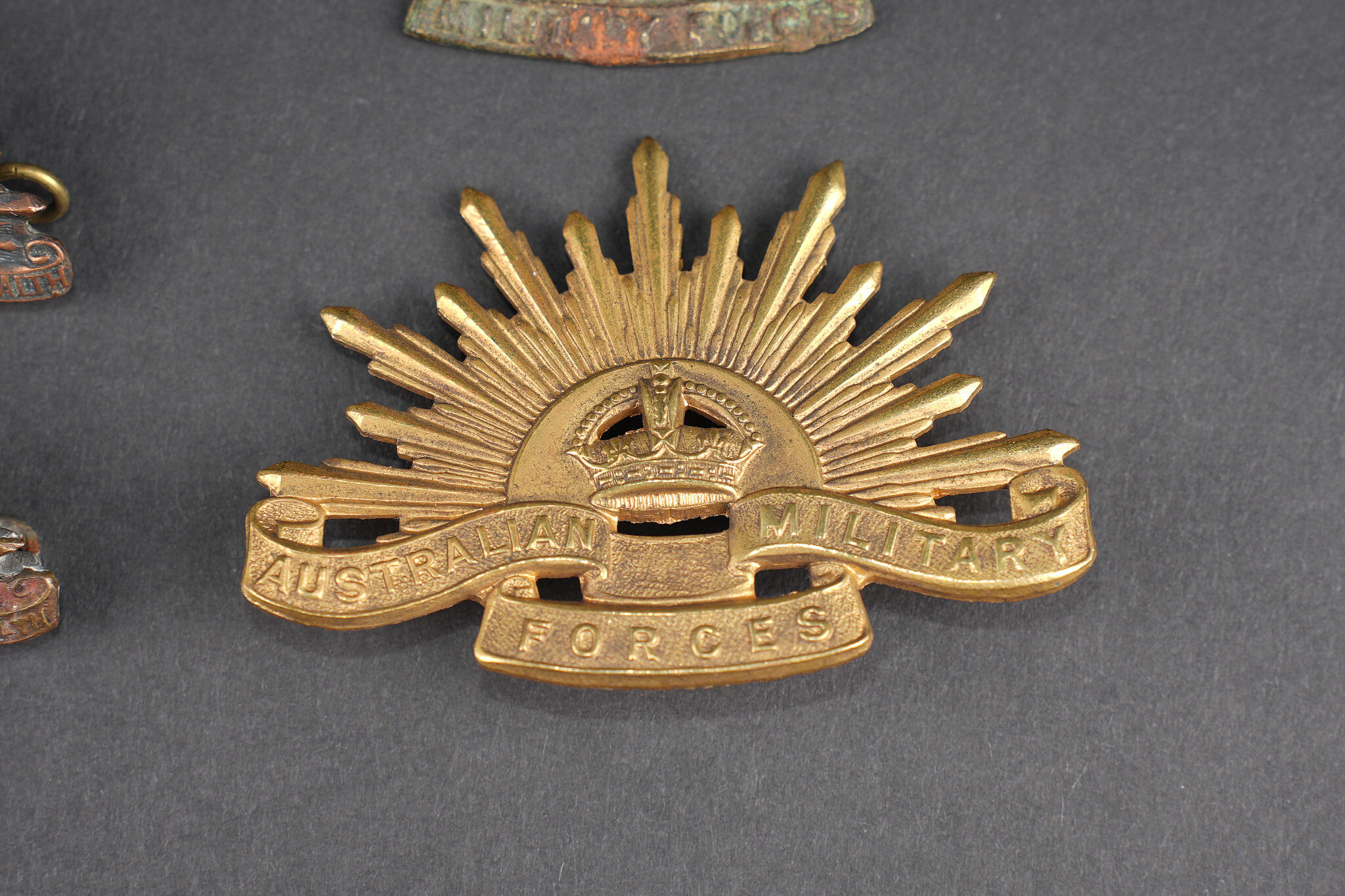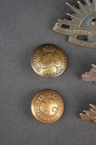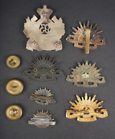 Lot d’insignes ANZAC ww1. 4 cap badges, 2 collars et un bouton australiens. 2 boutons New Zealand. On joint un cap badge du 93rd Sutherland Highlanders Cape of good hope, réalisé par surmoulage. Total 10 pièces. Usure, patine, certains avec attaches manquantes. Lot of ANZAC WWI insignia including four Australian cap badges, two collar badges and one button, together with two New Zealand buttons. Also included is a reproduction cap badge of the 93rd Sutherland Highlanders Cape of Good Hope made by recasting. Total of ten pieces, with wear, patina and some missing fasteners.