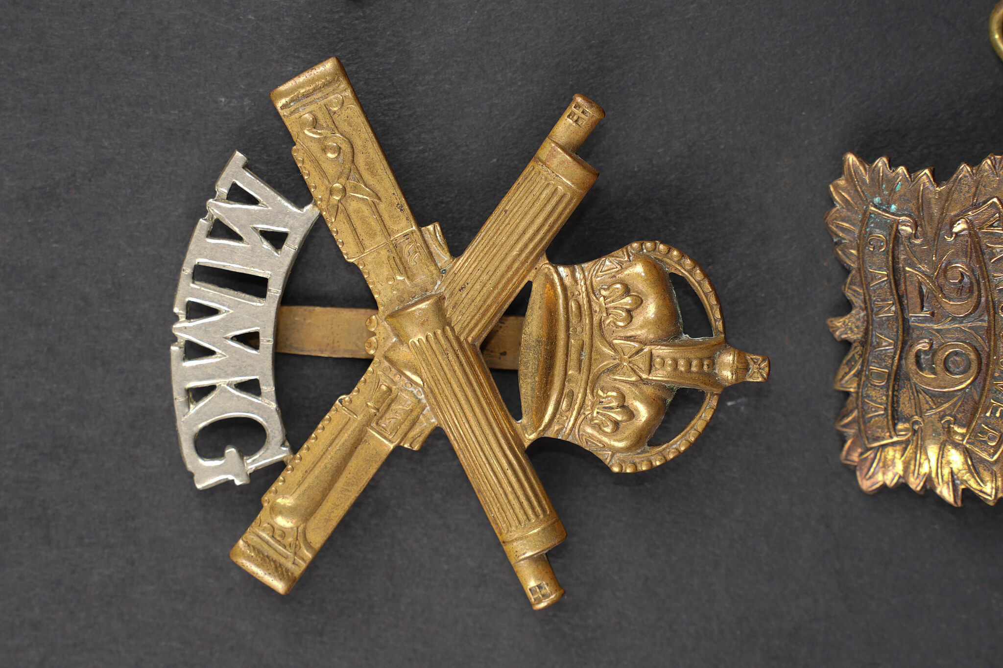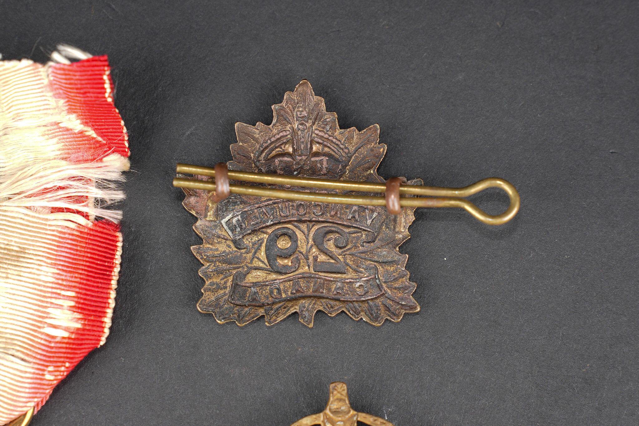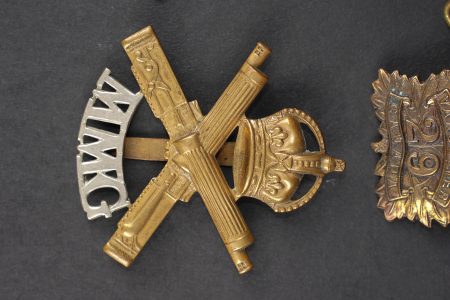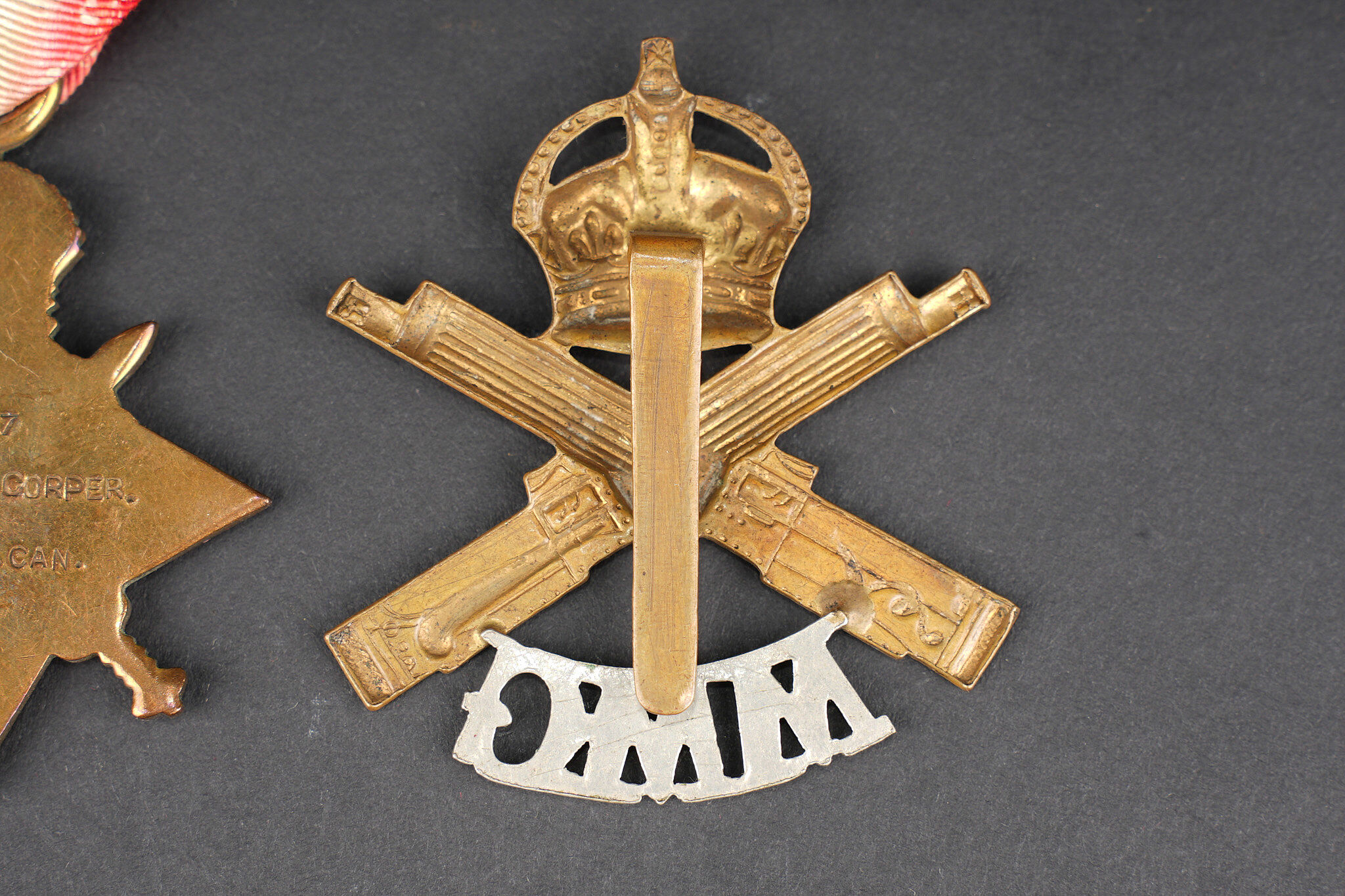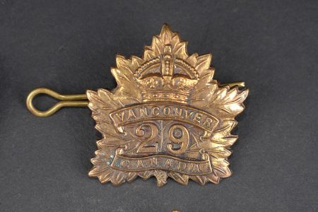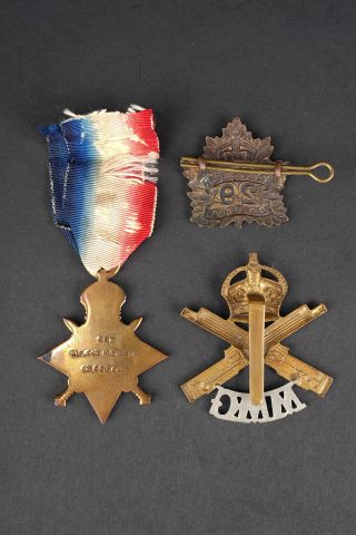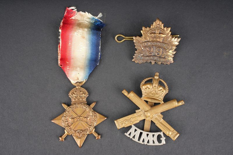 Canada ww1 médaille et insignes. Une 1914-15 Star attribuée à l’Acting Staff Serjeant Corper ASC Canadian Forestry Corps, un cap badge du 29th Battalion Tobin’s Tigers de Vancouver, et un cap badge du canadian Motor Machine Gun bi-métallique. Bon état. Canadian WWI medal and insignia including a 1914–15 Star awarded to Acting Staff Serjeant Corper of the Canadian Forestry Corps, one cap badge of the 29th Battalion CEF, and one bi-metal cap badge of the Canadian Motor Machine Gun unit. Good condition.